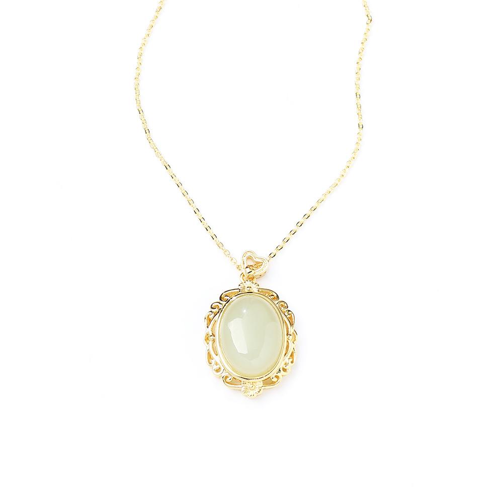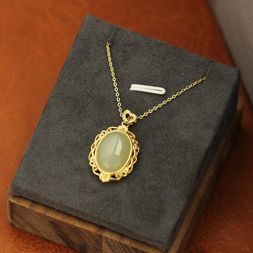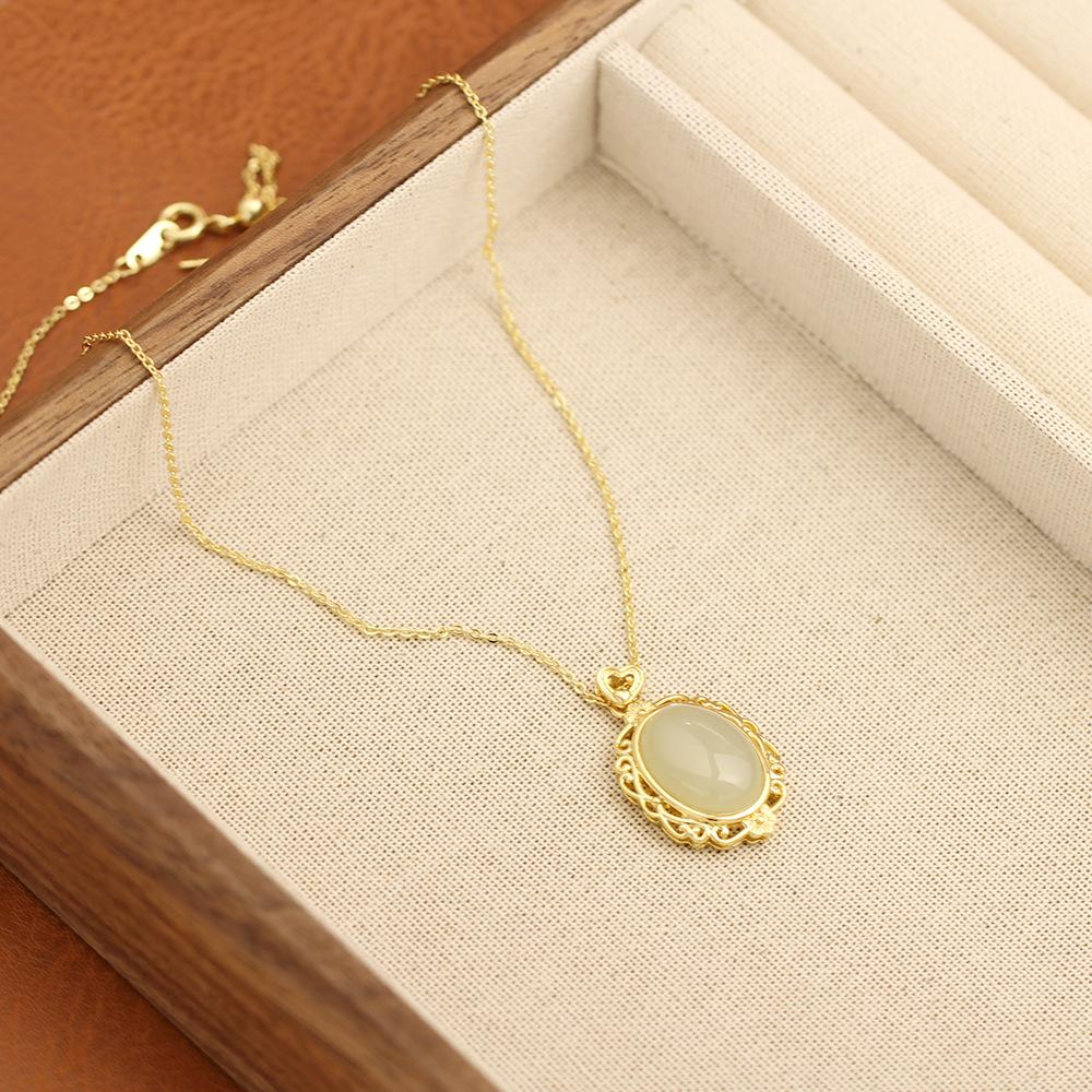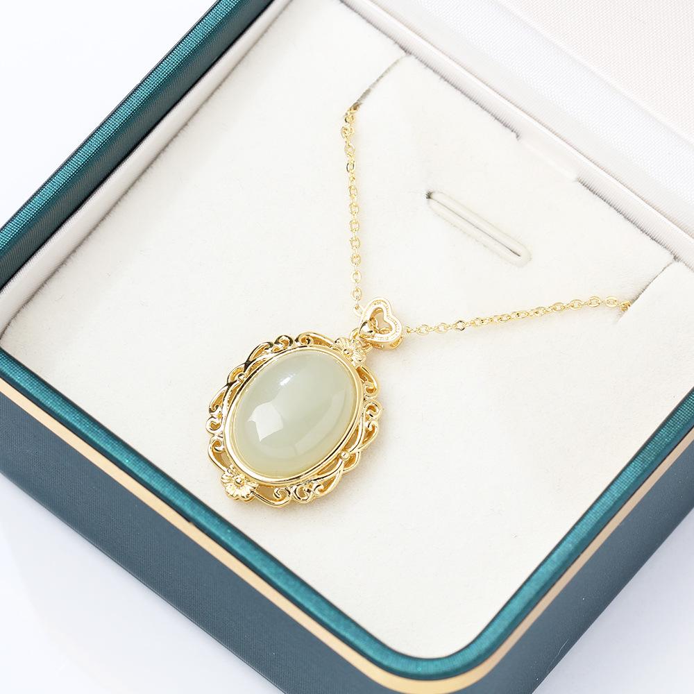 Nuevo colgante de jade hetiano de imitación ovalado con diseño hueco de estilo palacio chino, cadena de clavícula sencilla chapada en oro, collar para mujer
