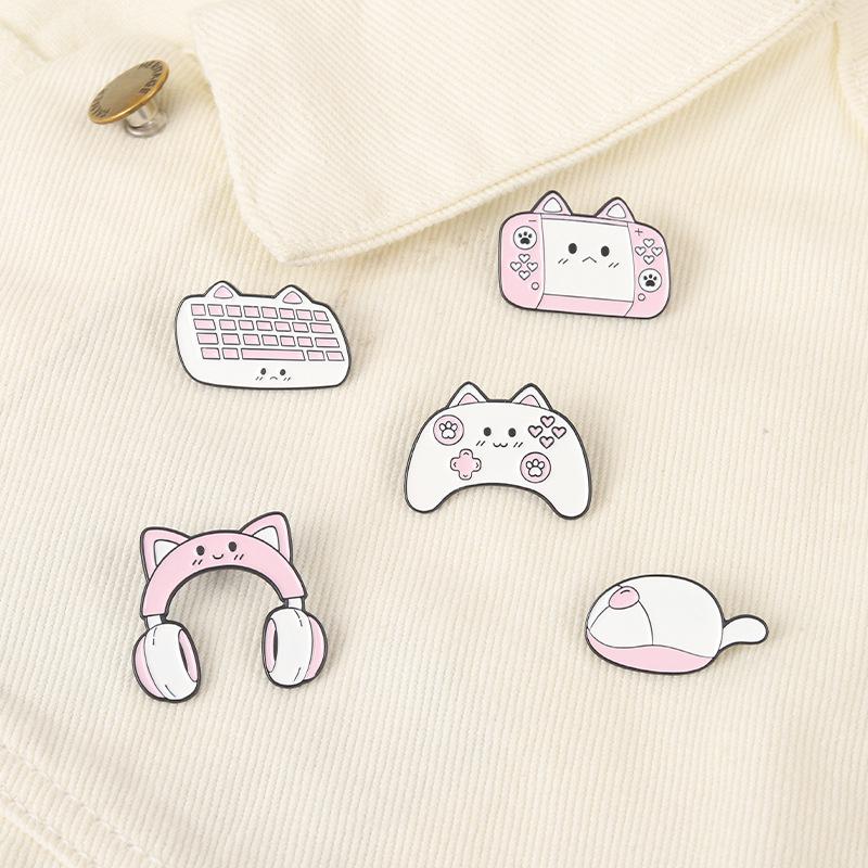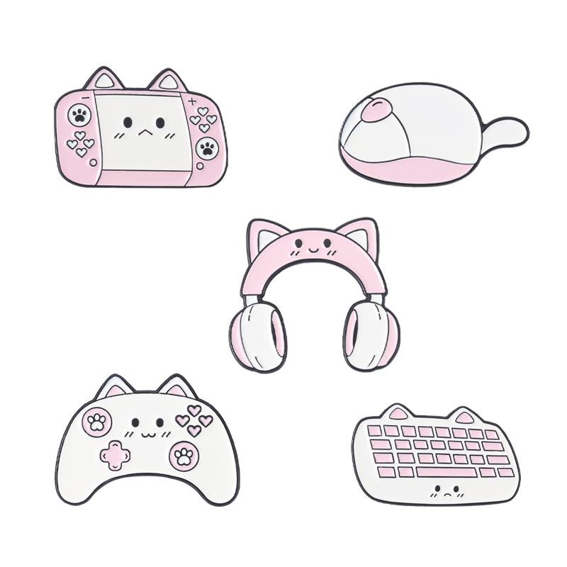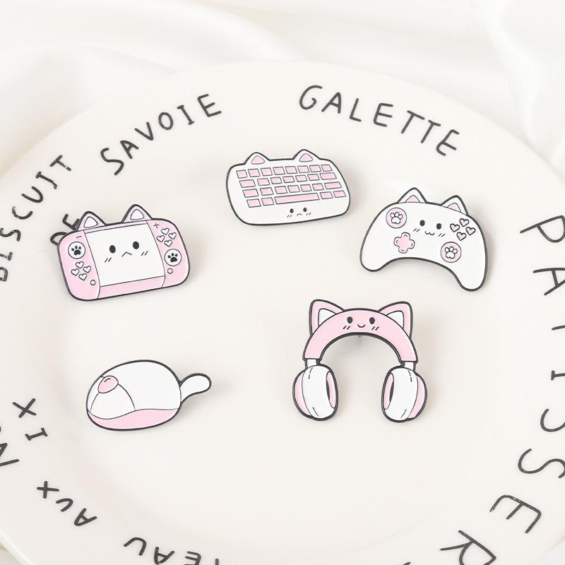 Broche de aleación de la serie Nuevo Juego Europeo y Americano, caricatura linda, gato rosa lindo, modelado de auriculares, modelado de teclado, insignia