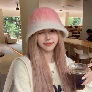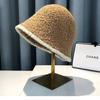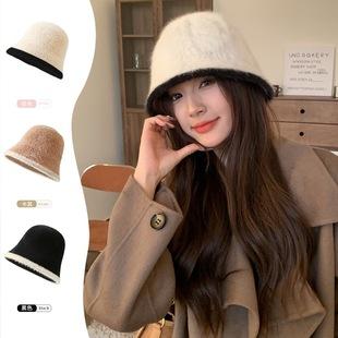 Sombrero de pescador cálido de felpa estilo coreano para mujer, nuevo estilo, rojo de internet, estilo japonés, contraste de color, ala de piel, sombrero de cubo de moda a prueba de viento