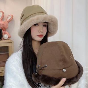 Sombrero de cubo de invierno de piel de conejo pequeño para mujer, felpa cálido, protección para las orejas, sombrero de cuenca con cara pequeña, estilo coreano, color sólido, sombrero a prueba de frío, moderno