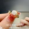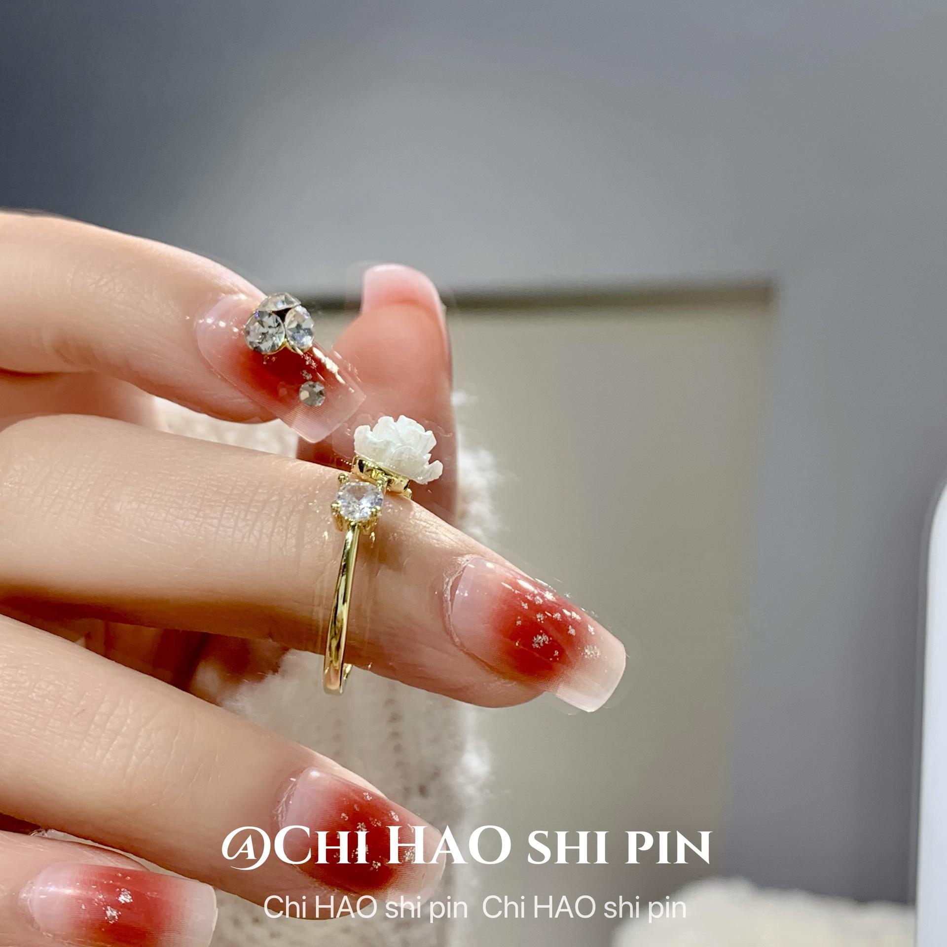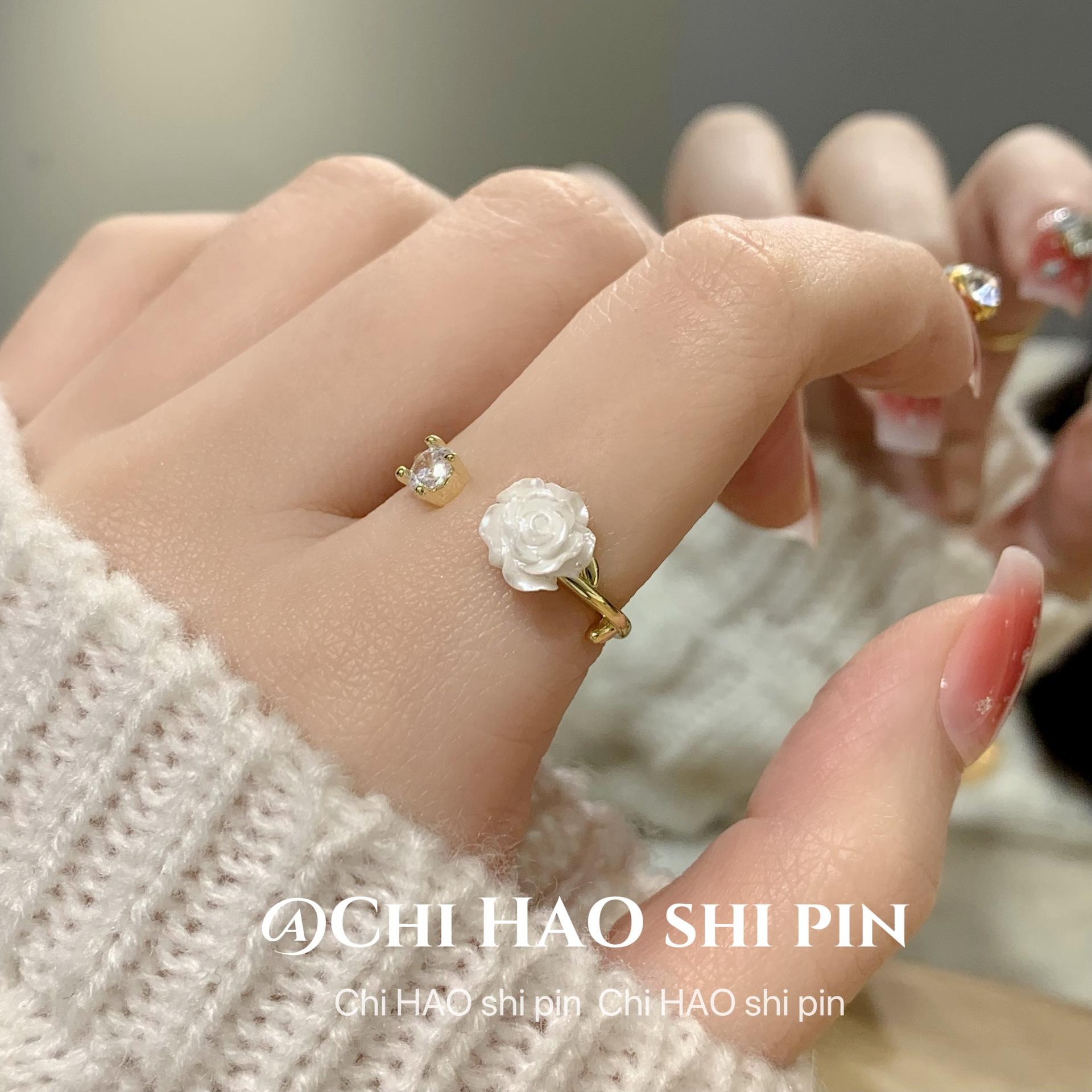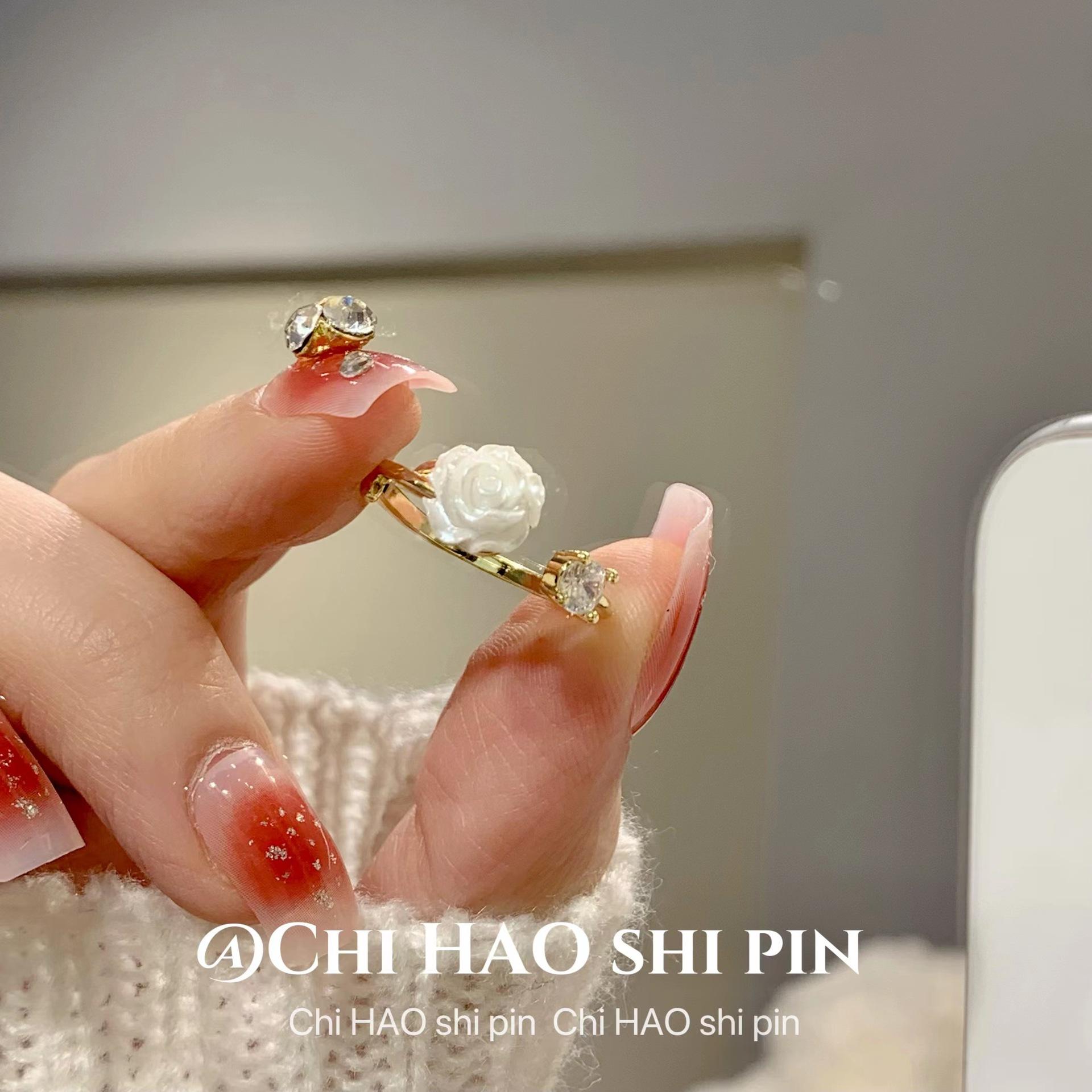 Anillo de lujo con forma de camelia para el dedo índice, estilo coreano, para mujer, diseño de nicho, con rosa blanca, dulce.