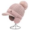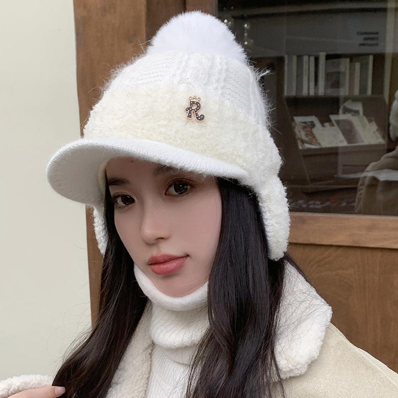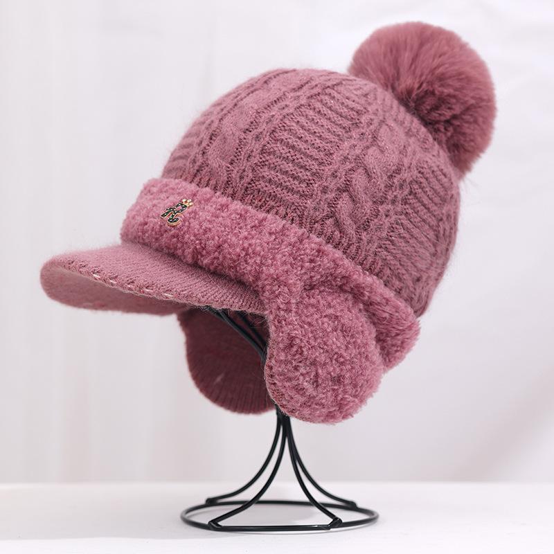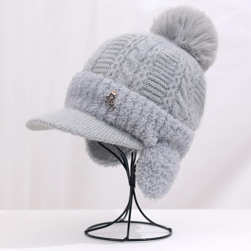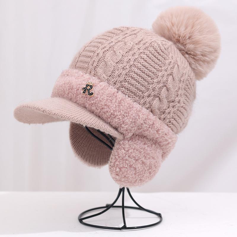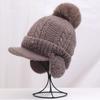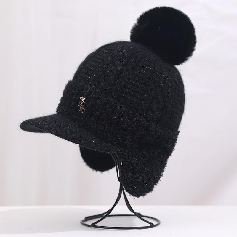 Gorro de lana cálido y resistente al frío de estilo coreano para otoño e invierno con bola de pelo, gorro de punto de color sólido, orejeras de moda para mujer, venta al por mayor