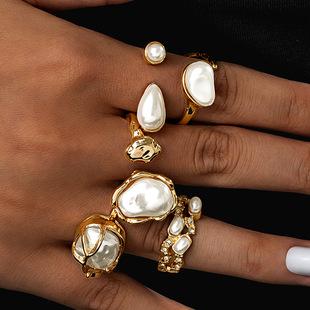 Anillo de moda de aleación de tendencia transfronteriza de Amazon, superventas, con incrustaciones de perla de imitación ABS de forma especial, juego de anillos de varias piezas para mujer
