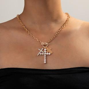 Amazon moda transfronteriza personalidad estilo simple aleación cruz incrustada pedrería colgante perla de imitación collar cadena OT para mujer