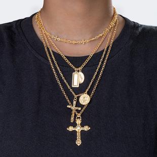 Collar multicapa de moda europea y americana de venta caliente transfronteriza, con colgante de aleación en forma de cruz rectangular redonda apilable de personalidad