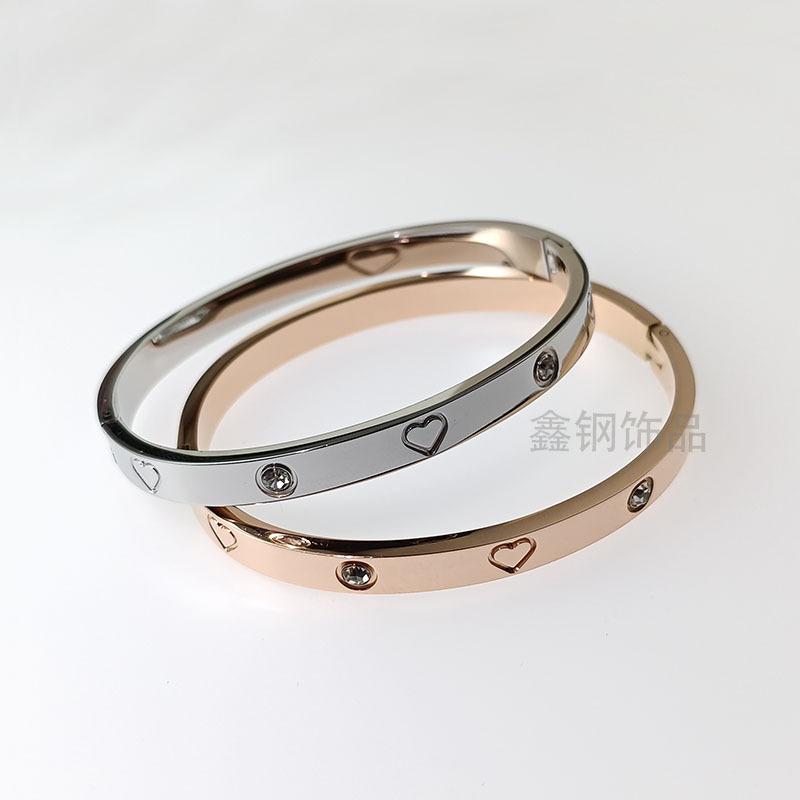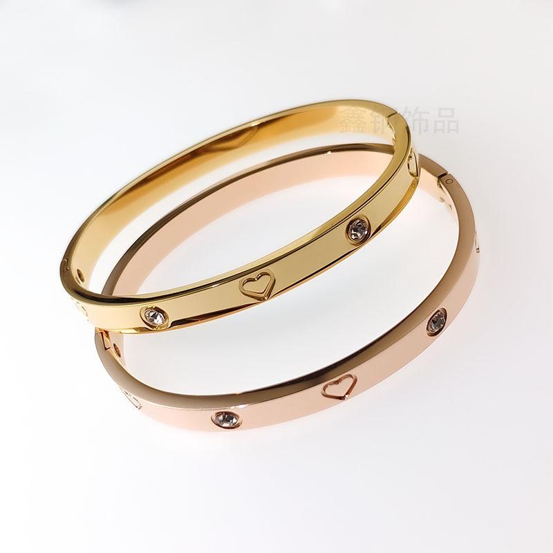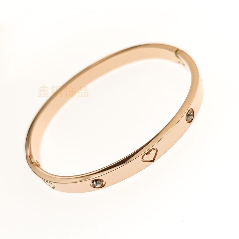 Pulsera de acero inoxidable con forma de corazón y diamantes, oro rosa de 18 quilates, popular para mujer, pulsera de pareja de acero de titanio con diamantes de imitación en forma de corazón que no se desvanece