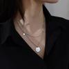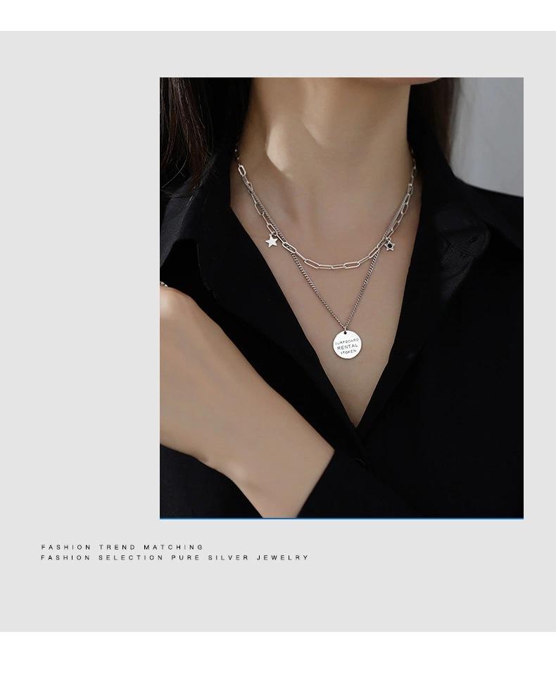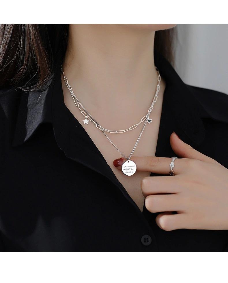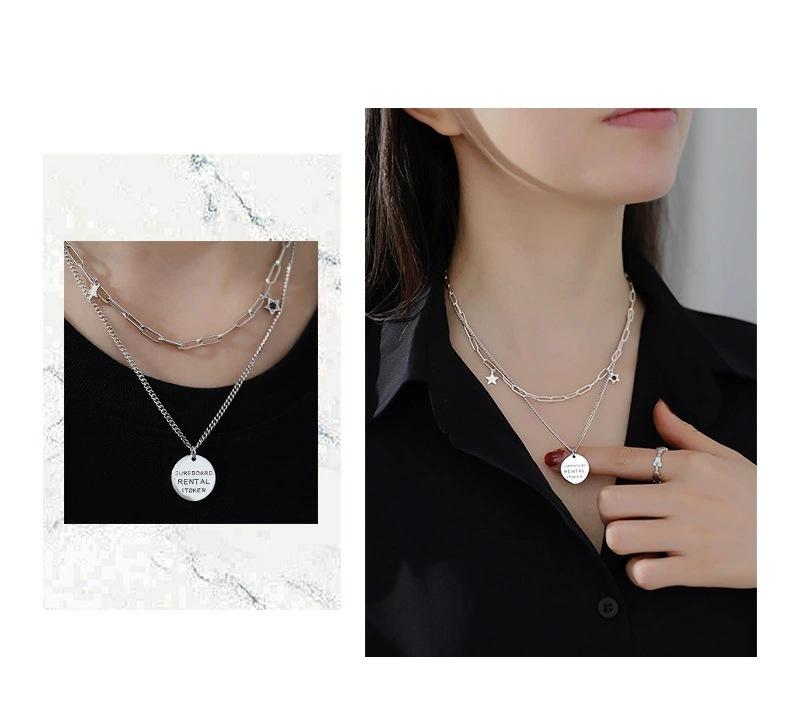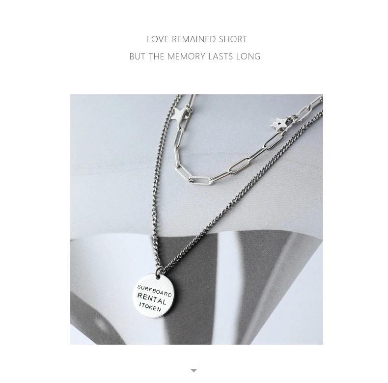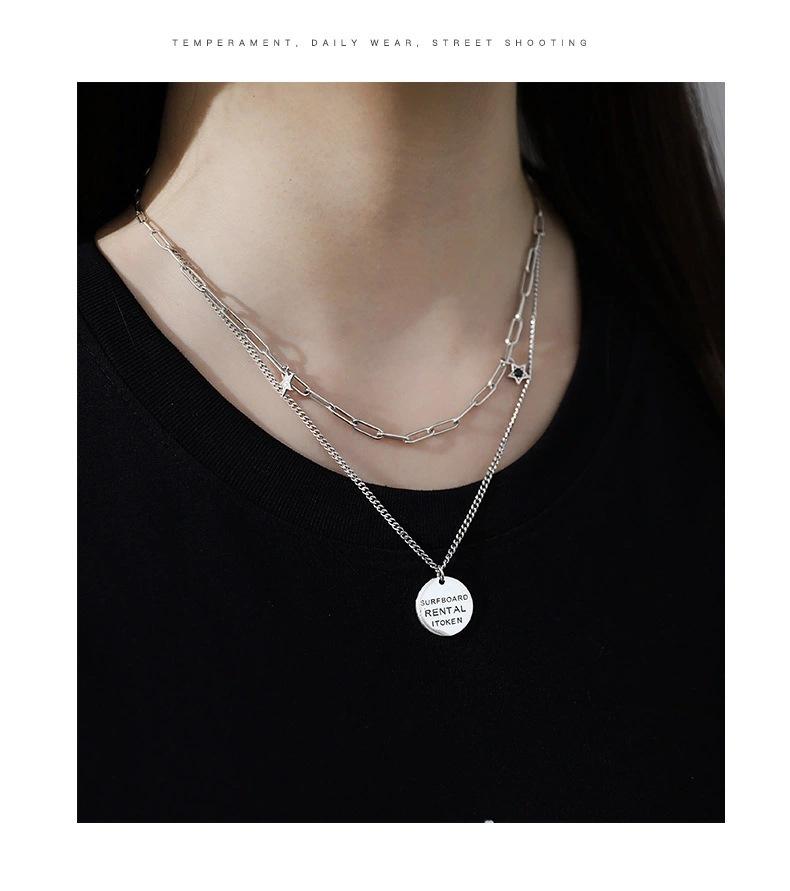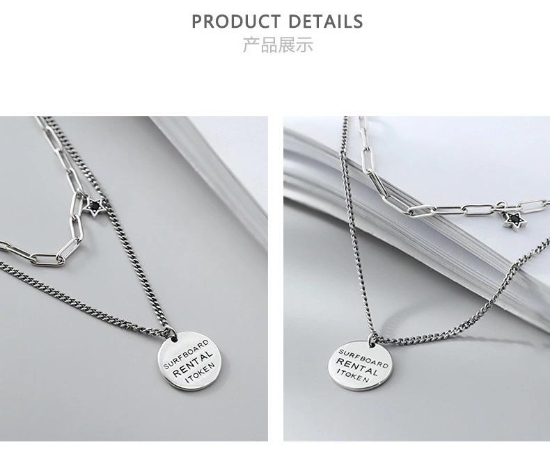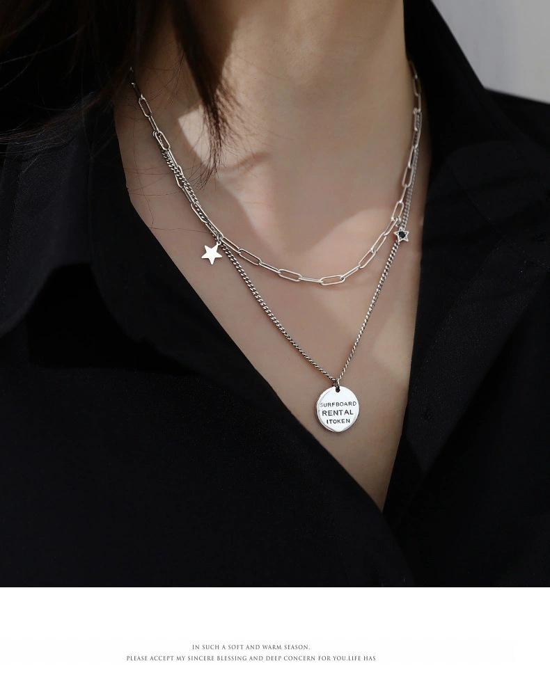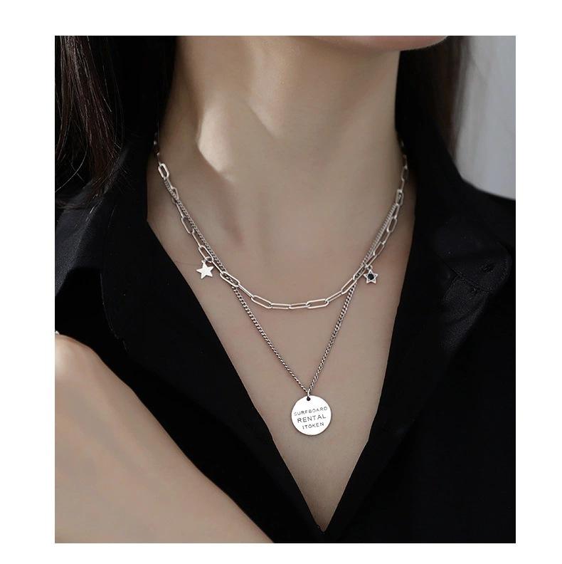 Collar vintage de plata Yintai para mujer, cadena de doble capa con letras redondas y estrellas de circonita, estilo hip hop, a la moda.