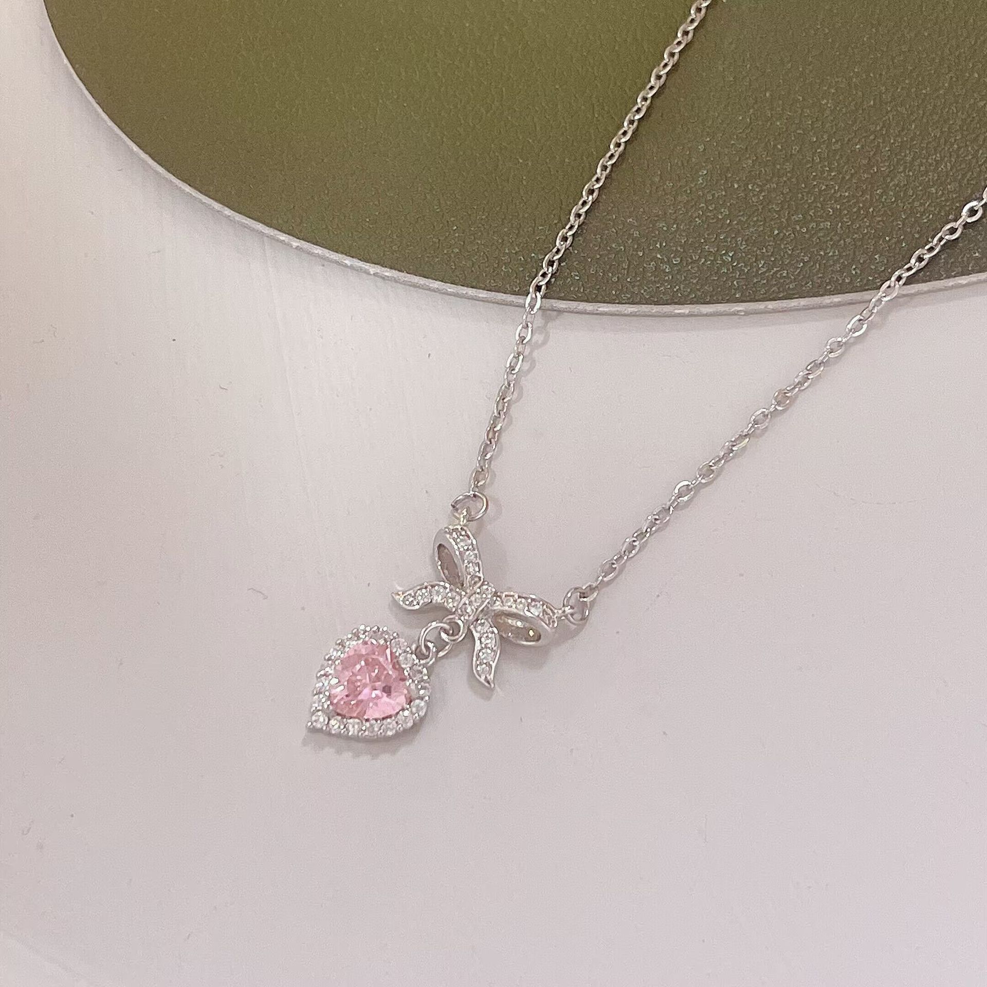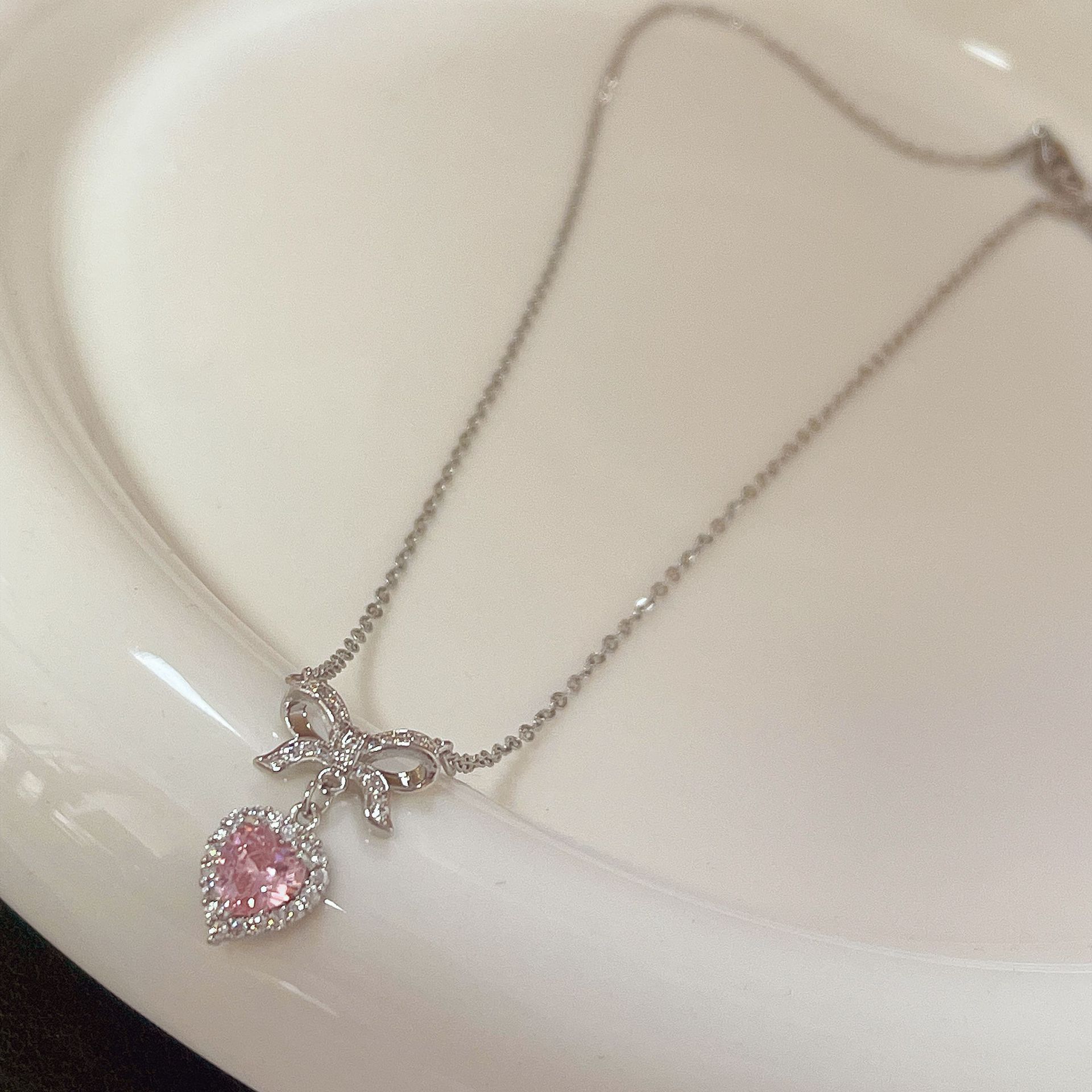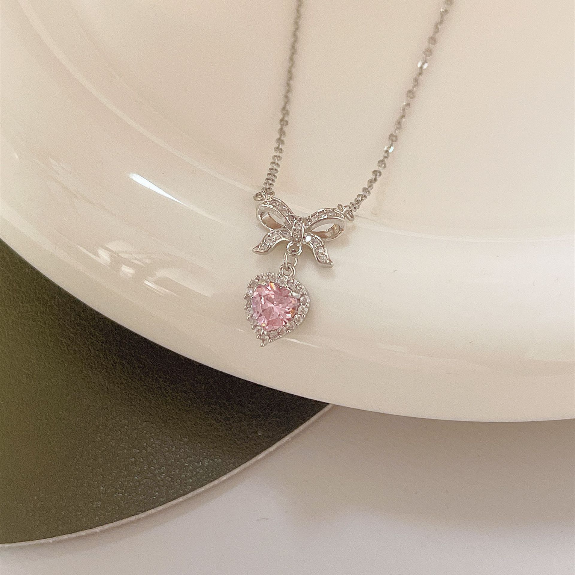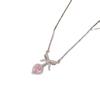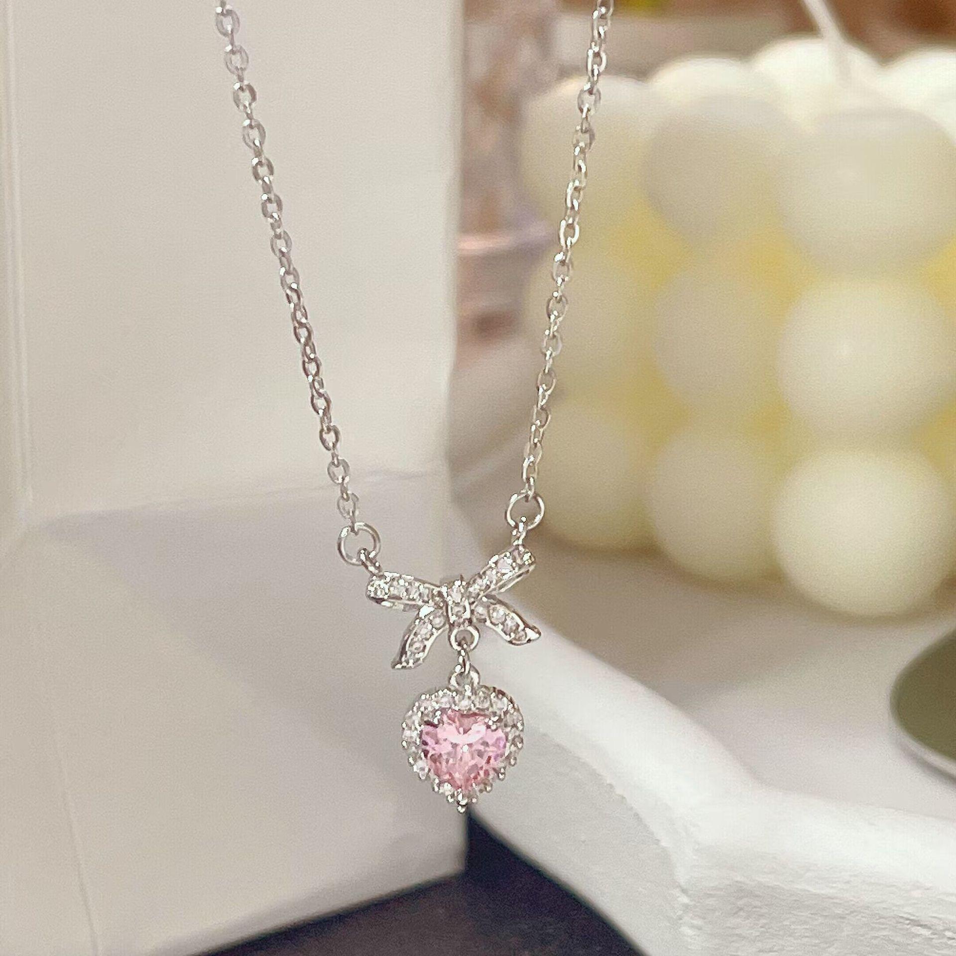 Collar elegante y exquisito de alta calidad con forma de lazo con microincrustaciones de diamantes rosas para mujer, estilo dulce, fresco y sexy, con cadena de clavícula.