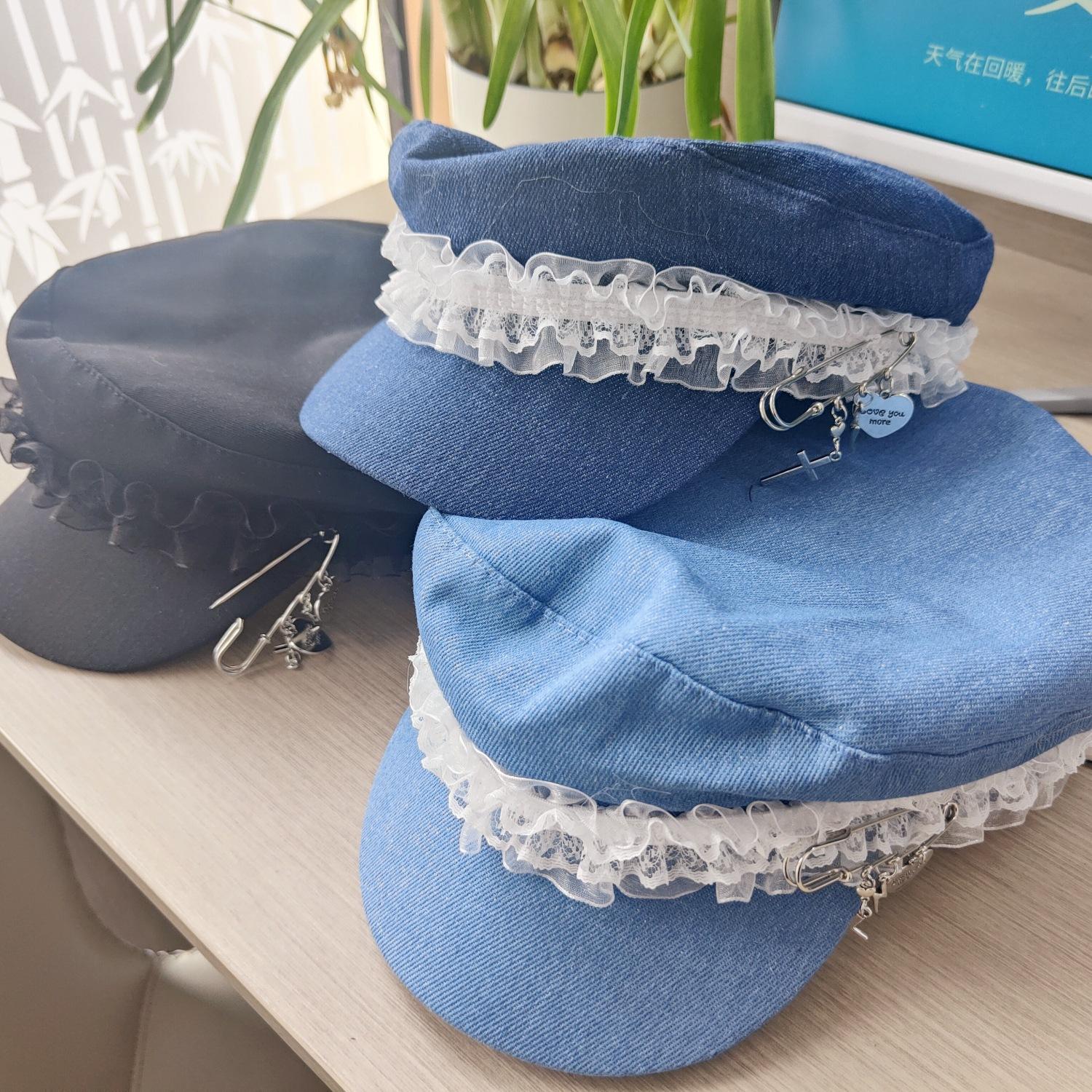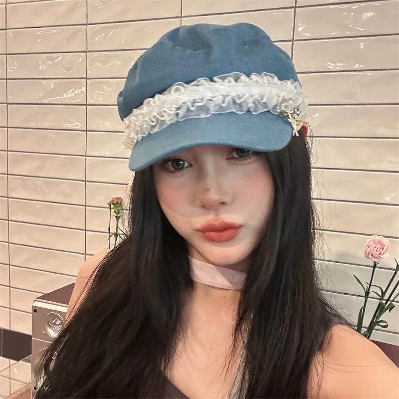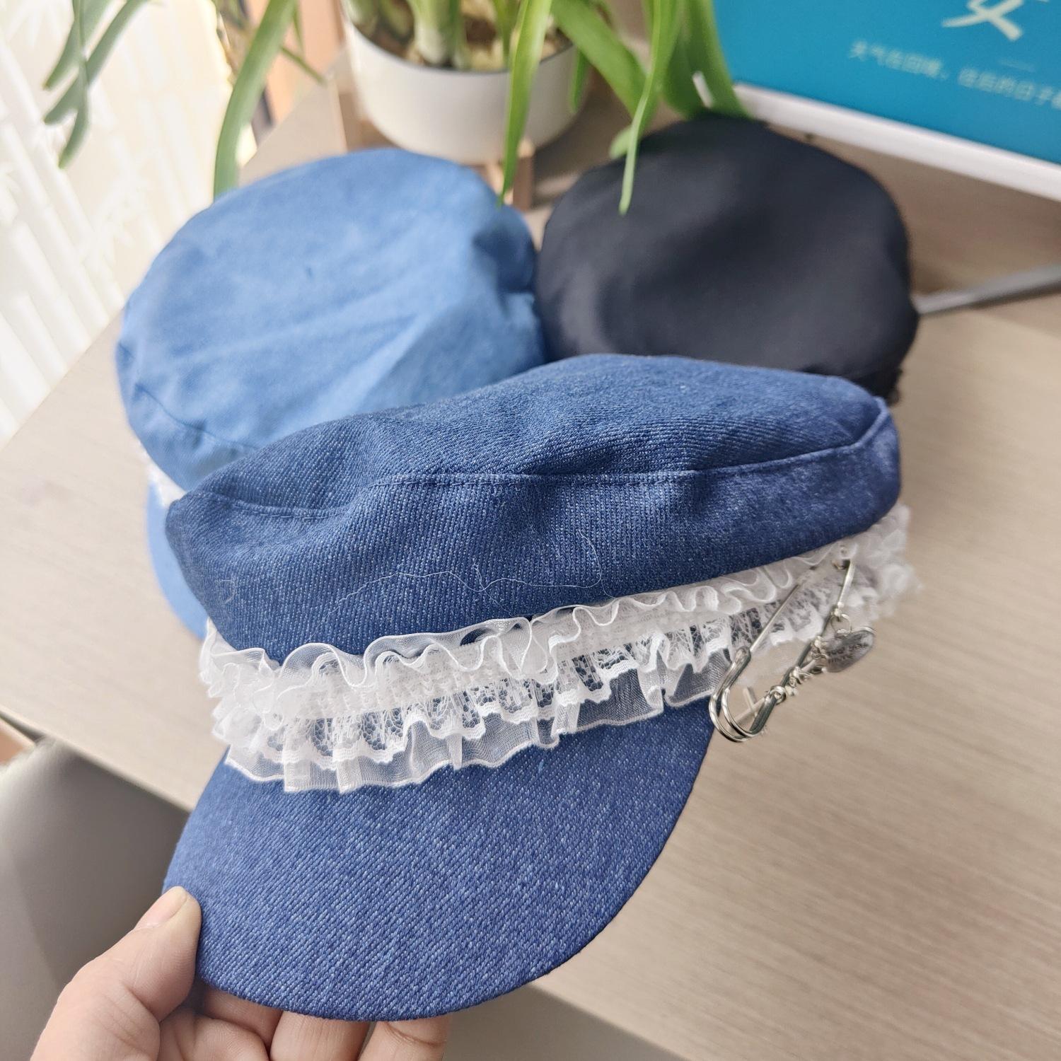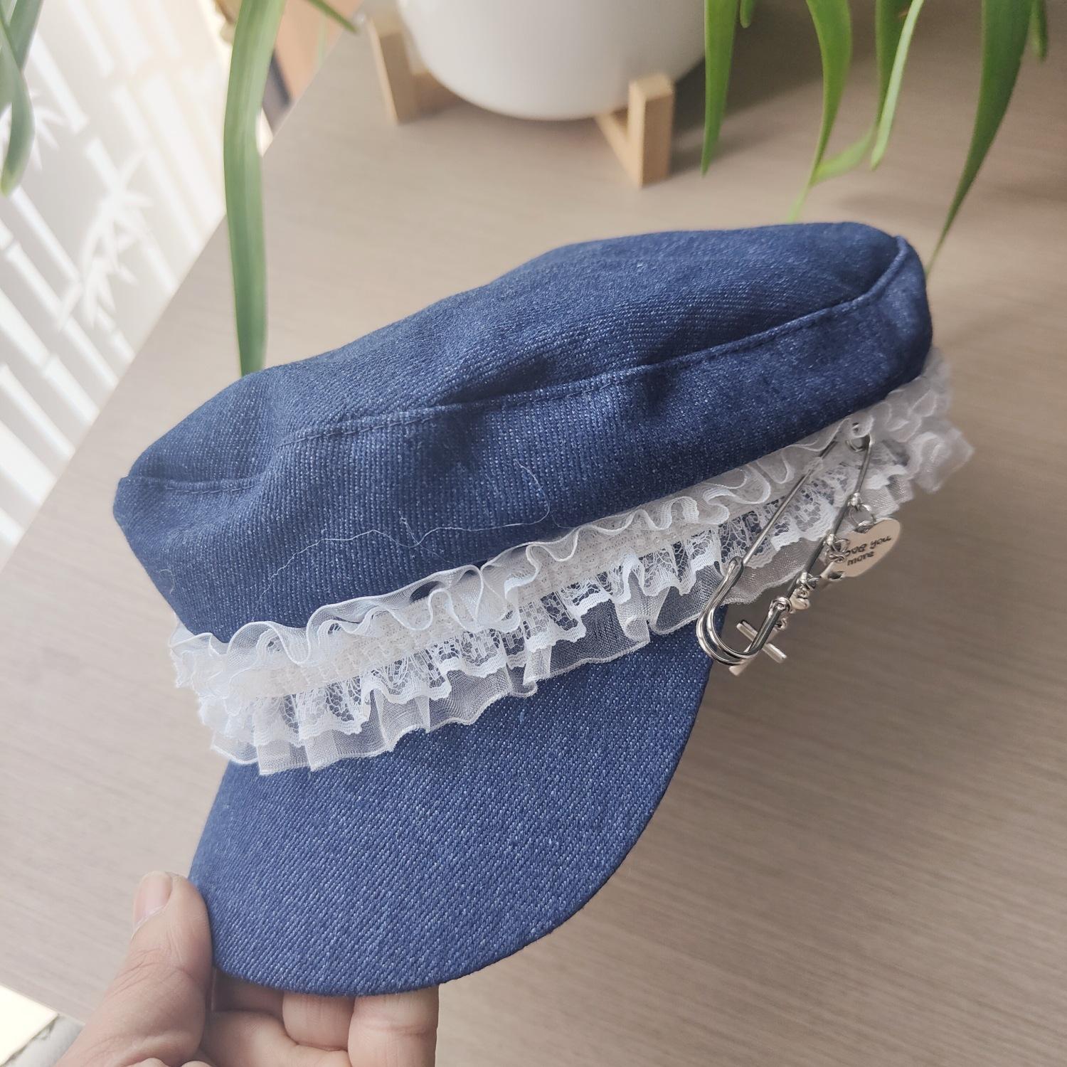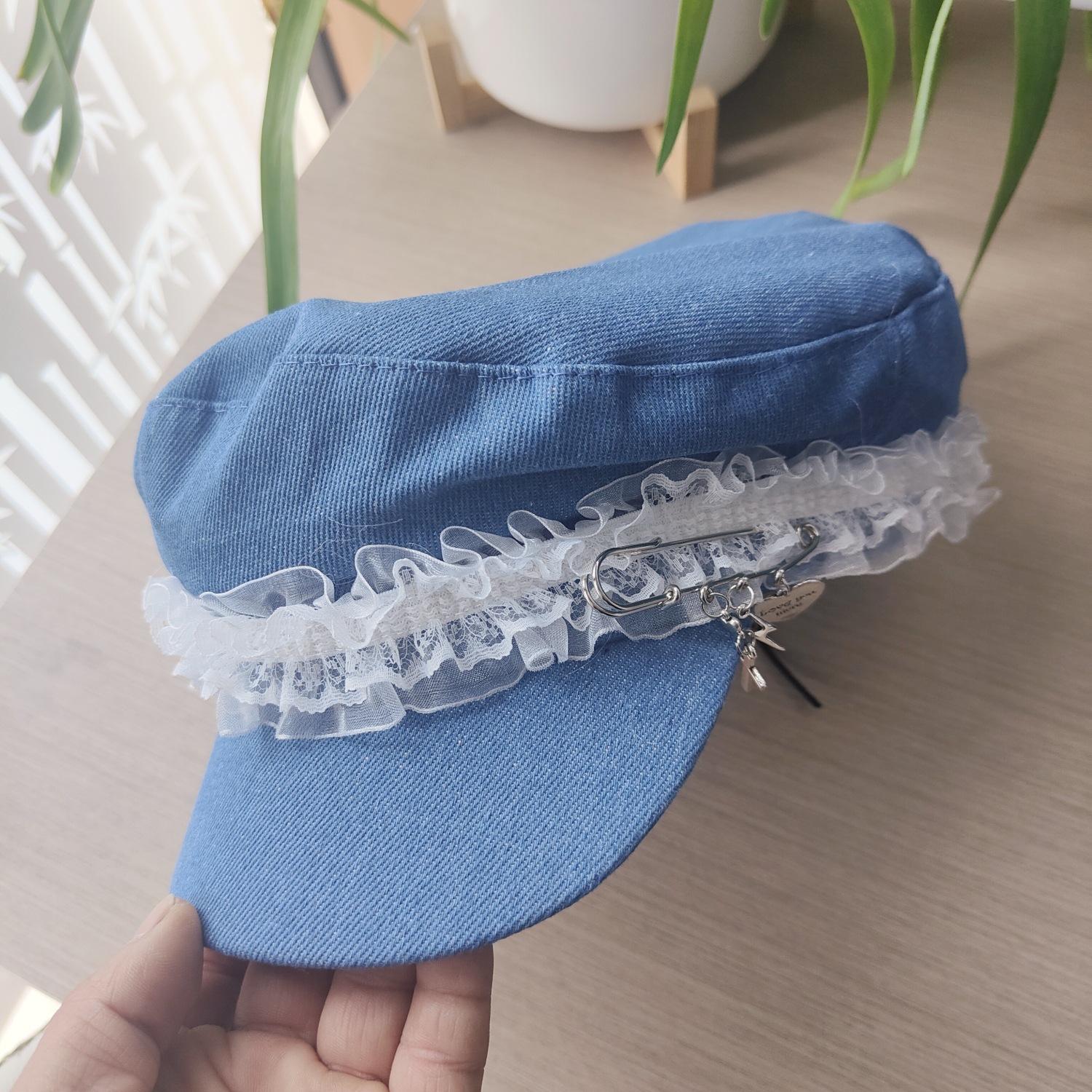 Ins Pin de Encaje de Celebridad Cibernética Sombrero Militar de Mezclilla Dulce de Nicho Cara Dulce Pequeño Sombrero Octogonal de Calle Sombrero de Pintor para Mujeres