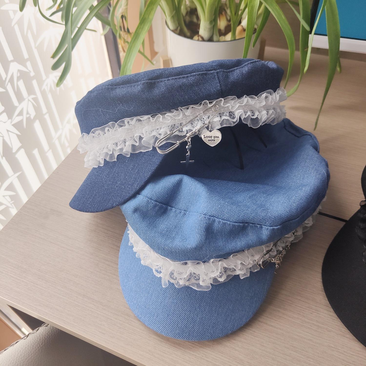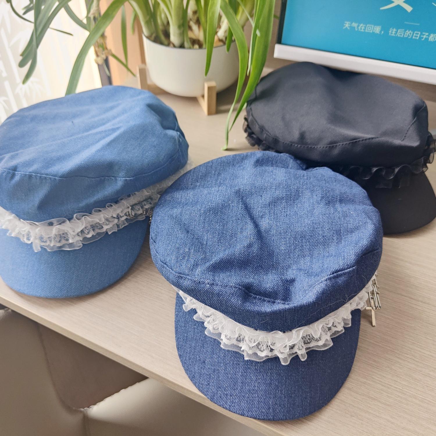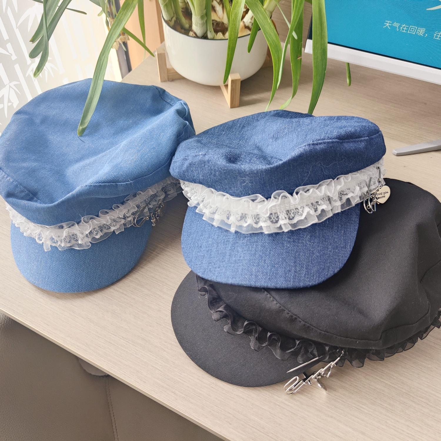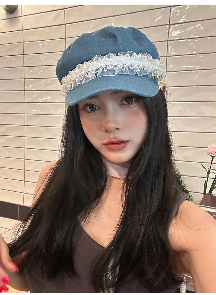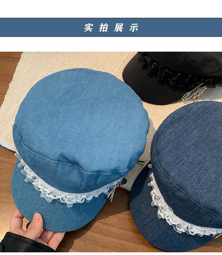 Ins Pin de Encaje de Celebridad Cibernética Sombrero Militar de Mezclilla Dulce de Nicho Cara Dulce Pequeño Sombrero Octogonal de Calle Sombrero de Pintor para Mujeres