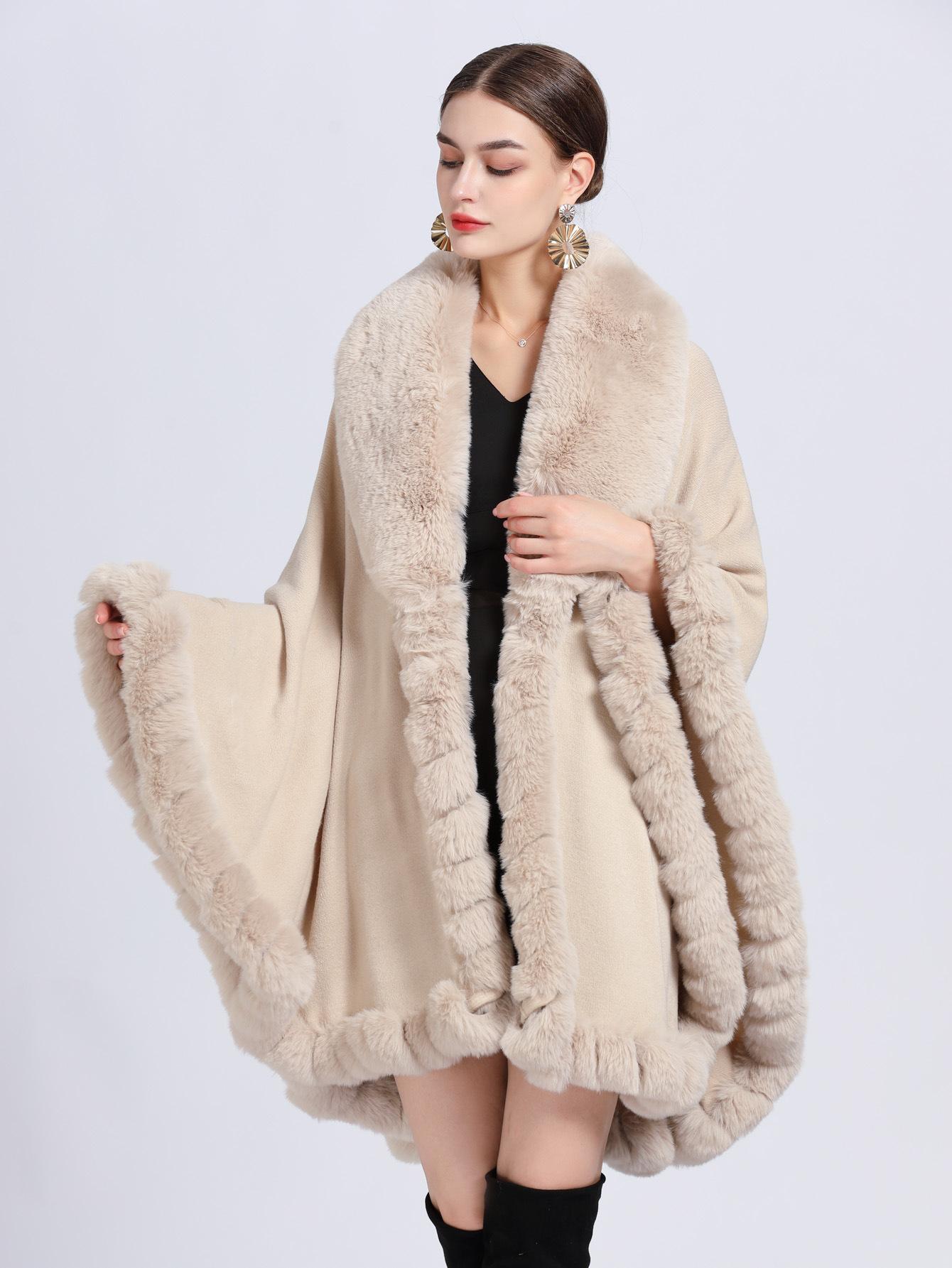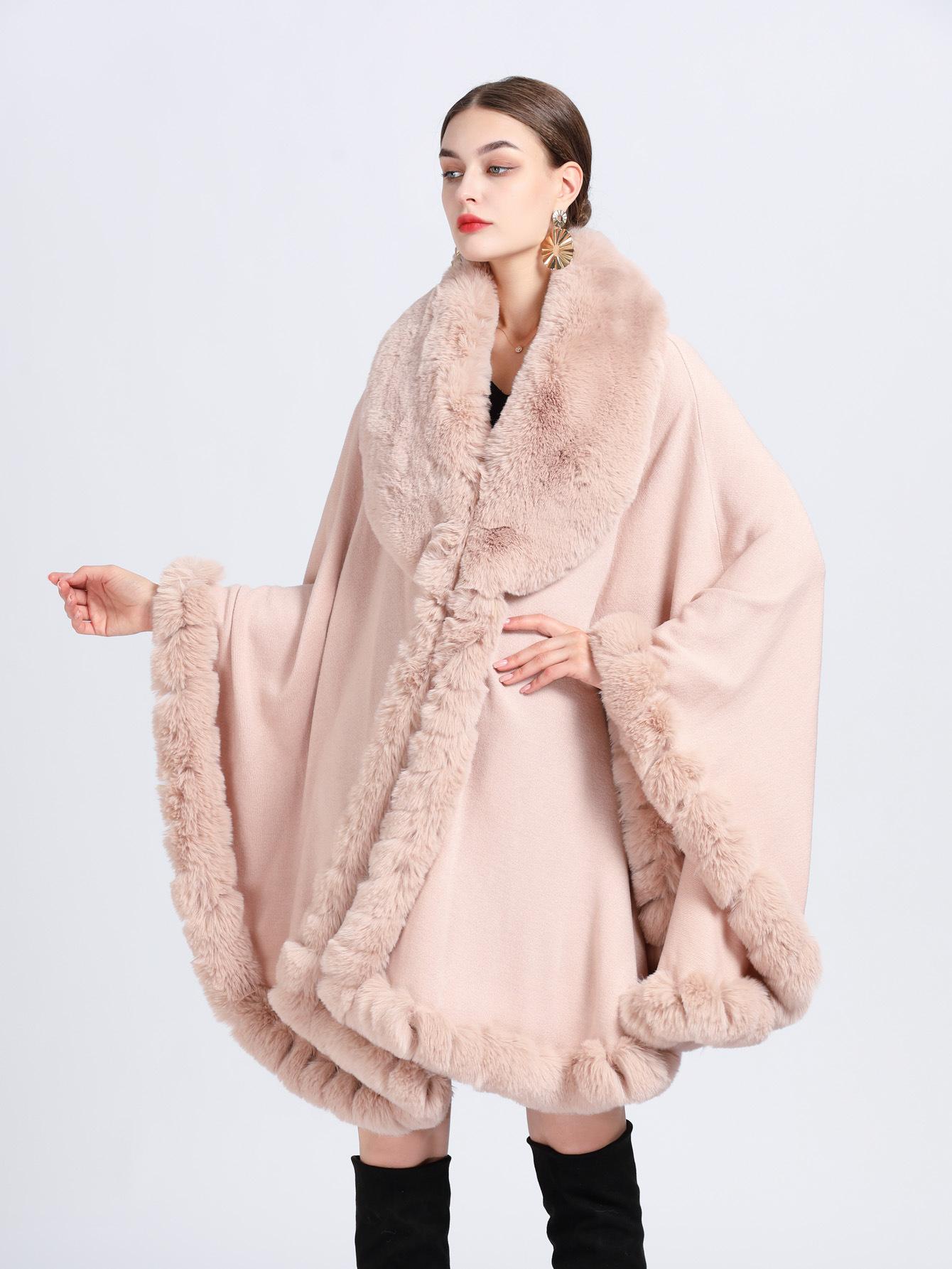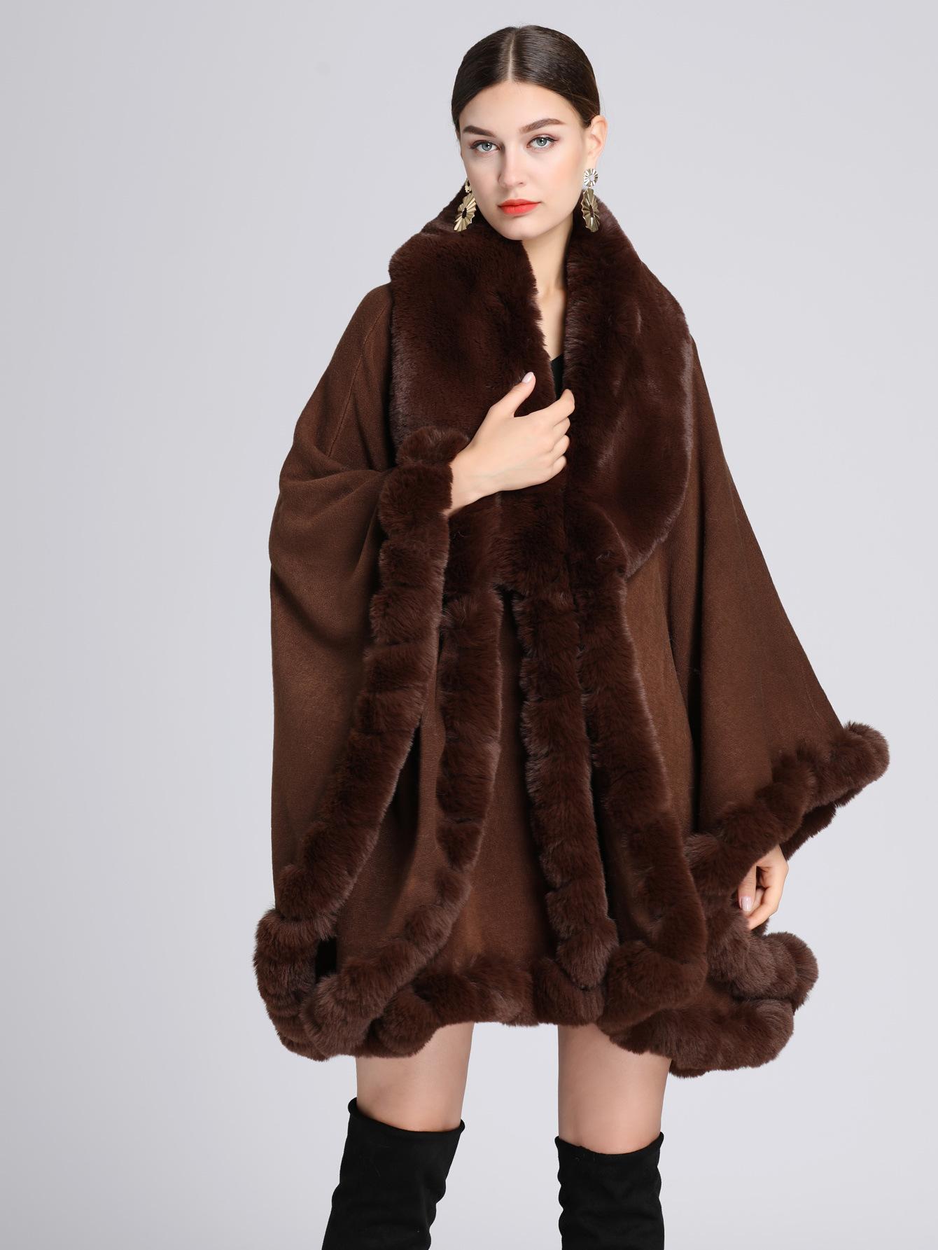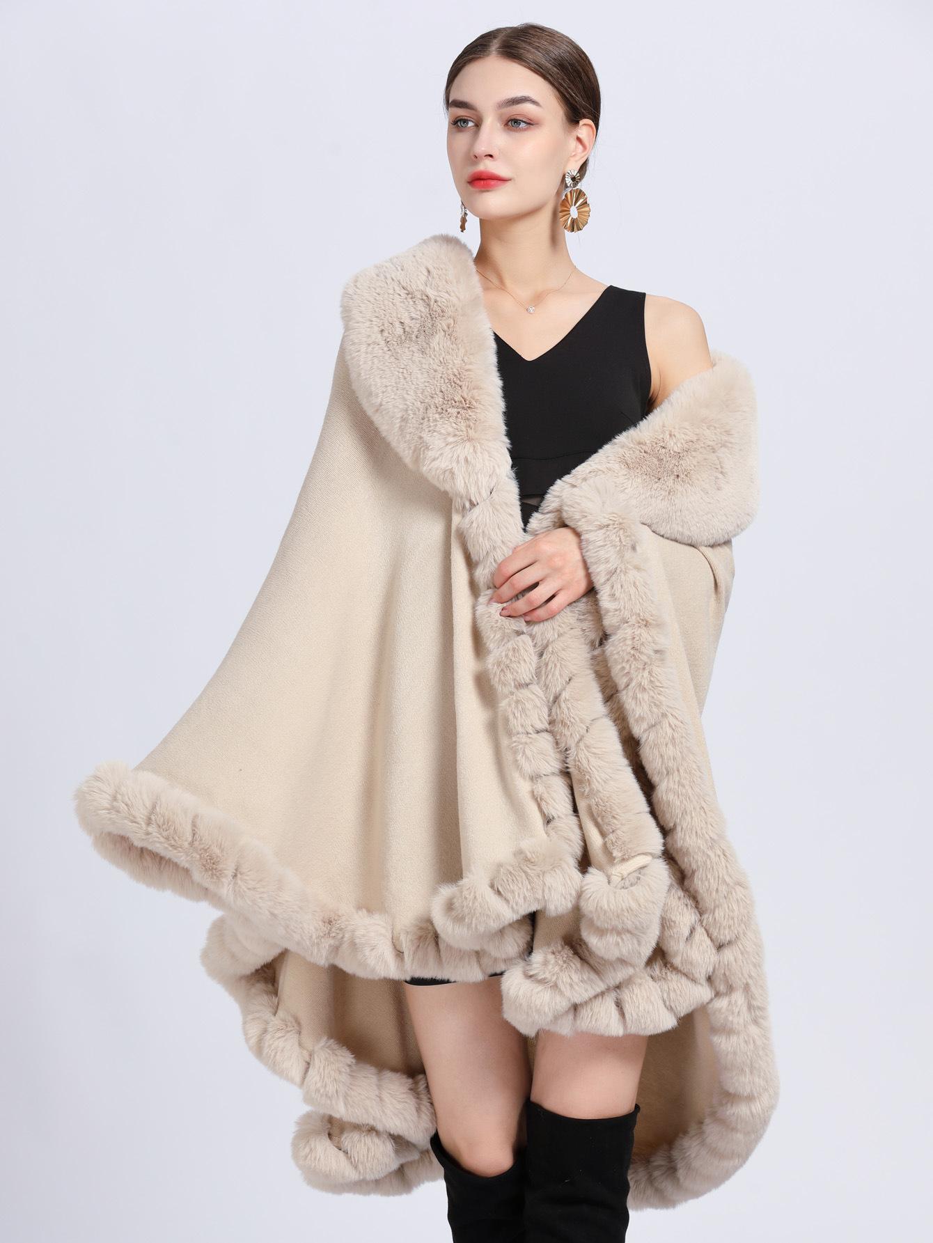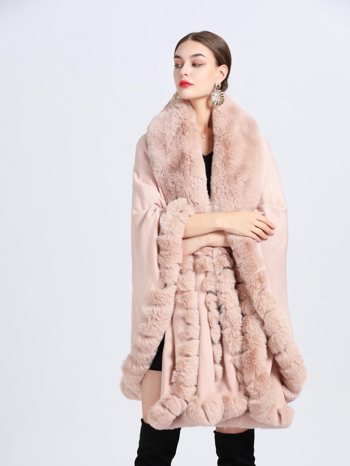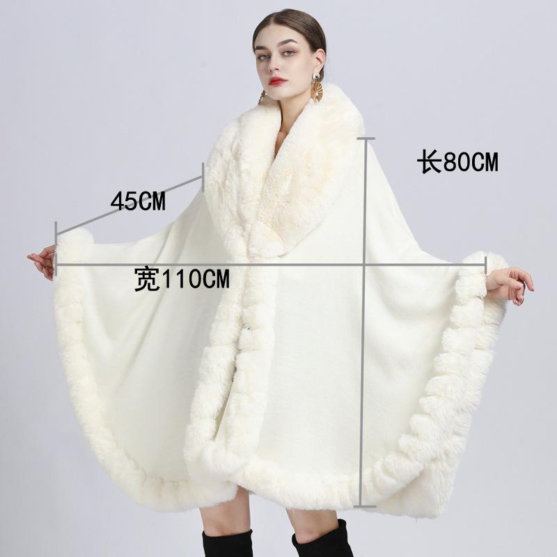 Nuevo estilo de invierno, cuello de piel de conejo Rex sintética, chal, capa de punto, cárdigan suelto, abrigo de moda grueso y cálido para mujer, venta al por mayor