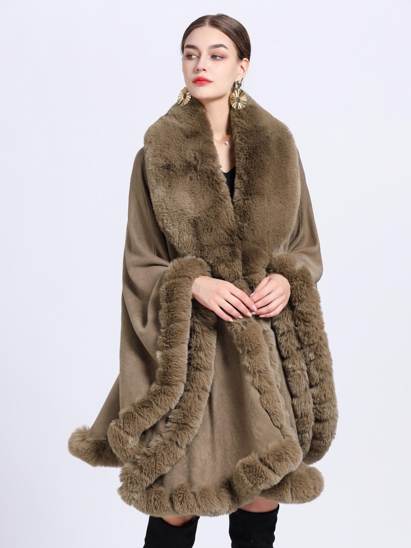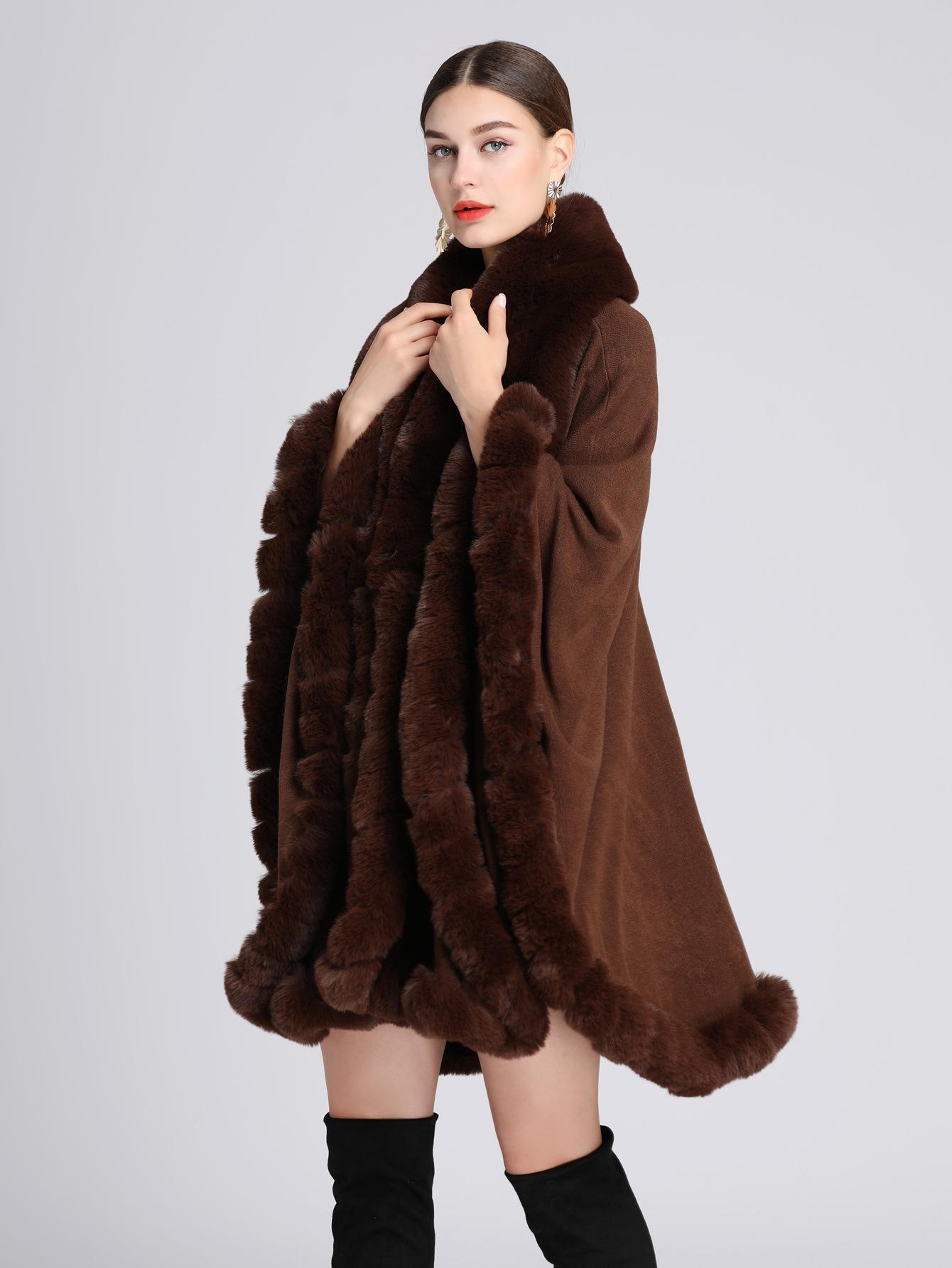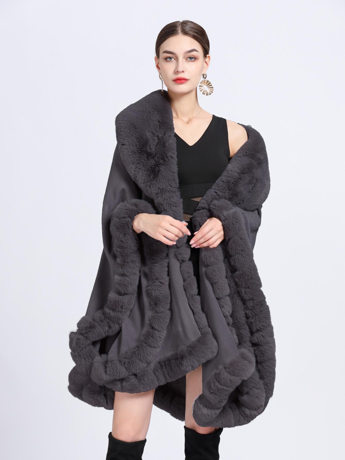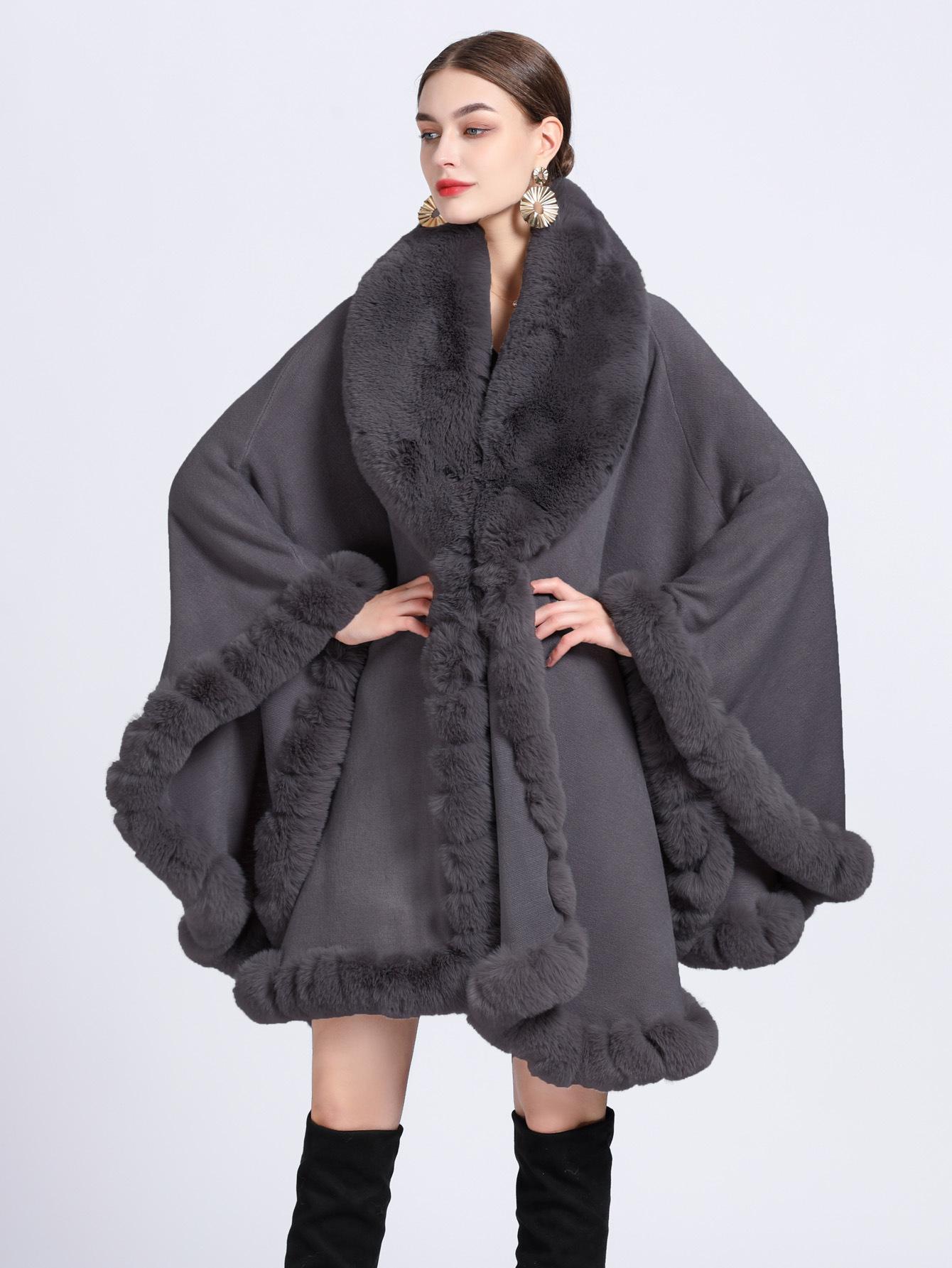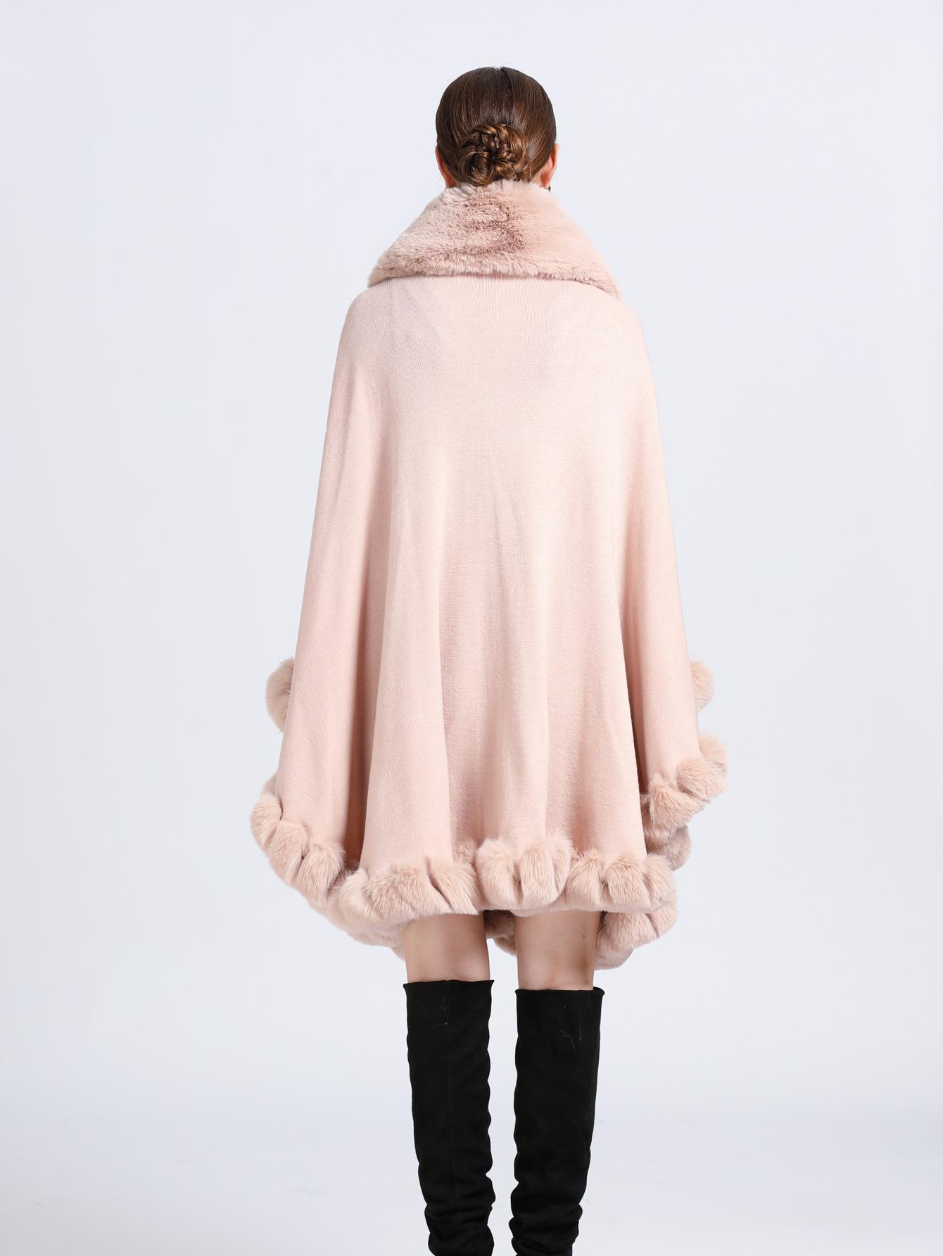 Nuevo estilo de invierno, cuello de piel de conejo Rex sintética, chal, capa de punto, cárdigan suelto, abrigo de moda grueso y cálido para mujer, venta al por mayor