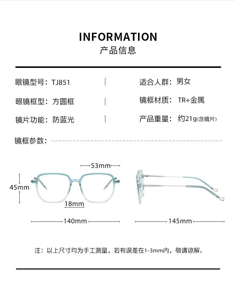 Gafas Lisas de Montura Grande de Celebridad de Internet Moda para Mujer Montura de Gafas para Miopía Tj851 Ultraligeras TR Gafas de Luz Azul al por Mayor