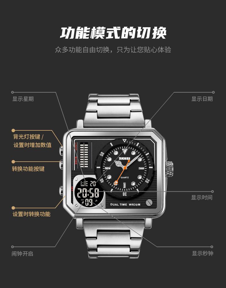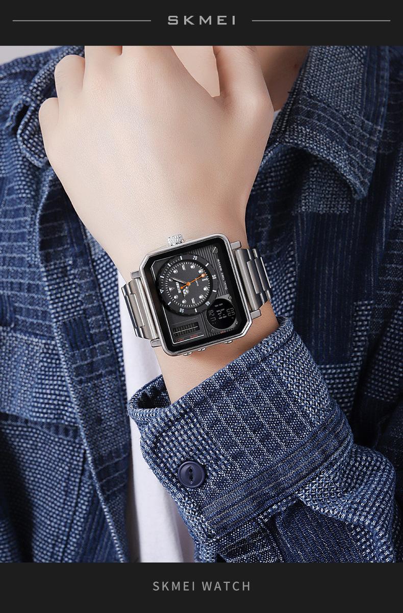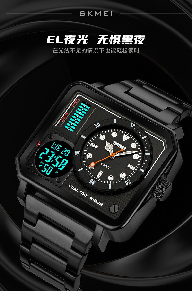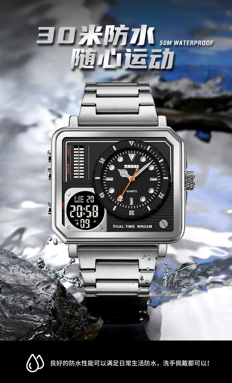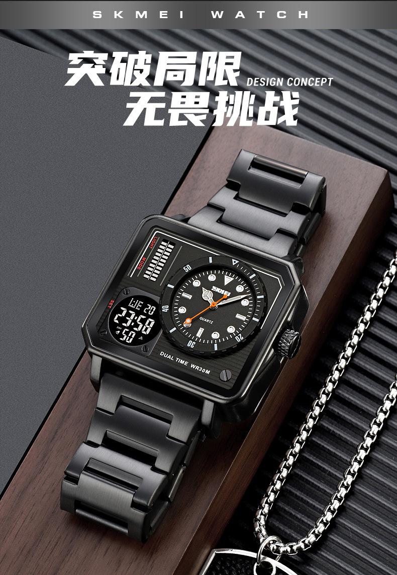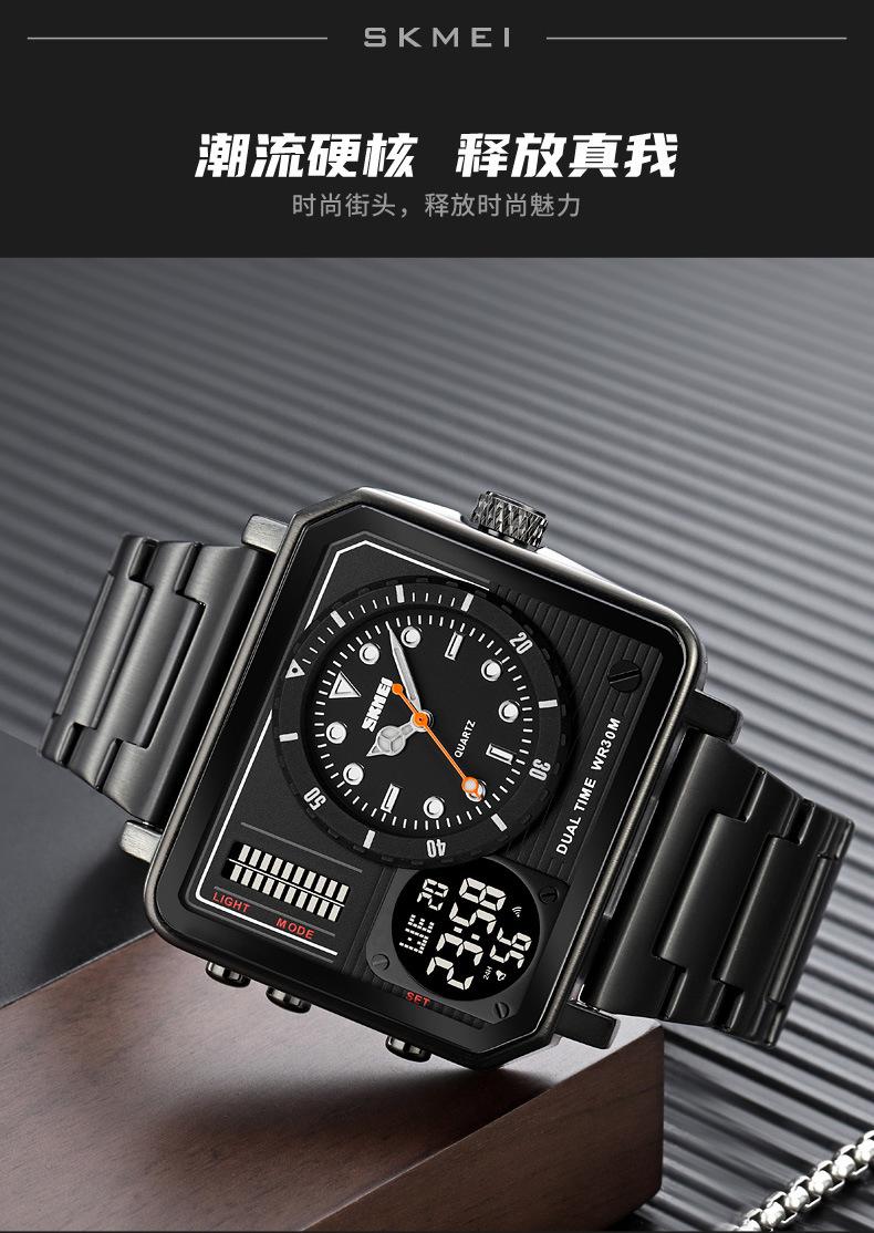 Reloj electrónico multifunción deportivo de moda con doble hora y correa de acero con placa grande de EE. UU.