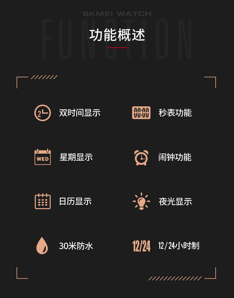 2 Time, stopwatch timing, EL luminous, display date, alarm clock, Display Week, hour time, 12/24 hour system
