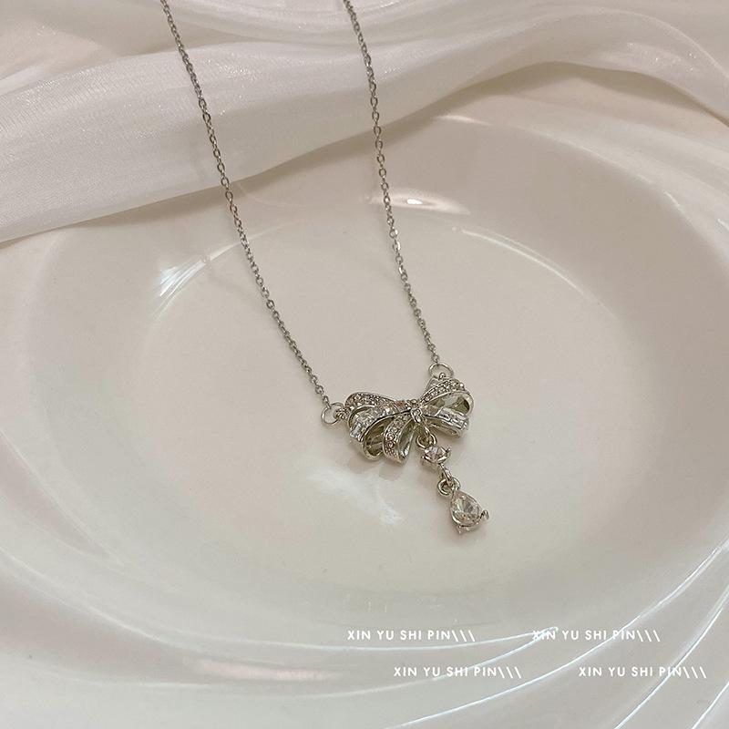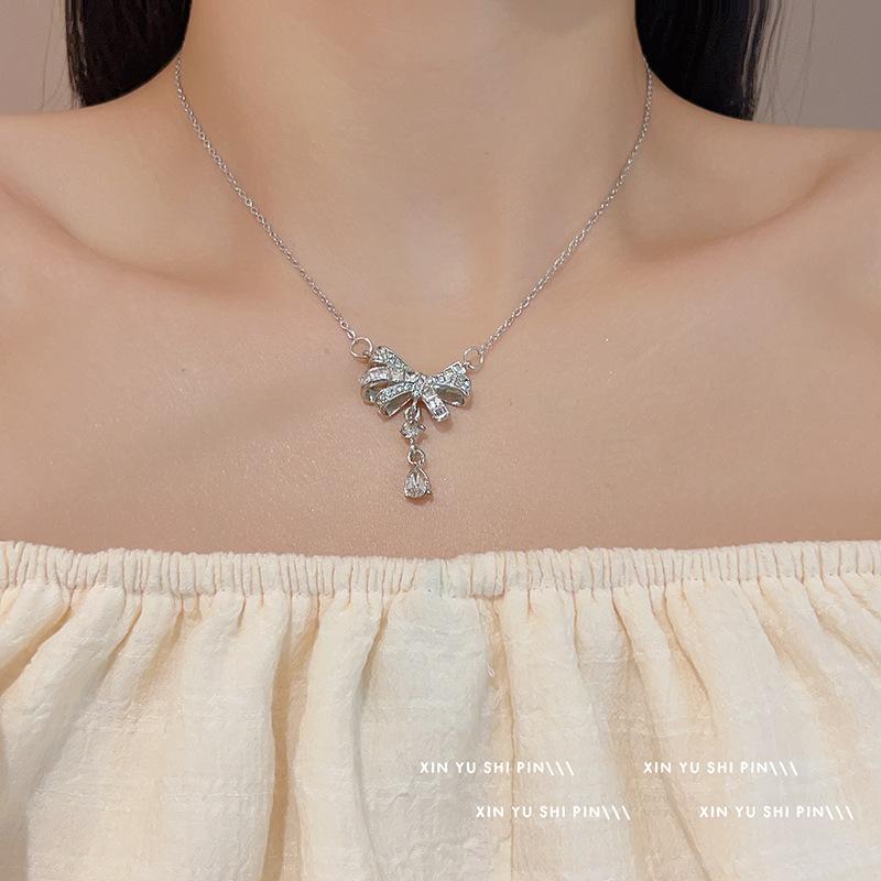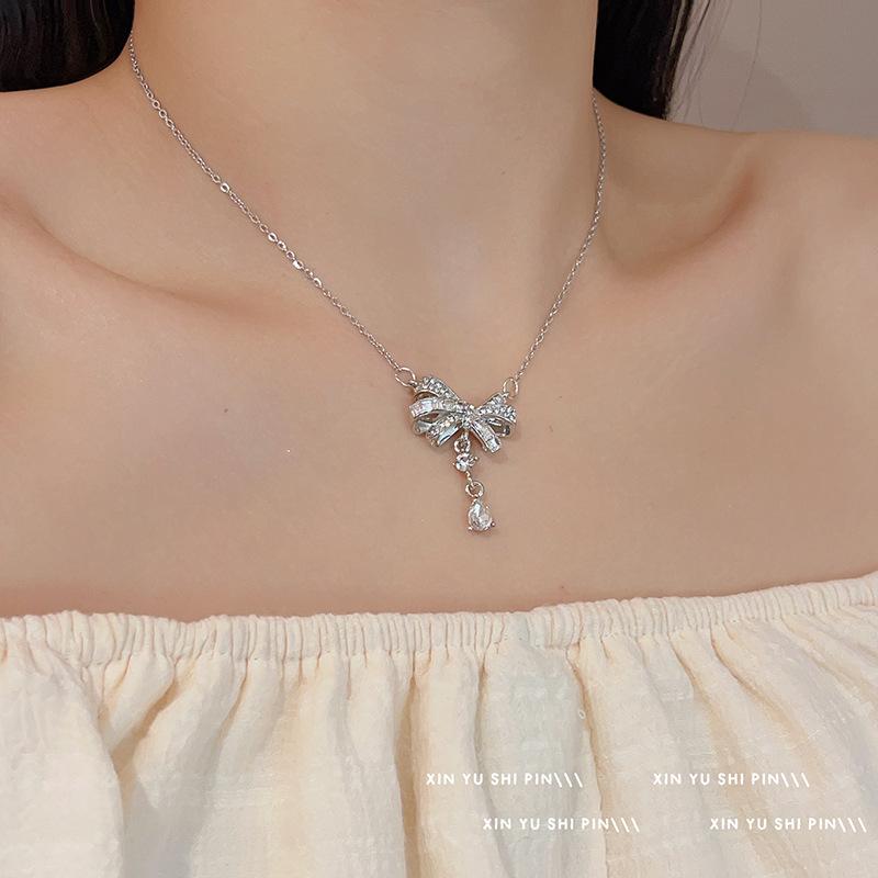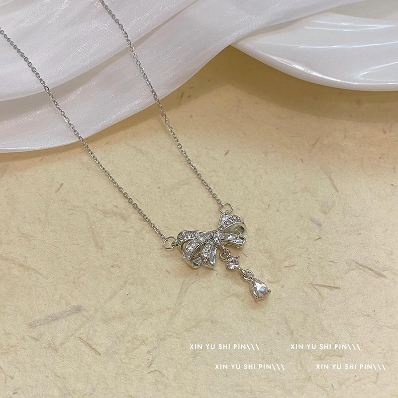 Collar con lazo de diamantes, dulce y fresco, ligero, de lujo, de moda, elegante, con colgante de gota de agua, cadena para clavícula, venta al por mayor