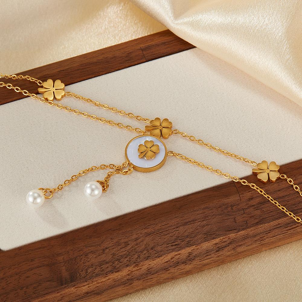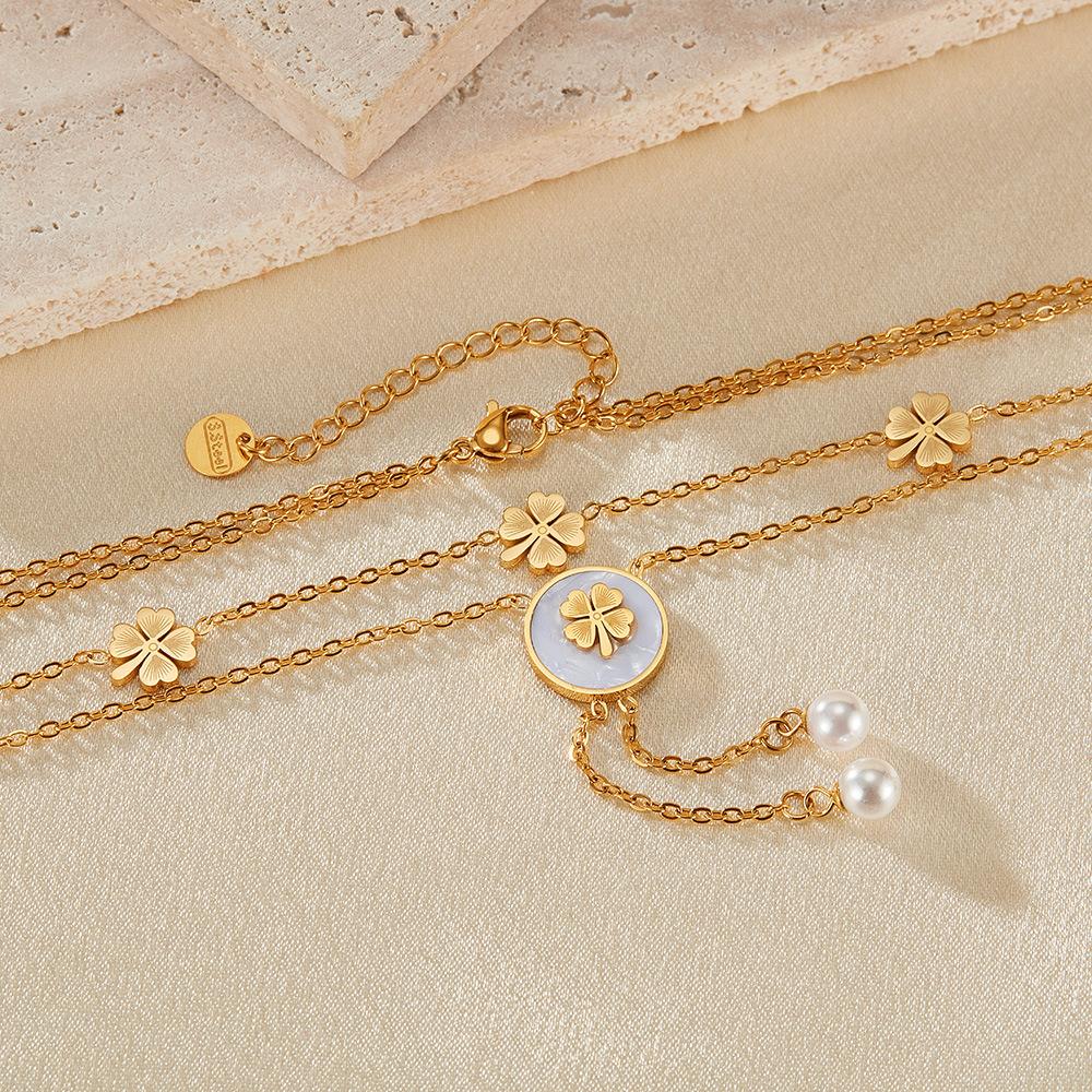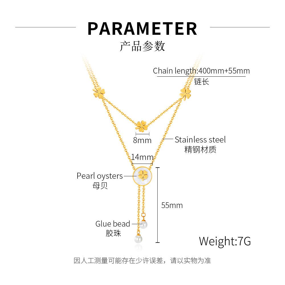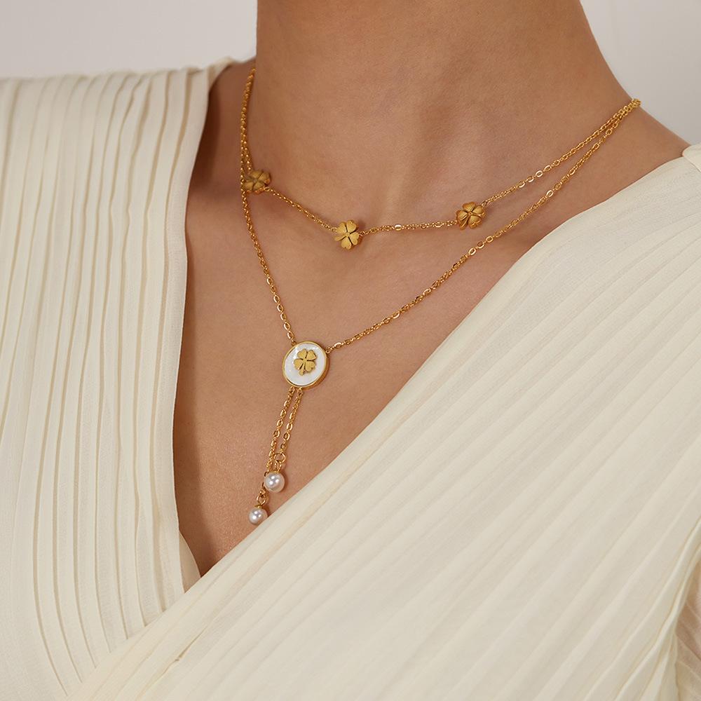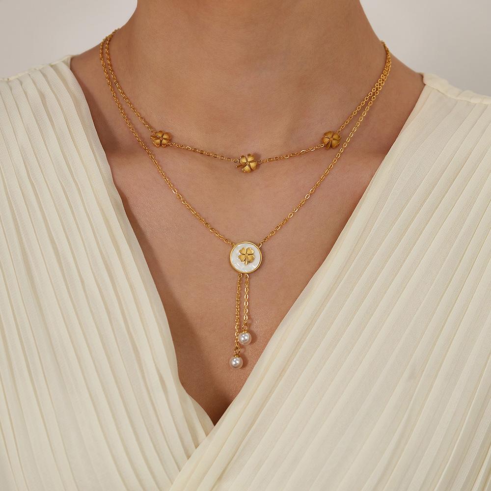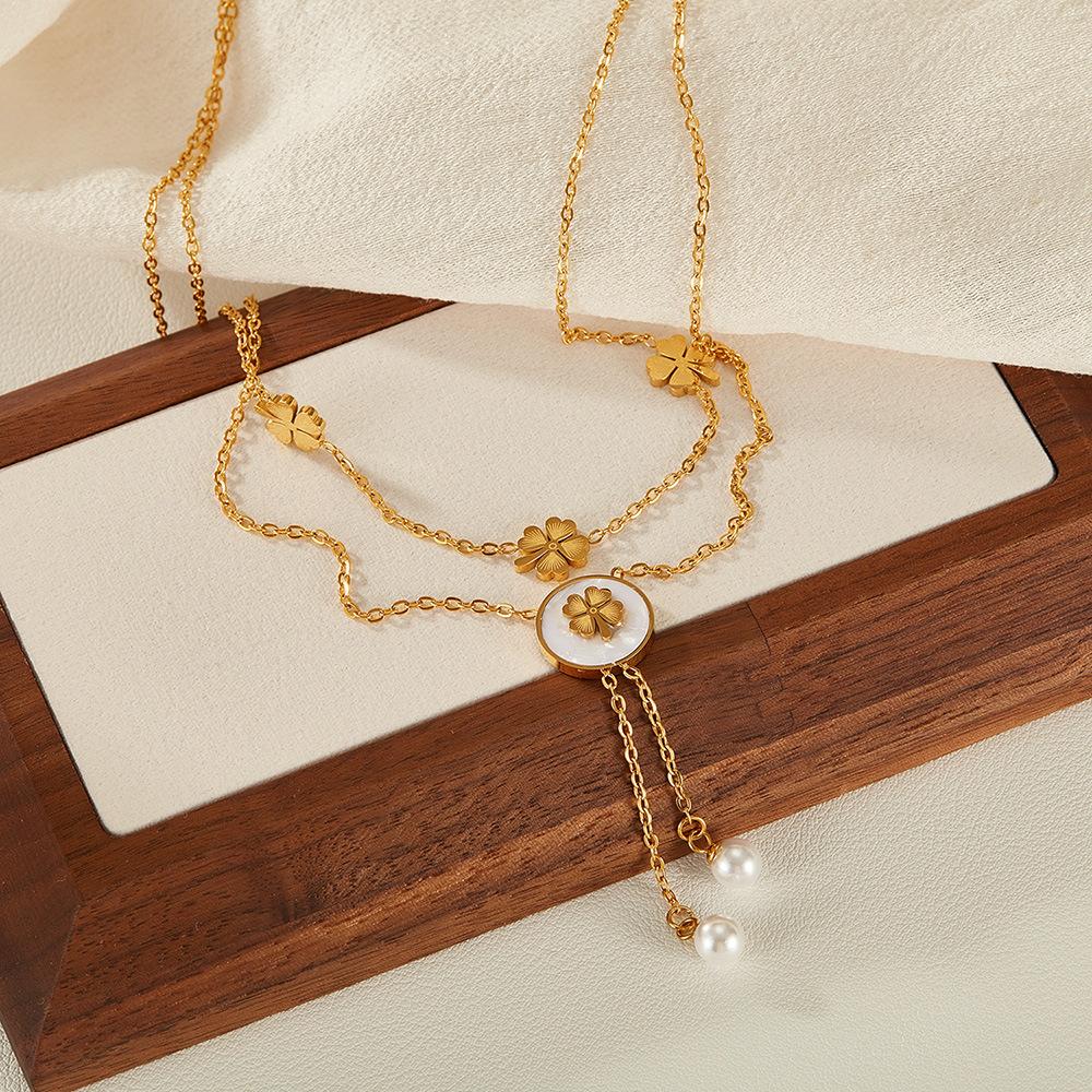 Collar de Acero de Titanio Moderno y Versátil Joyería para Mujer Doble Capa Nácar Flor Borla Accesorios de Perlas Joyería de Acero Inoxidable