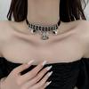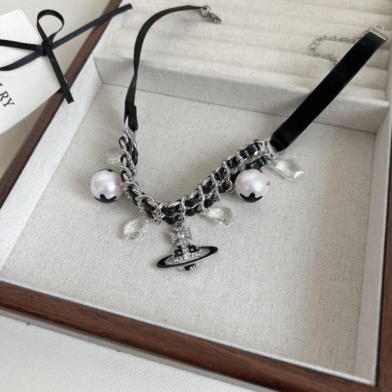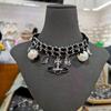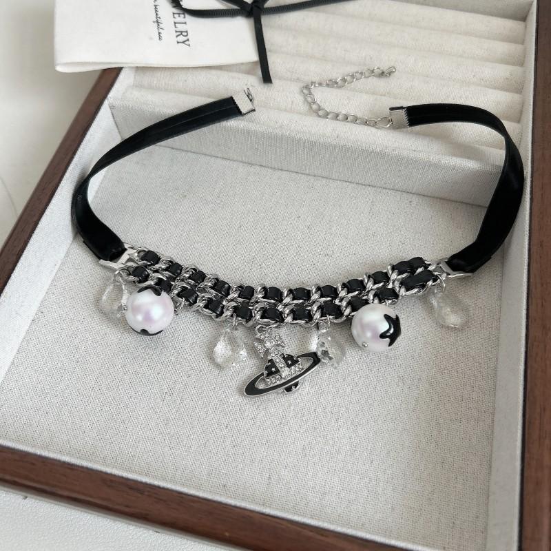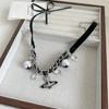 Collar con colgante de planeta con diamantes de imitación y perlas de moda, dulce y moderno, con borlas de cristal, cadena de cuero de doble capa y diseño de cadena de clavícula.