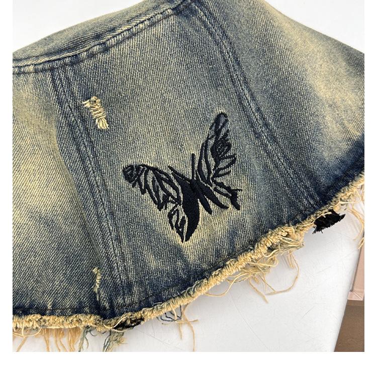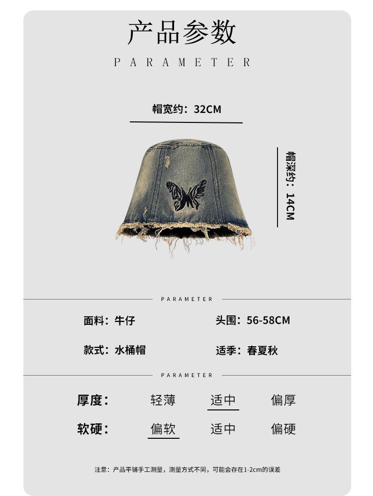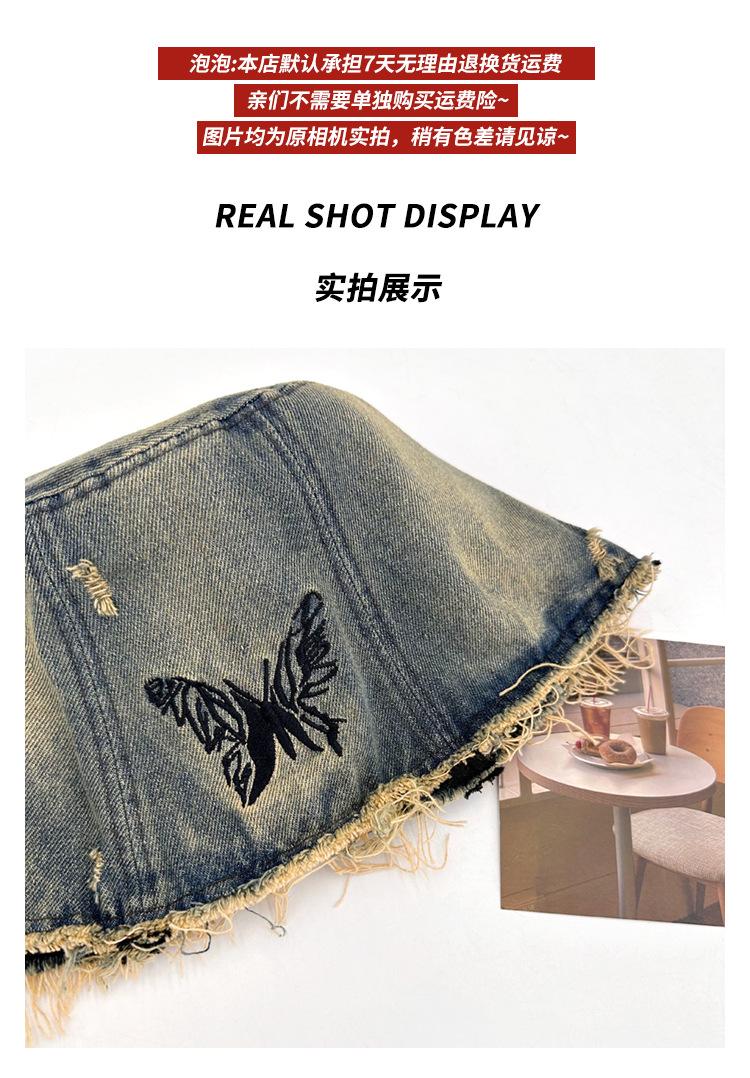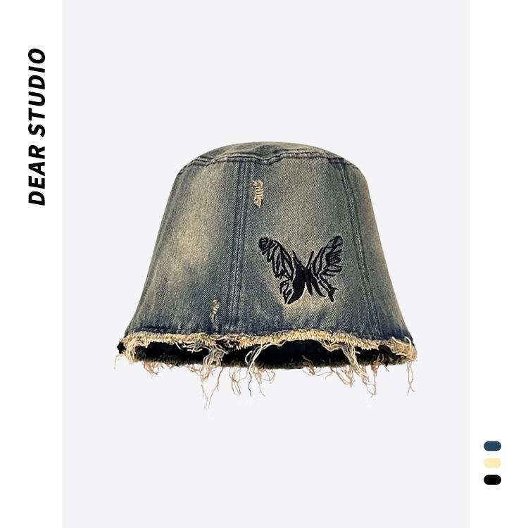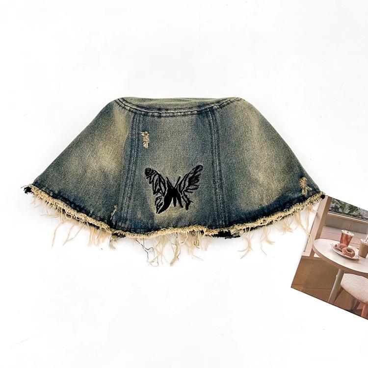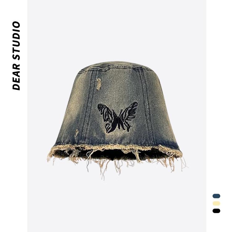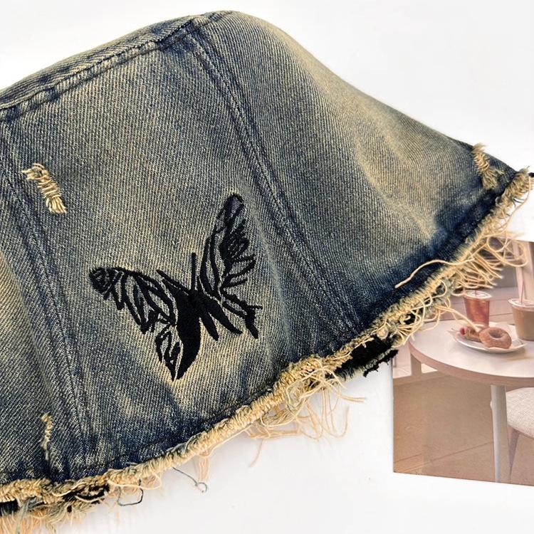 Sombrero de Cubo de Mezclilla de Mariposa Coreano Nuevo Estilo Vintage Ins Retro Lavado Desgastado para Mujer, Sombrero Versátil de Moda para Primavera y Verano