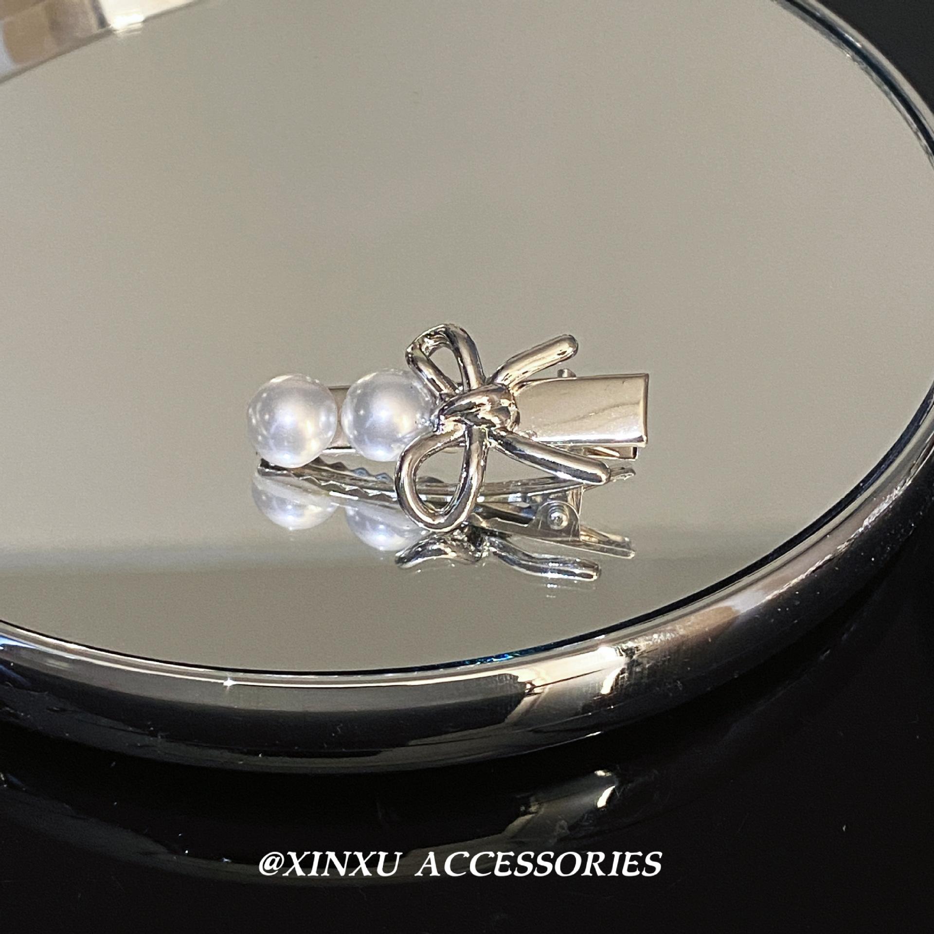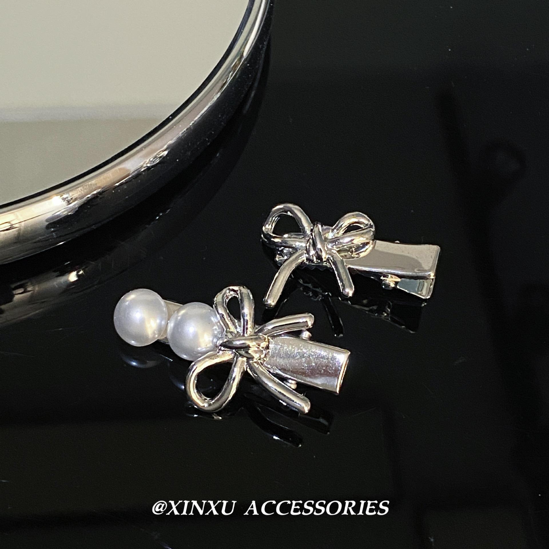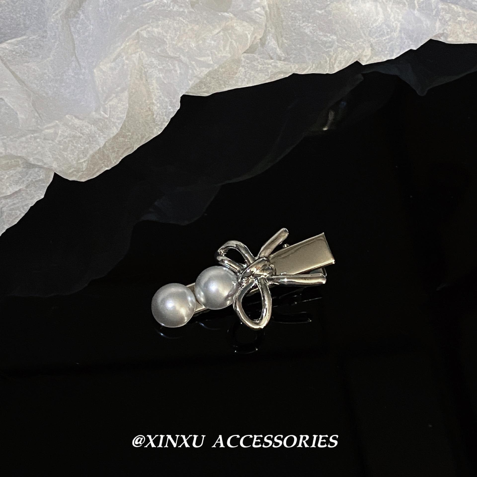 Horquilla de metal plateada con lazo de perla y diseño de nicho, accesorios para el cabello con clip lateral para niña dulce