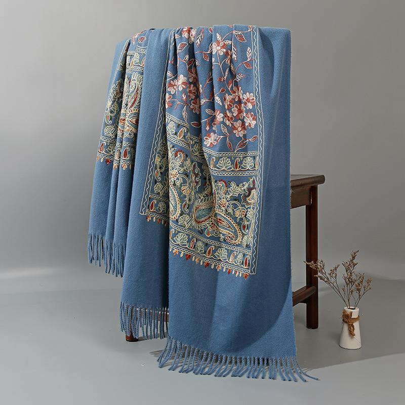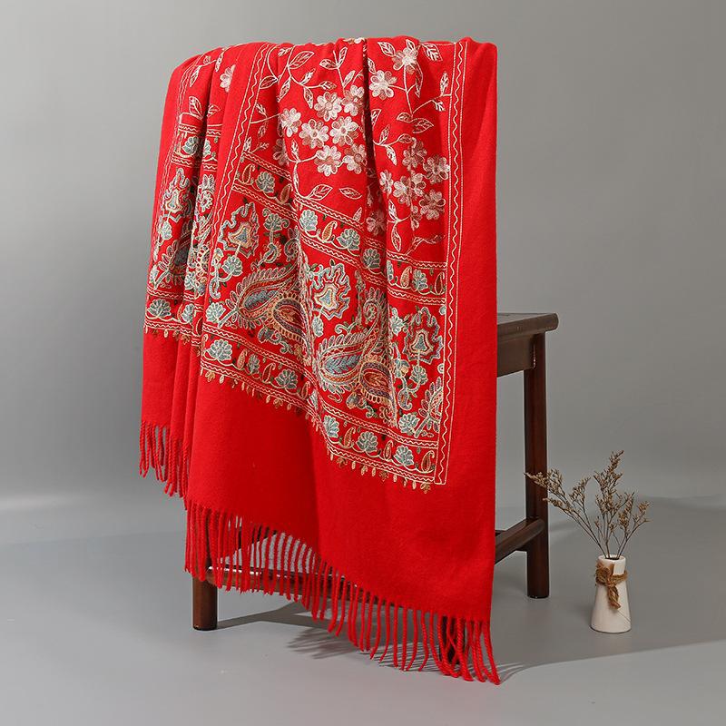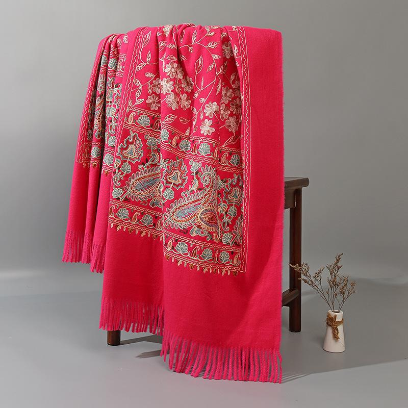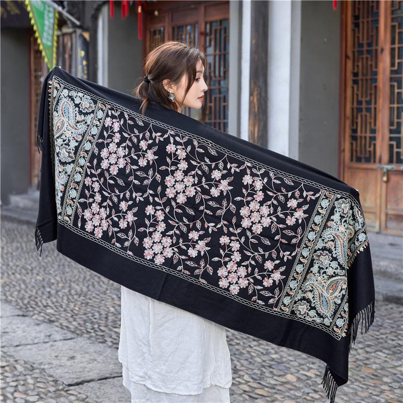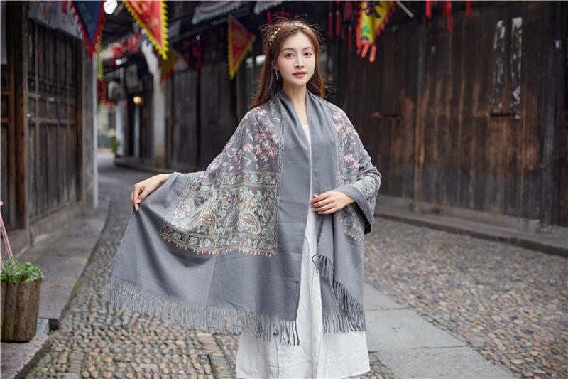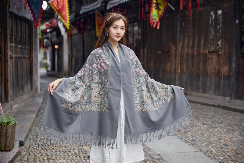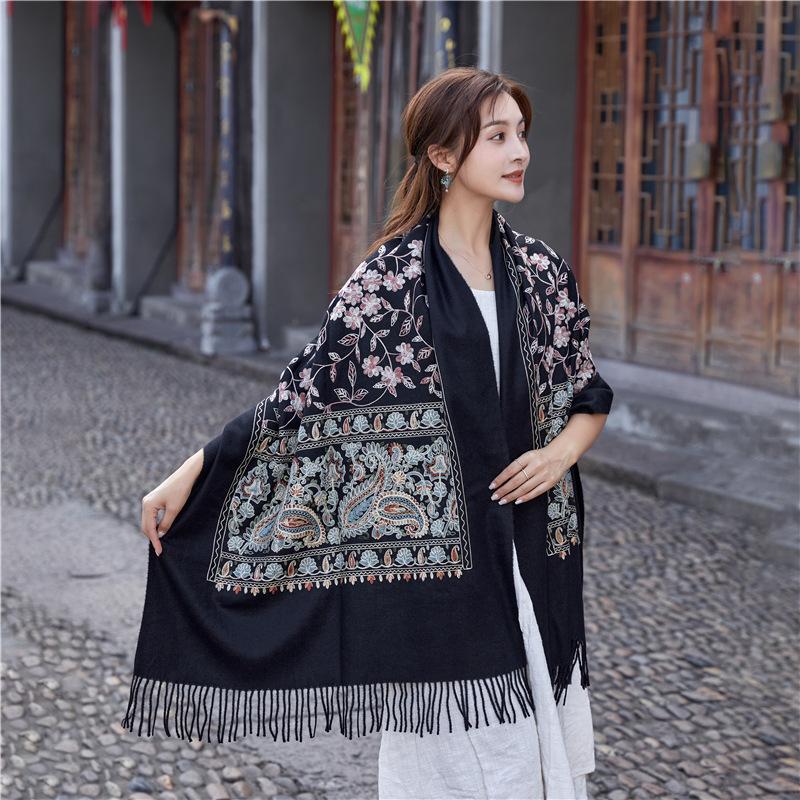 2024 Otoño/Invierno Nuevo Estilo Étnico Cálido Borla Imitación Cachemira Exterior Bufanda Bordado para Mujer Venta al por Mayor Bordado Estilo Étnico