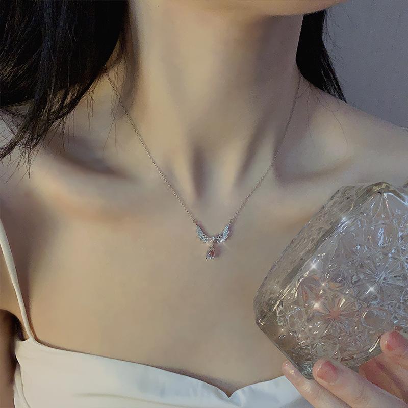 Collar con colgante de alas de ángel y piedra lunar para mujer, diseño de nicho, cadena de clavícula con alas de alta gama, ideal para celebraciones en Internet, sencillo y combinable.