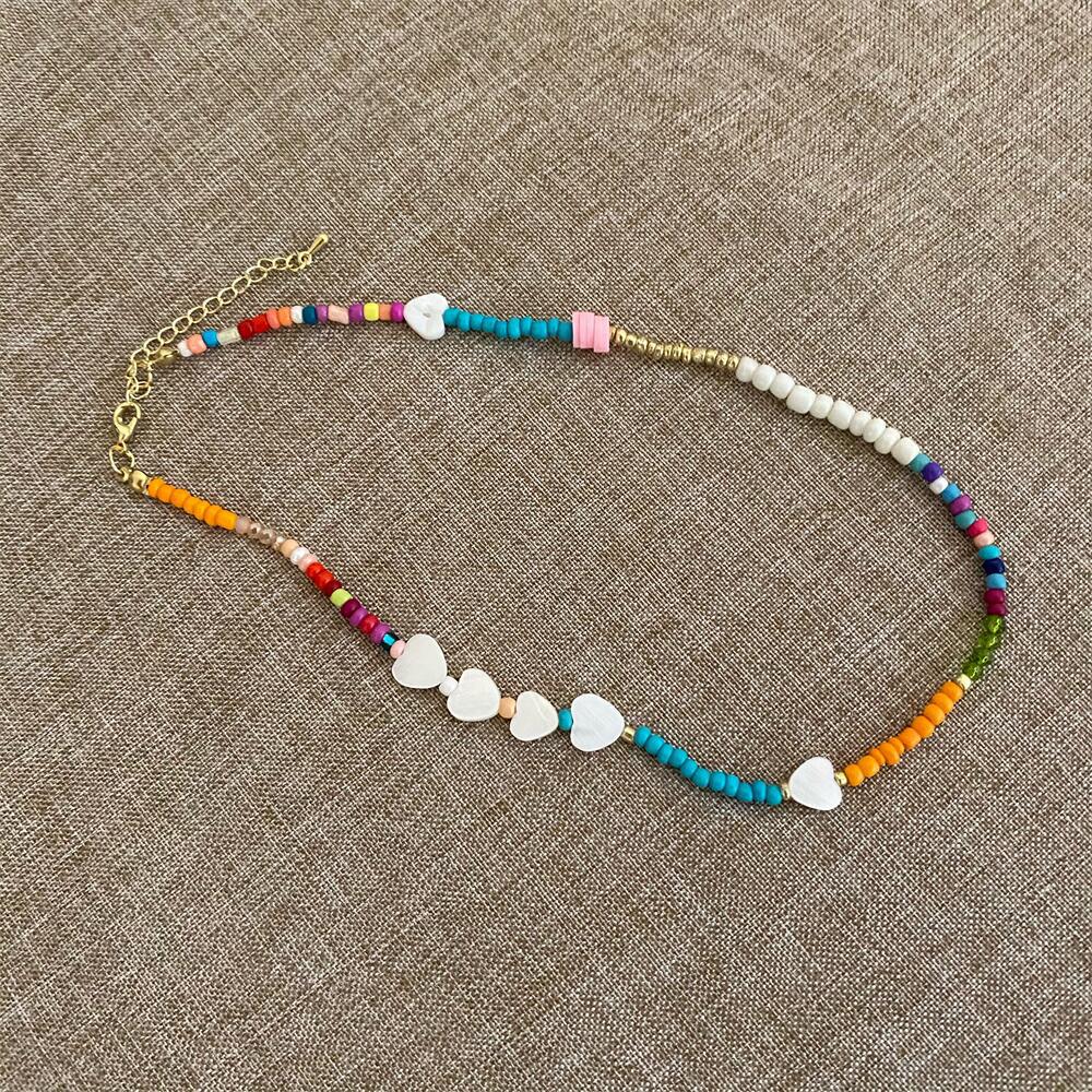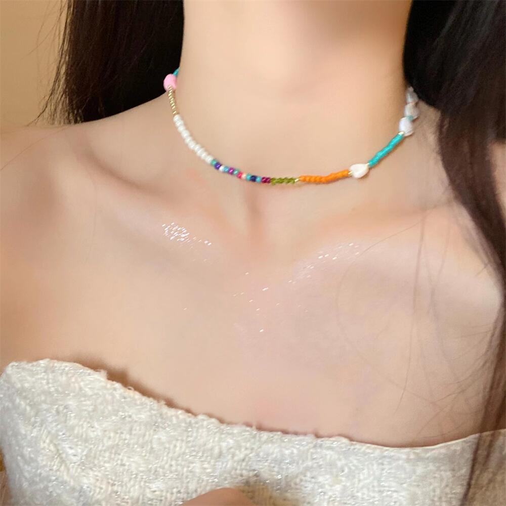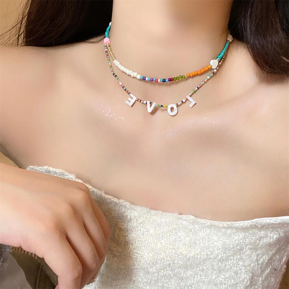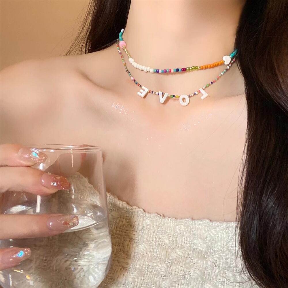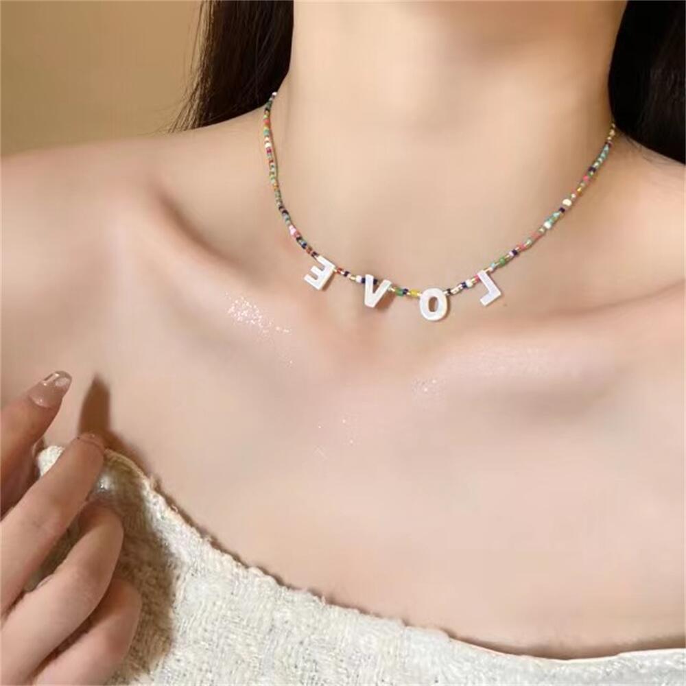 Collar de cuentas de colores estilo coreano hecho a mano con letras y conchas, cadena de clavícula apilada para usar en primavera y verano, collar retro para mujer