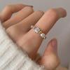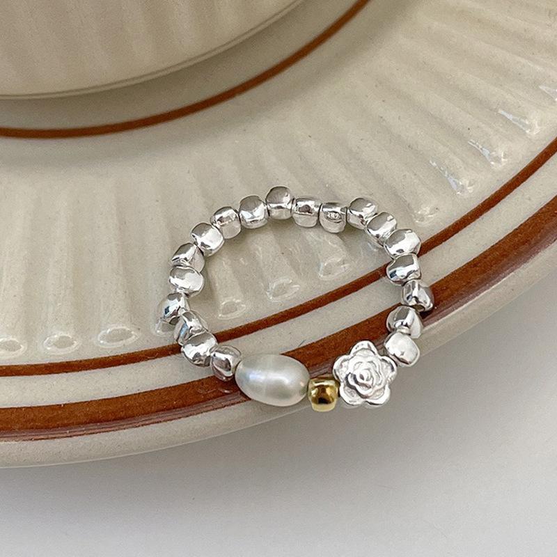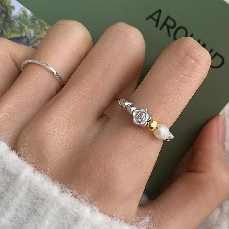Anillo de Perla Plateada con Flor Pequeña para Mujer, Diseño Nicho de Moda Minimalista, Banda Elástica de Lujo Ligero, Elegante Anillo para el Dedo Índice
