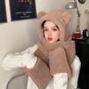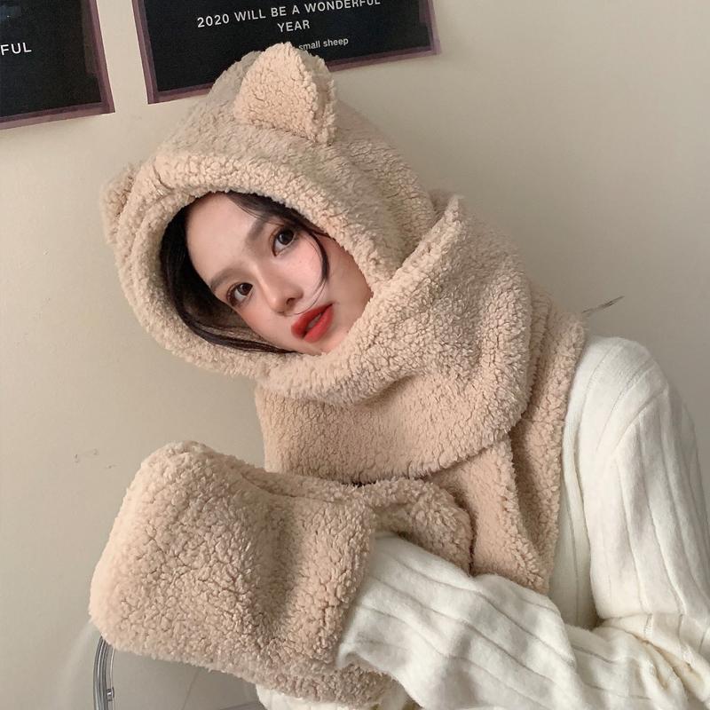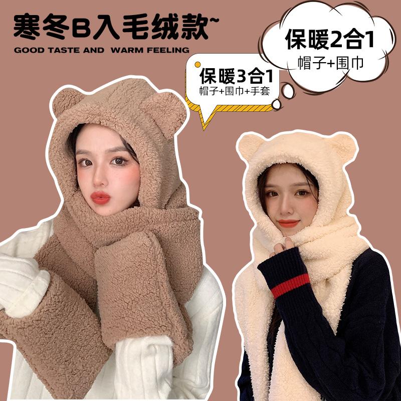Gorro de osito para niños, otoño e invierno, bonito gorro de felpa de invierno, guantes, tres piezas, con capucha, combina con todo, cálido y a la moda.