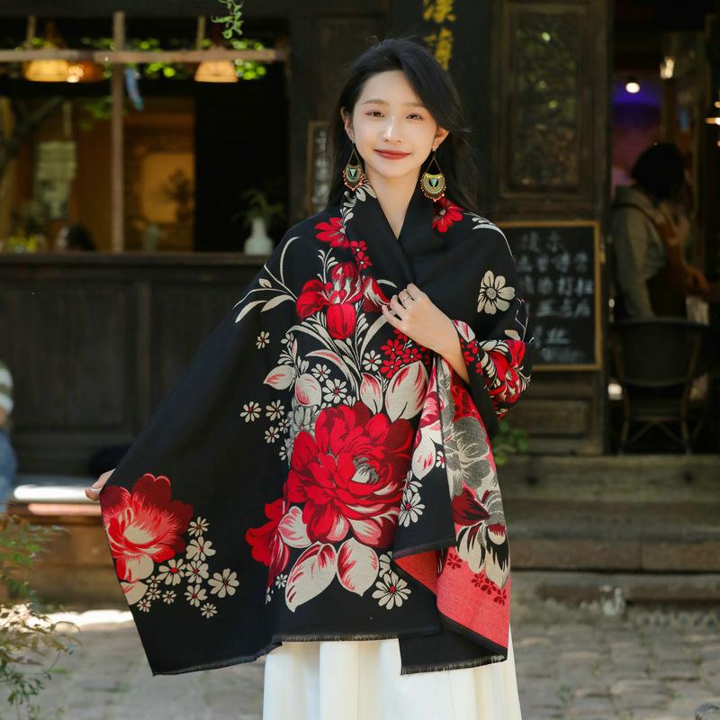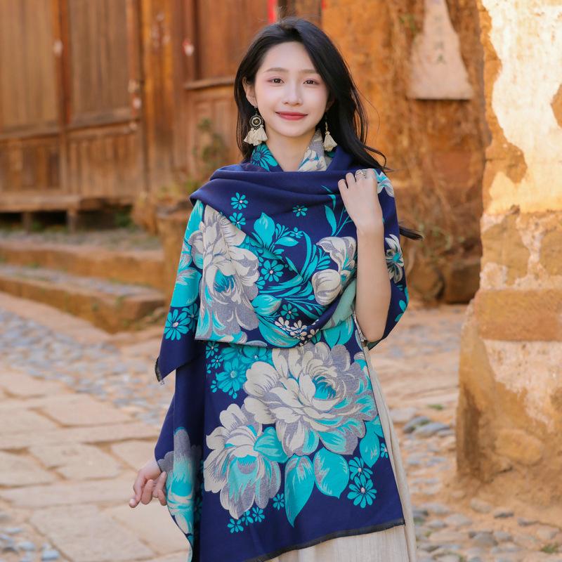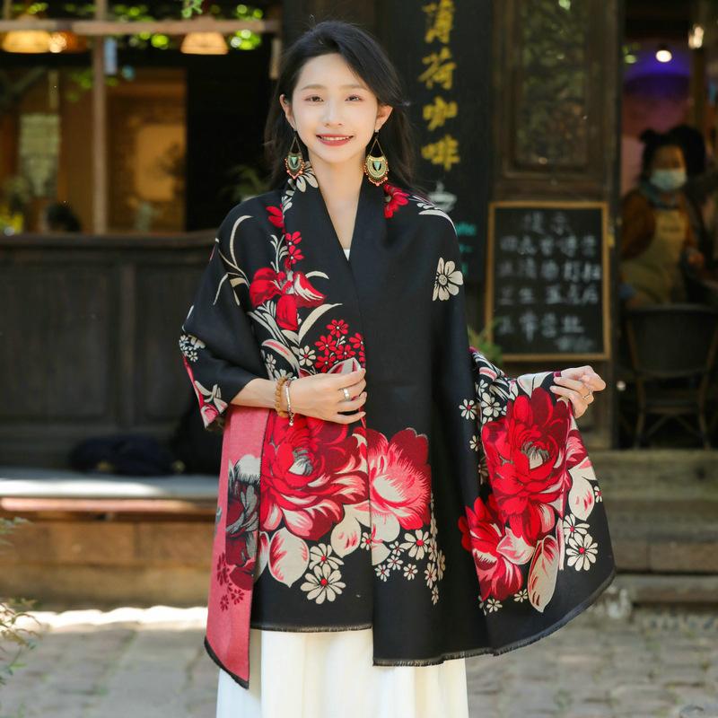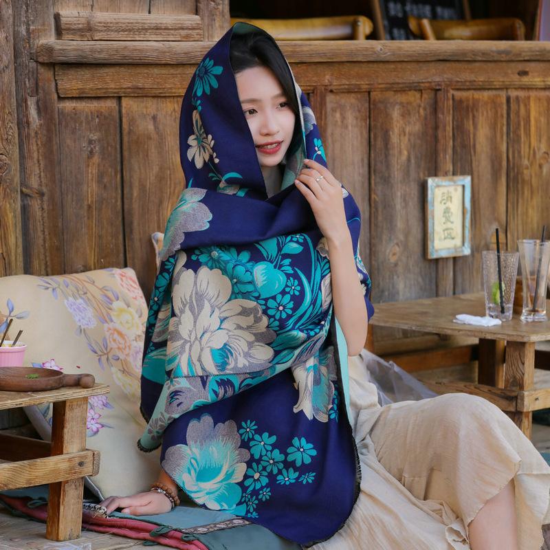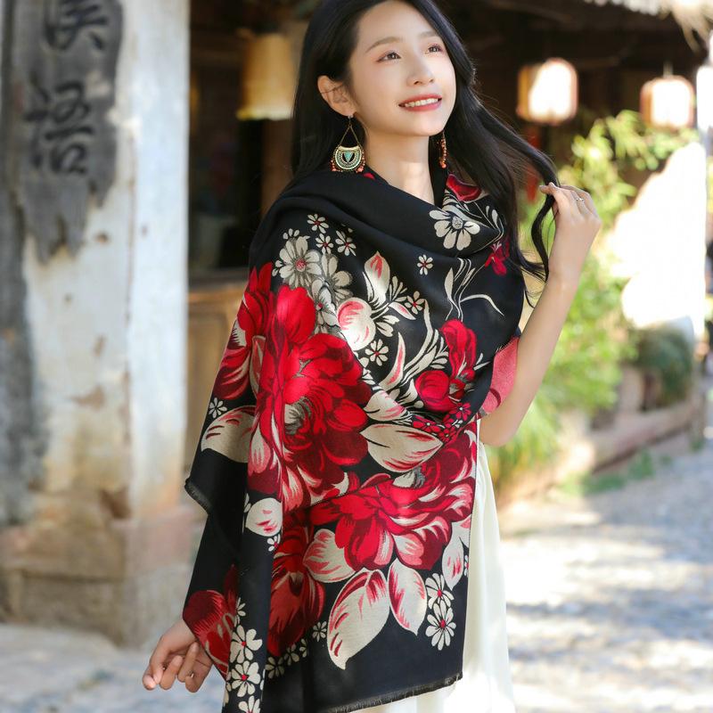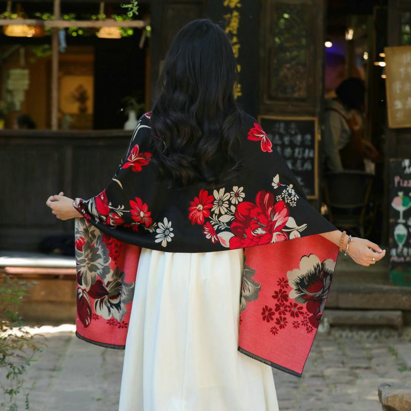 Bufanda de flores para mujer, estilo coreano, otoño e invierno, nueva, imitación de cachemira, pelo recogido, chal para habitación con aire acondicionado, estilo étnico, bufanda cálida y gruesa.