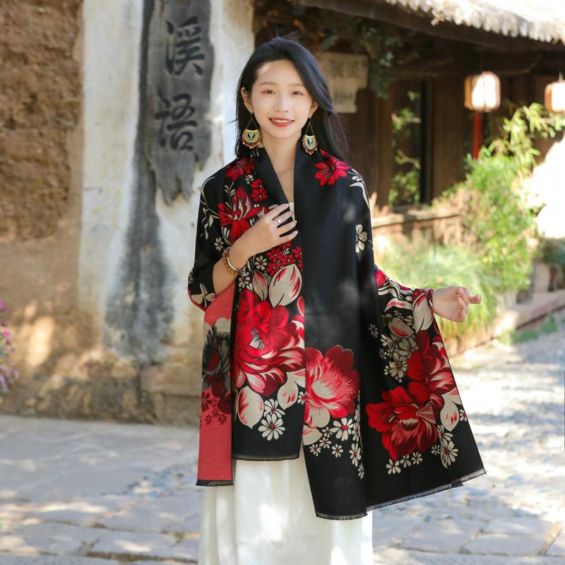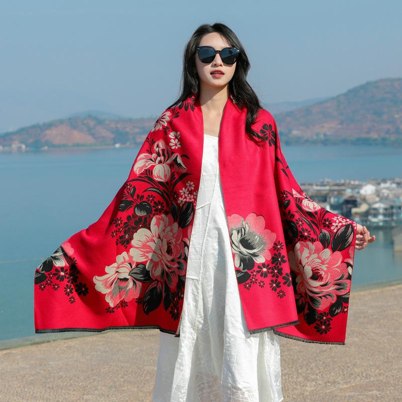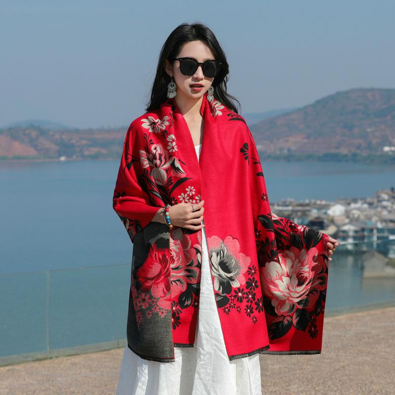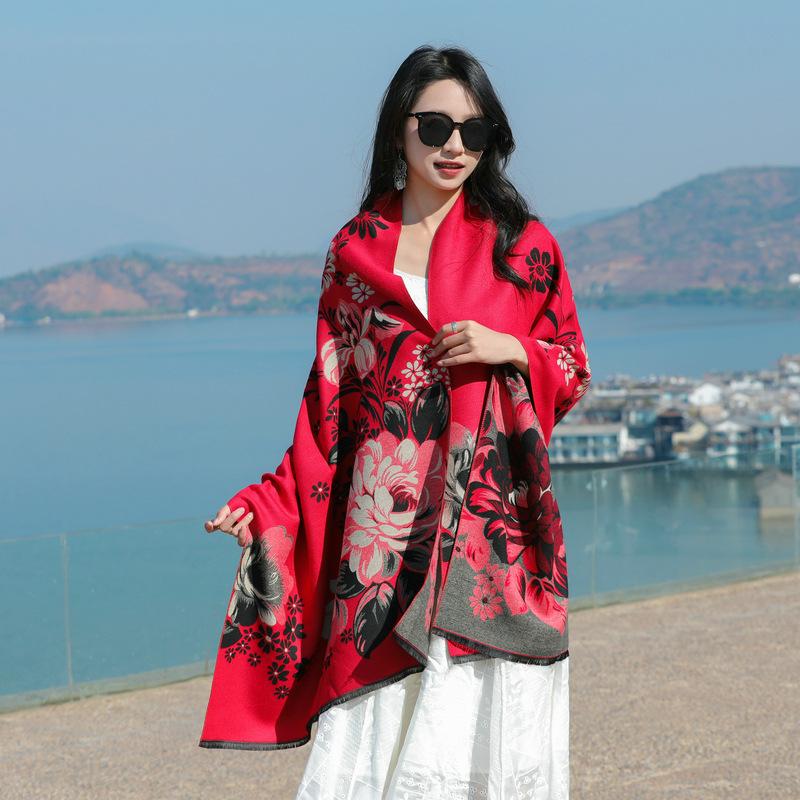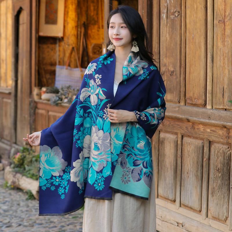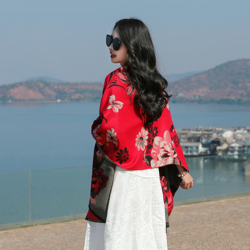 Bufanda de flores para mujer, estilo coreano, otoño e invierno, nueva, imitación de cachemira, pelo recogido, chal para habitación con aire acondicionado, estilo étnico, bufanda cálida y gruesa.
