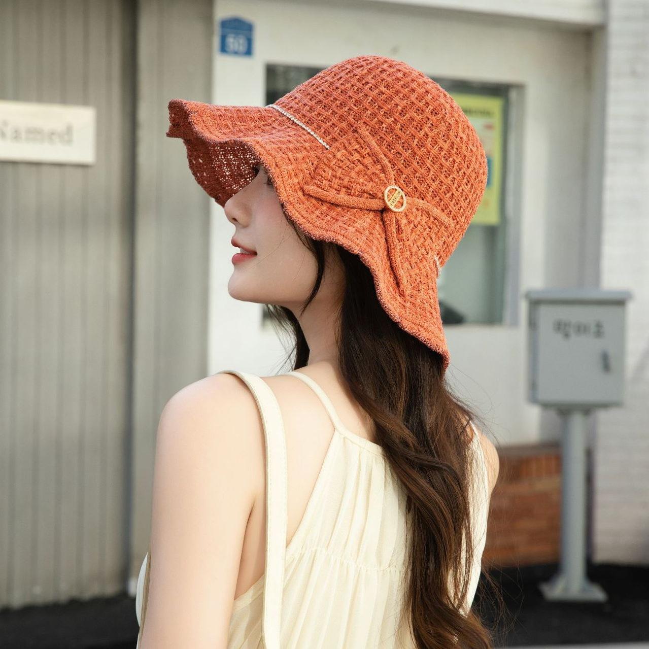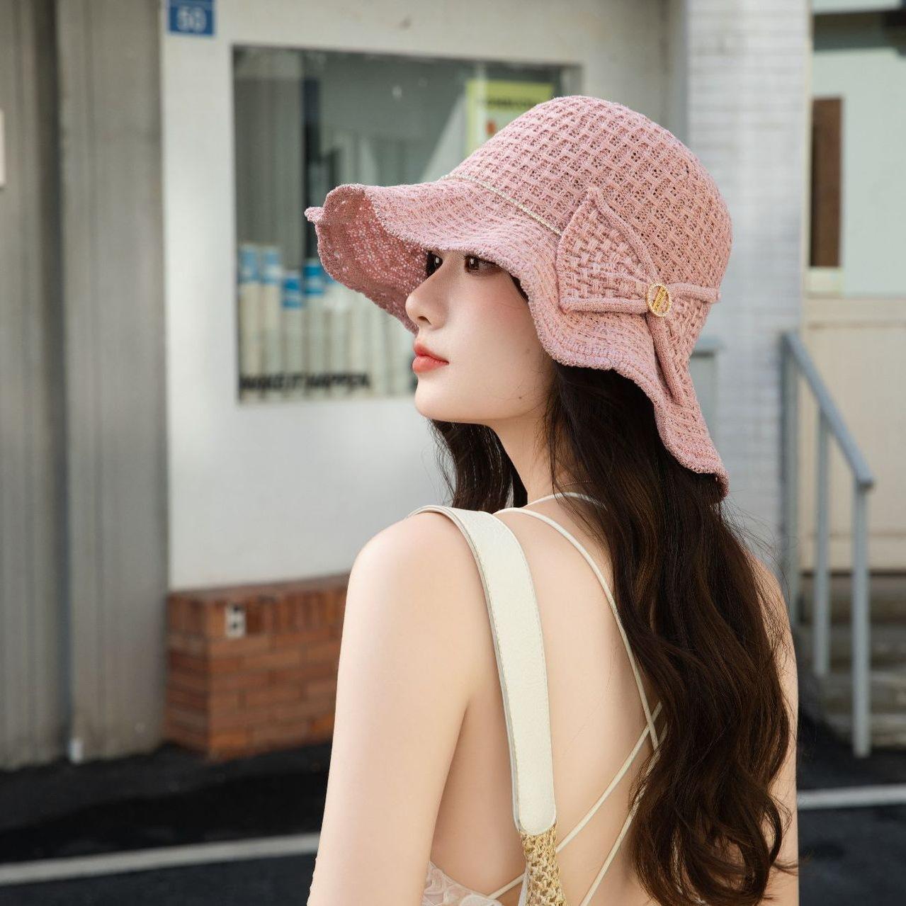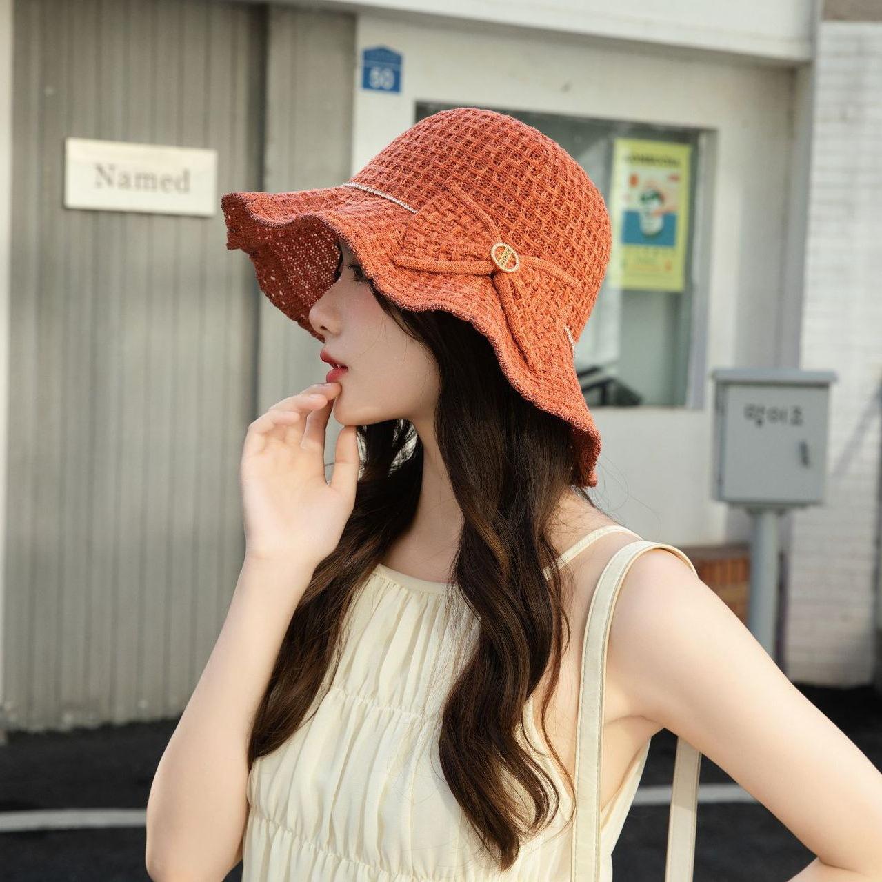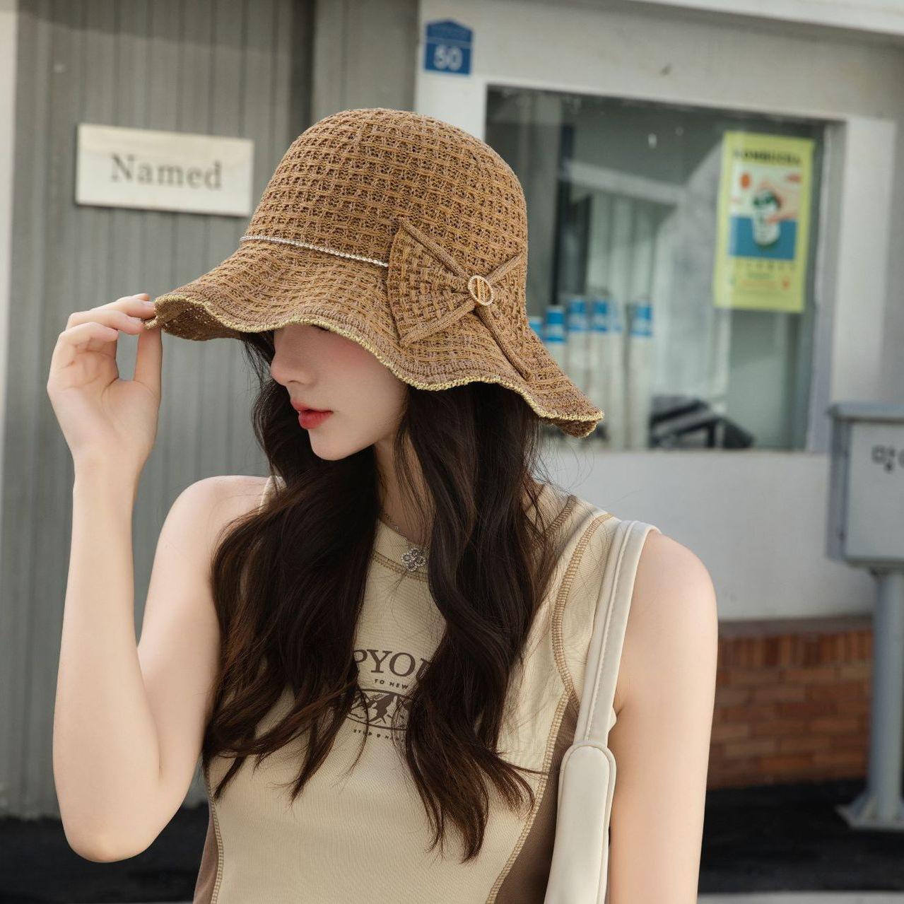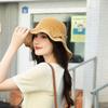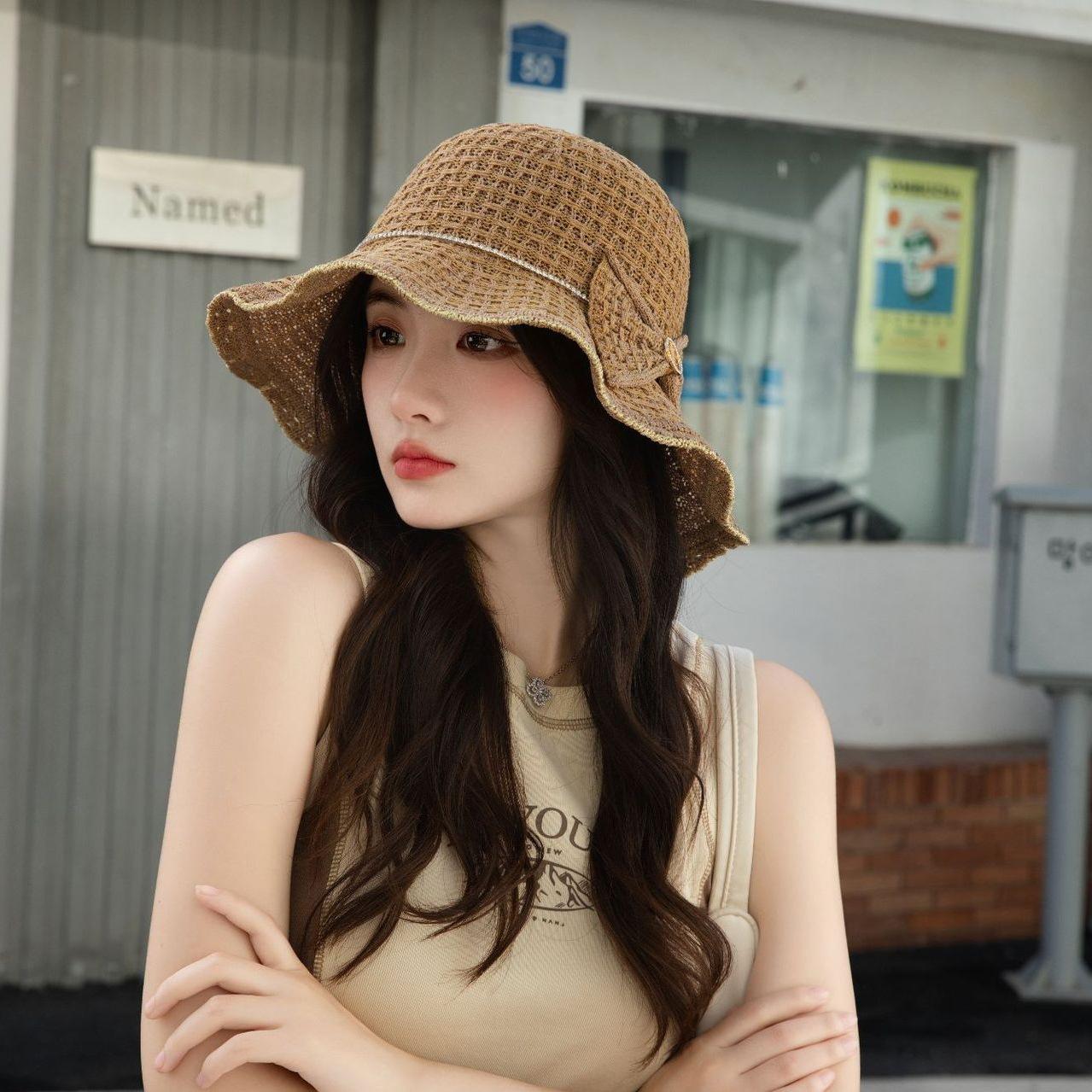 Sombrero de pescador de verano para mujer, estilo coreano, tejido hueco, protector solar, con lazo de playa y cornisa grande
