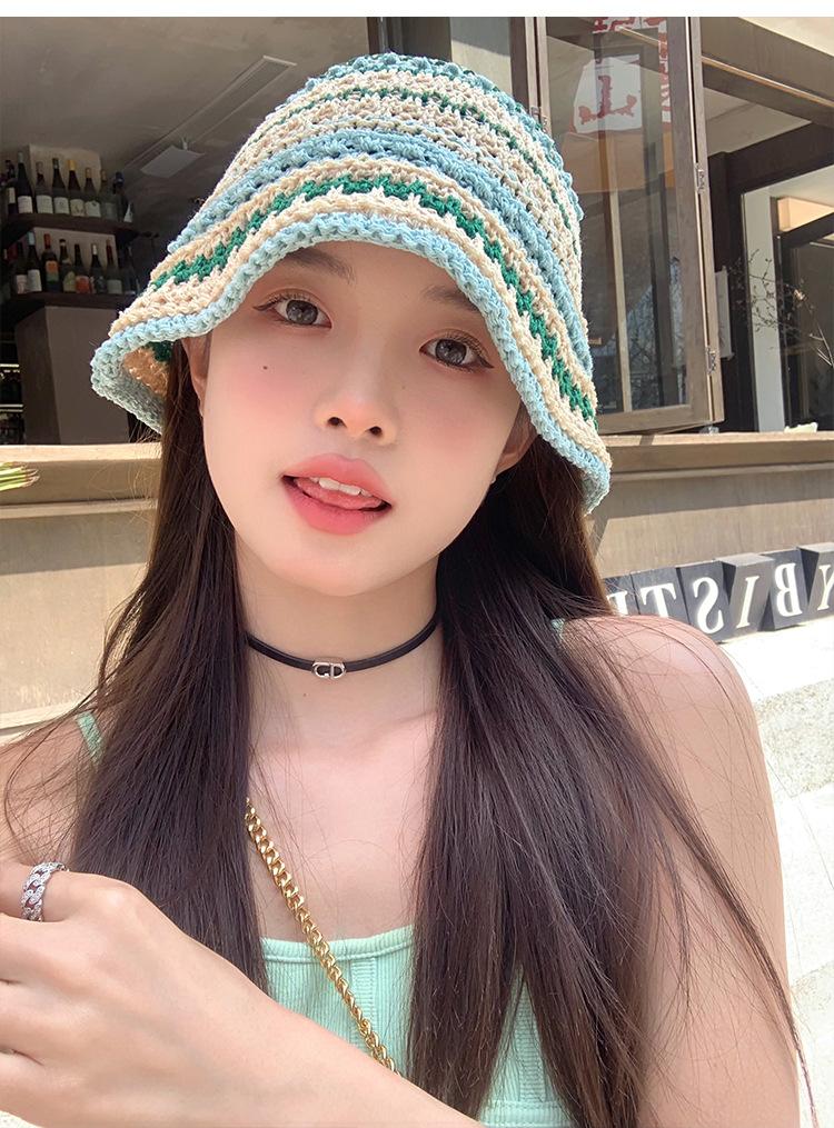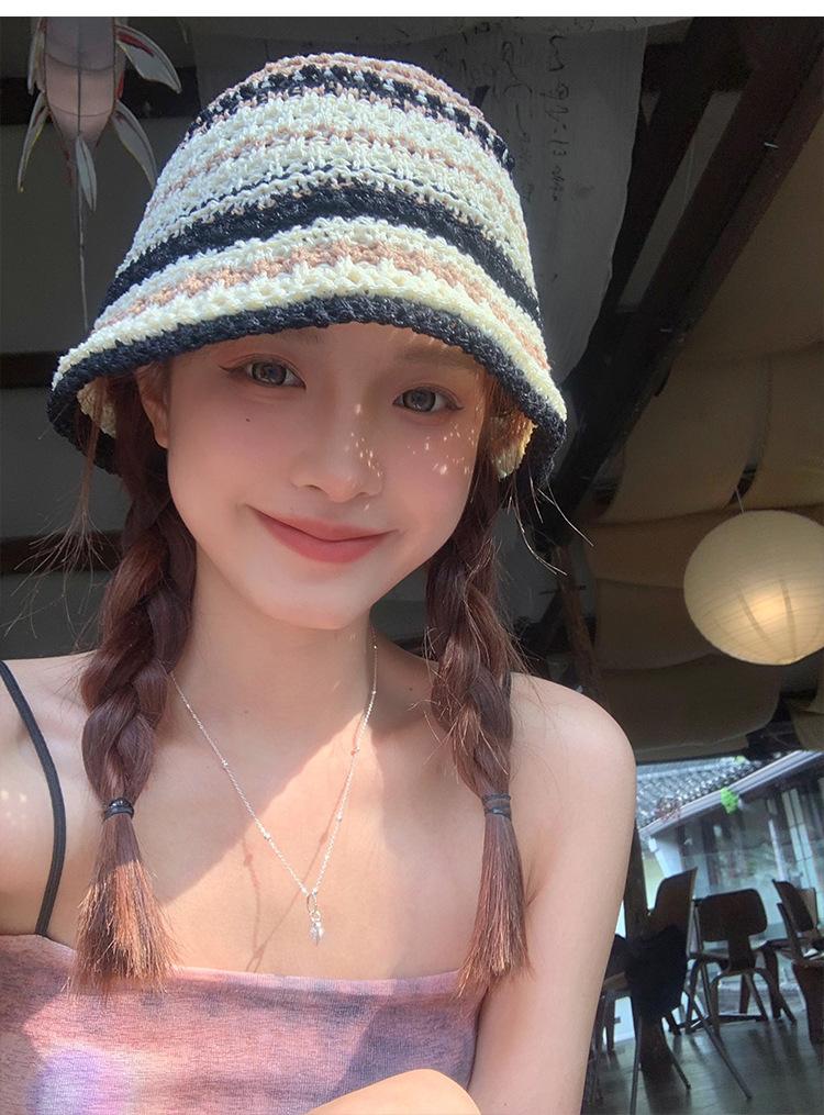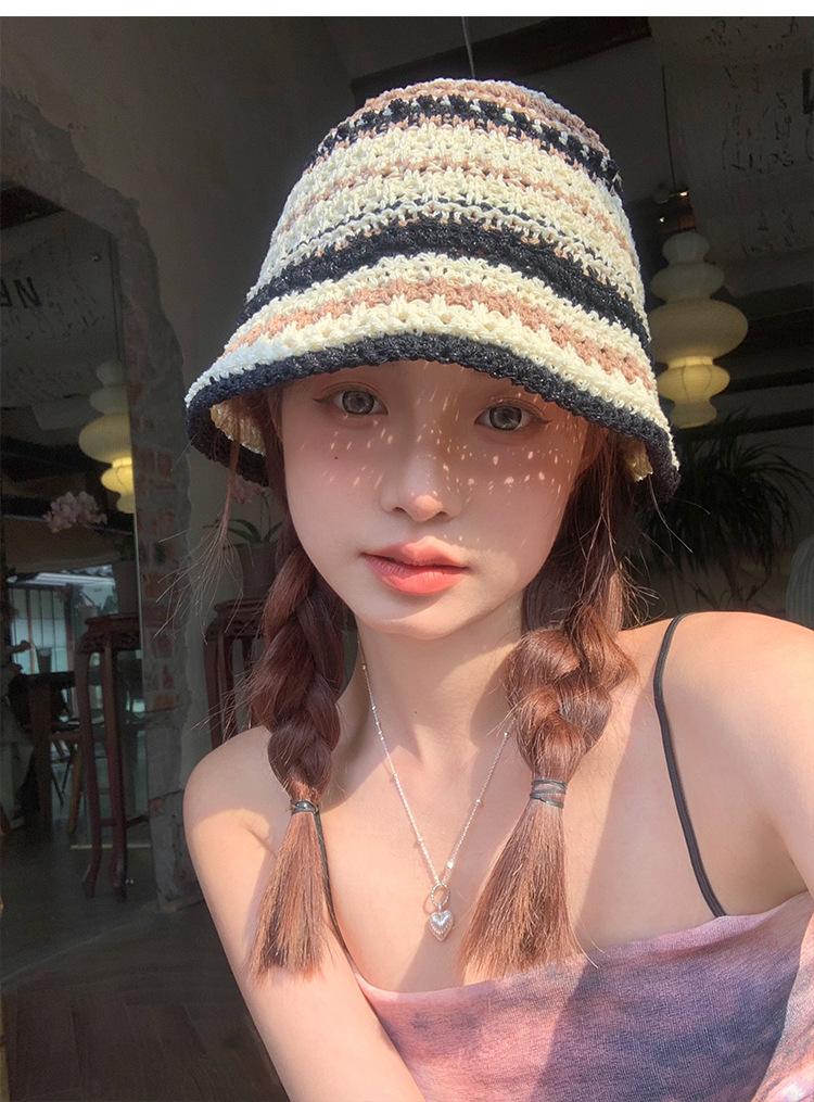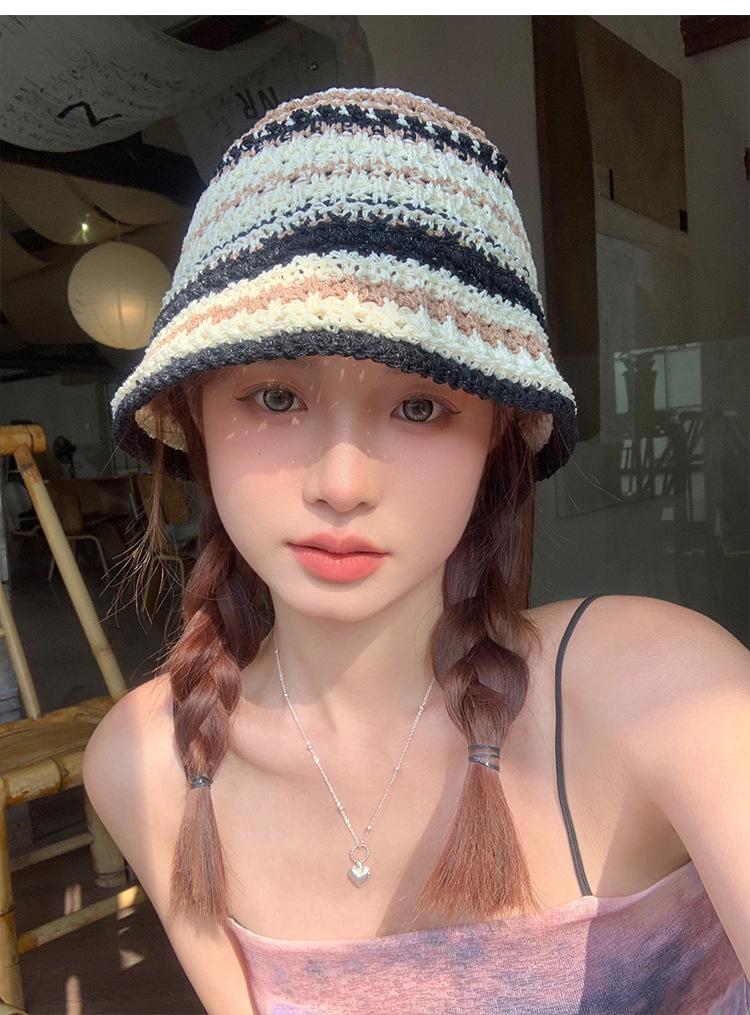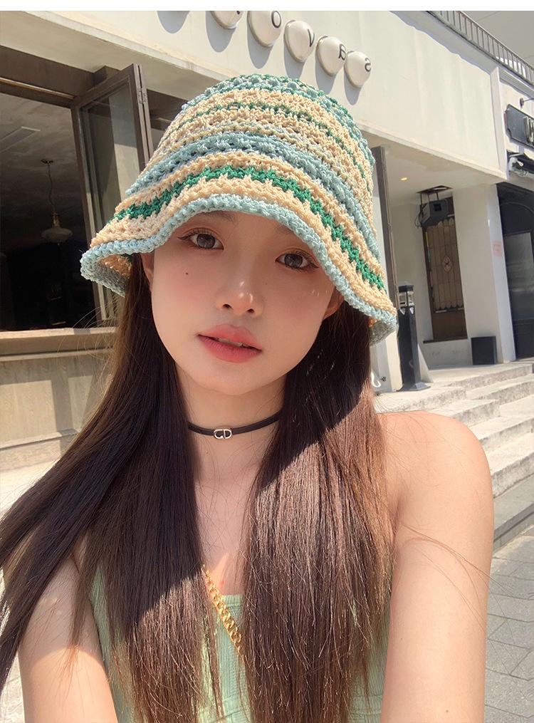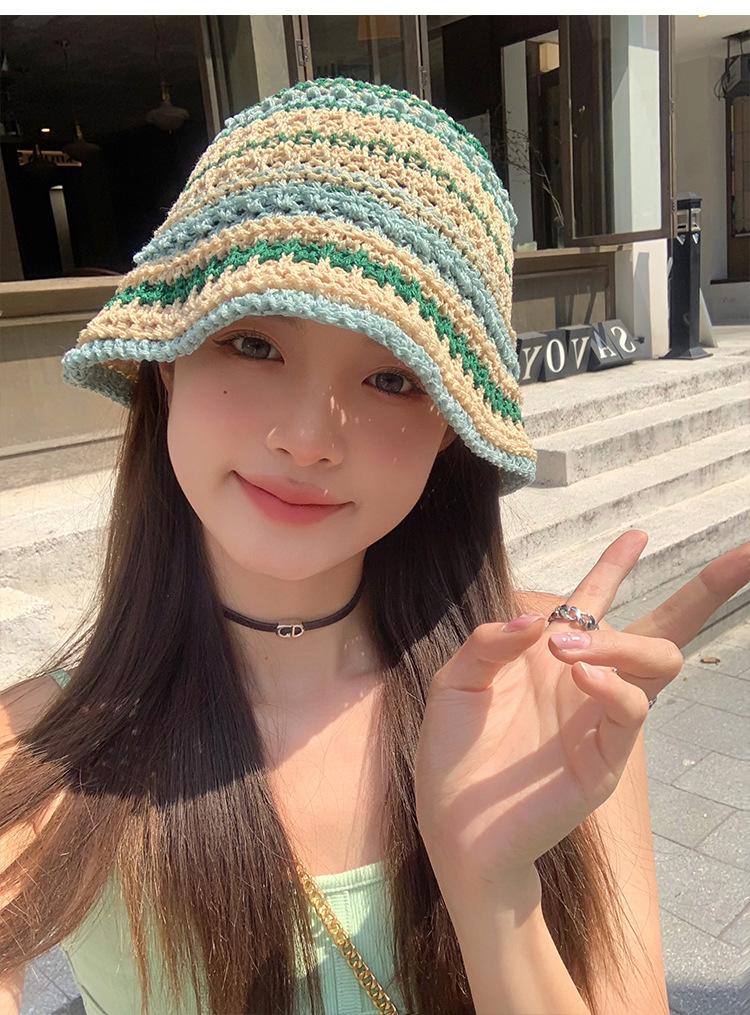 2025 Nuevo Estilo Sombrero de Cubo Tejido a Rayas con Bloque de Color Calado Sombrero de Protección Solar Sombrero para el Sol para Mujer