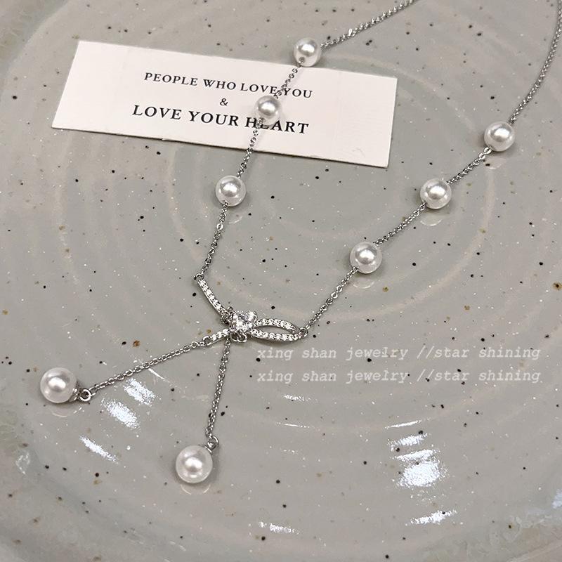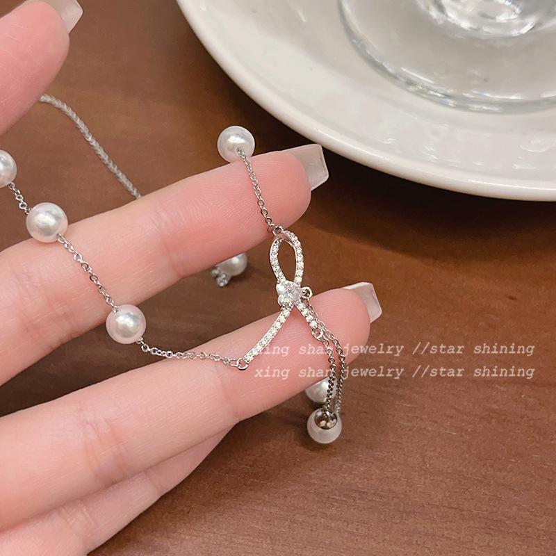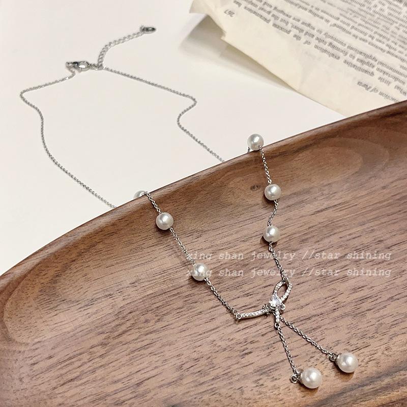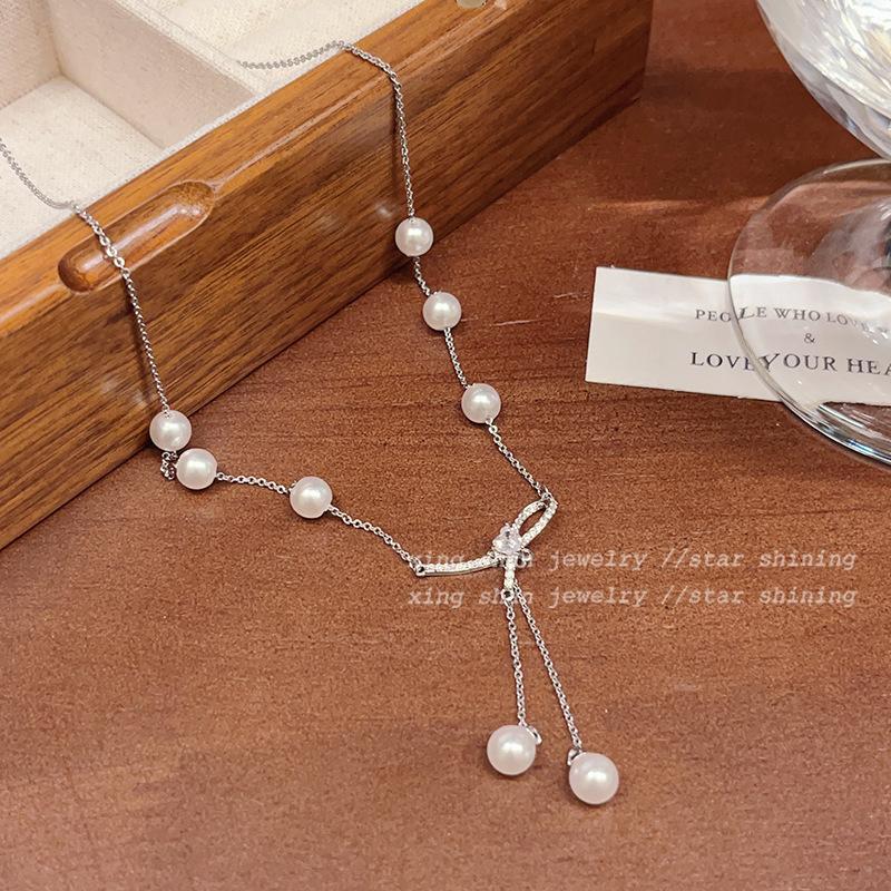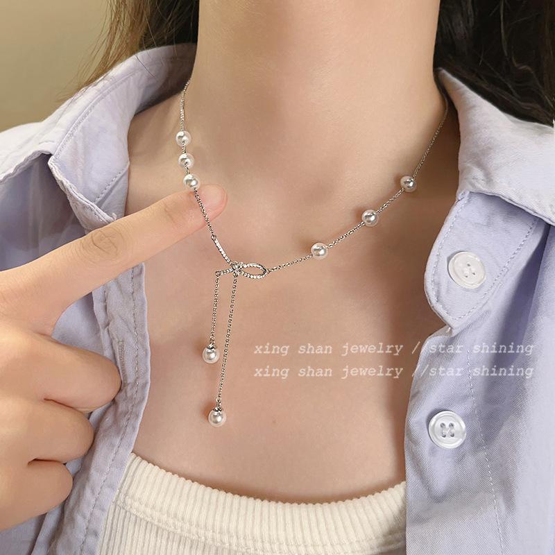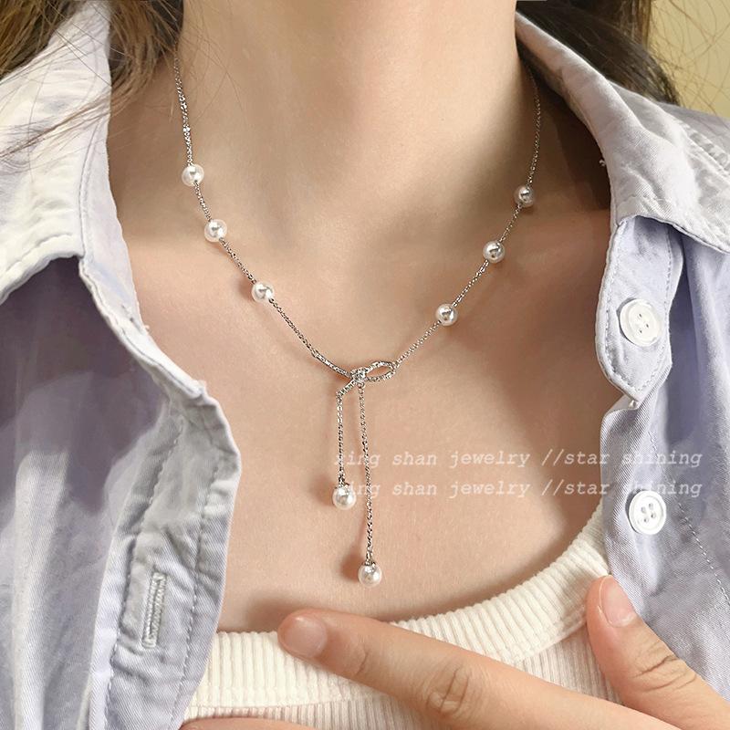 Collar con borlas de perlas y lazo para mujer, diseño de collar decorativo de nicho de lujo ligero, cadena de clavícula francesa de alta calidad
