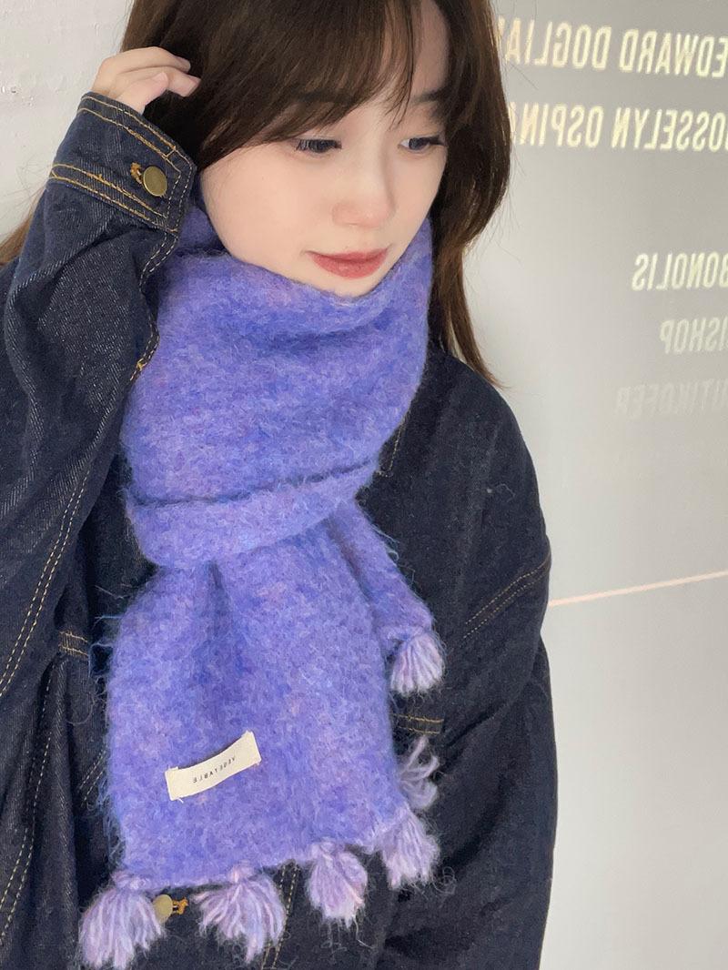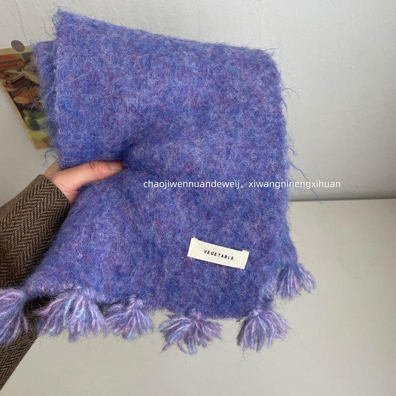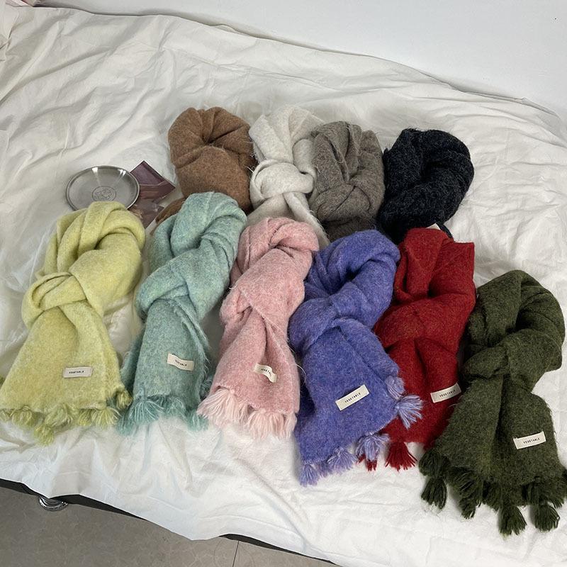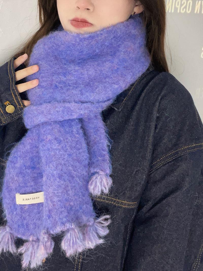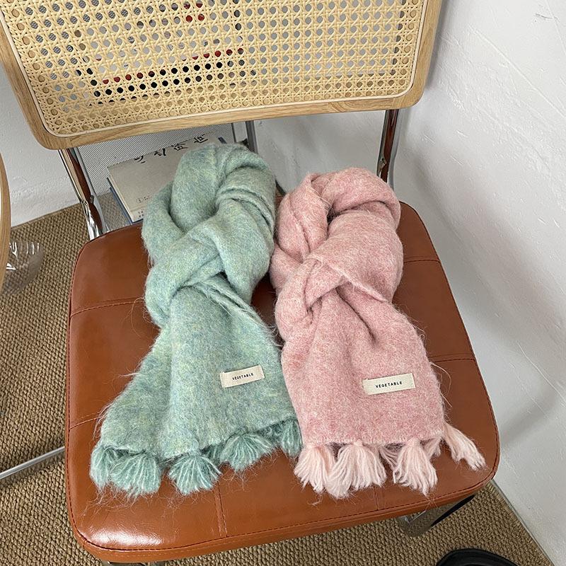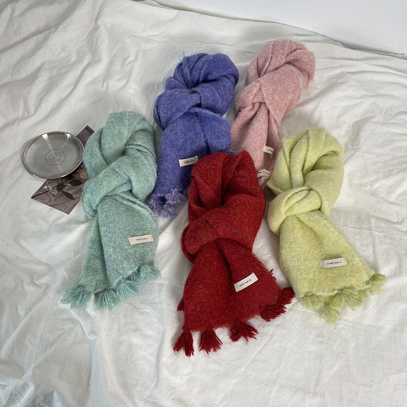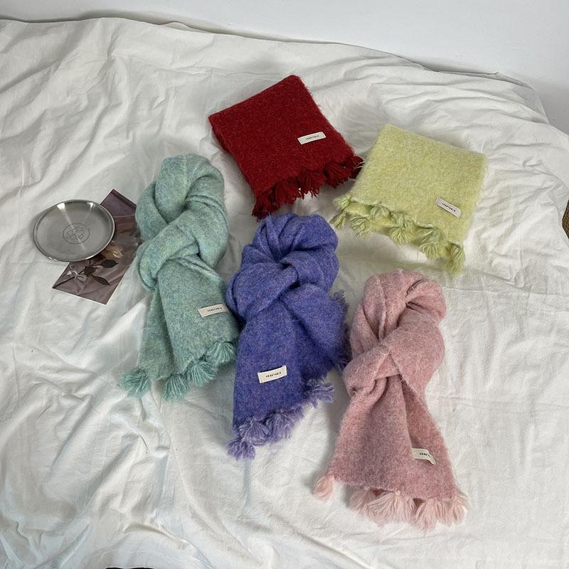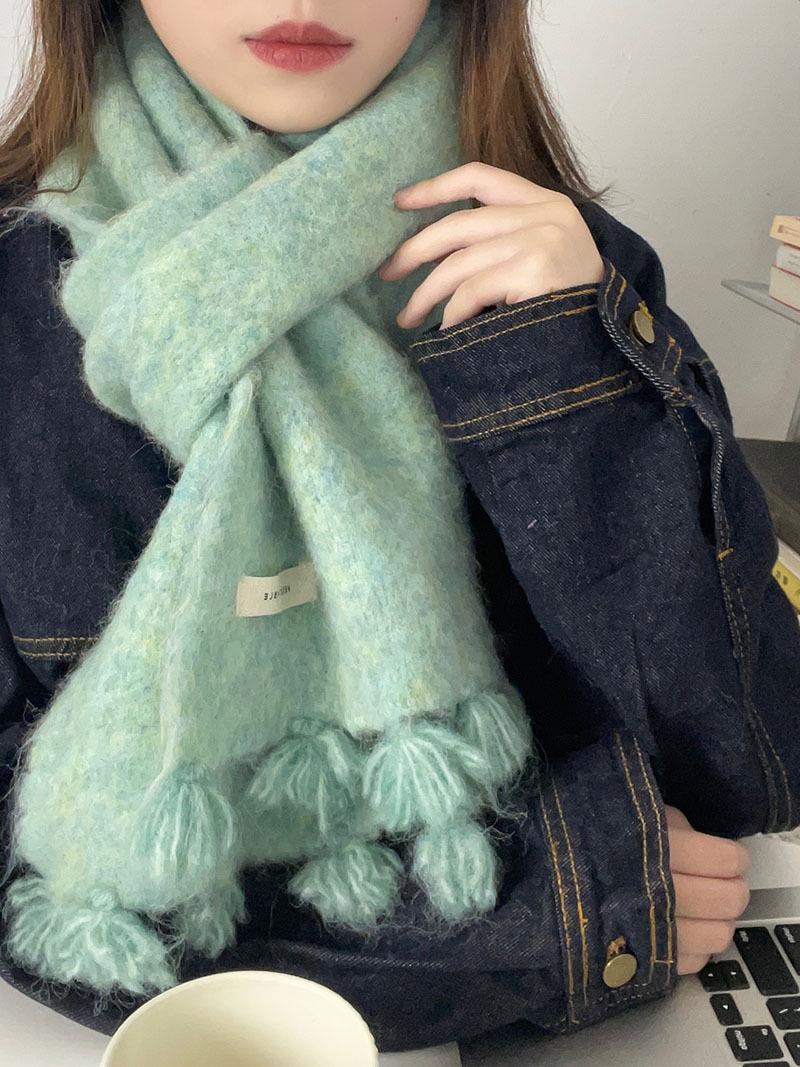 Bufanda de lana cálida para mujer, tejida a mano con borlas de barba de color dopamina de colores, mezcla de lana a rayas, para otoño e invierno.