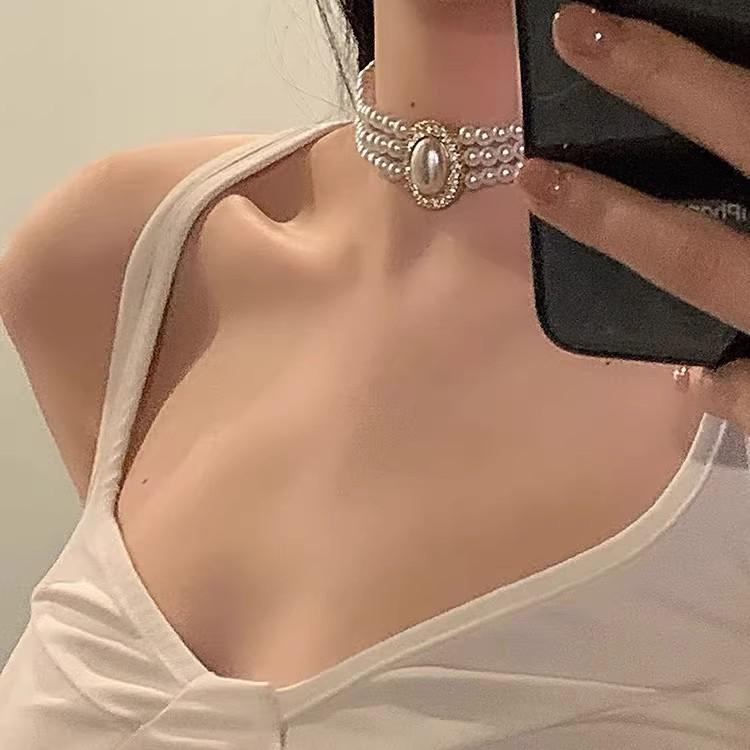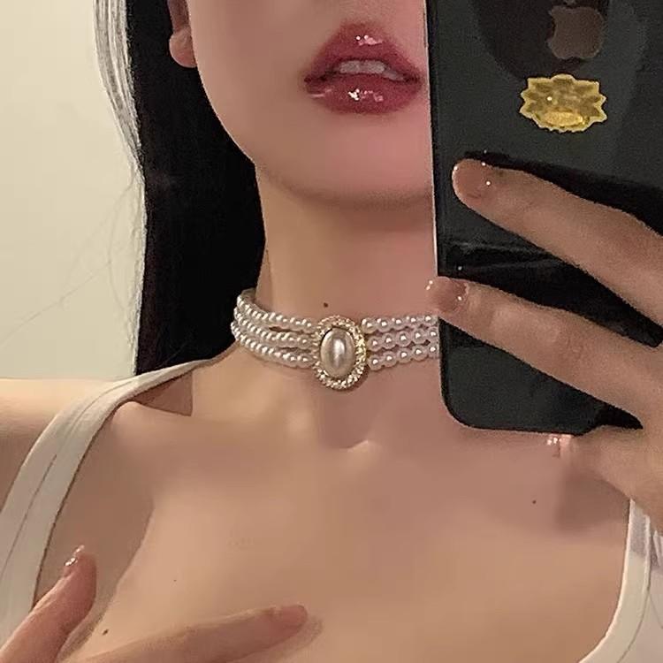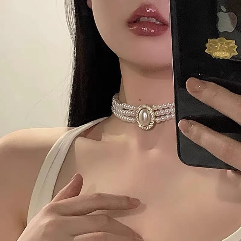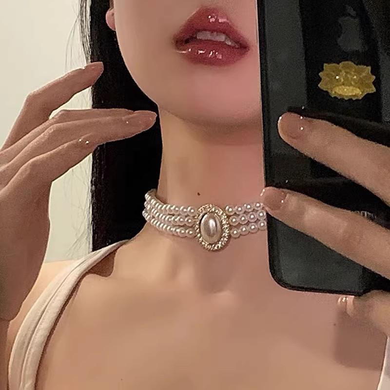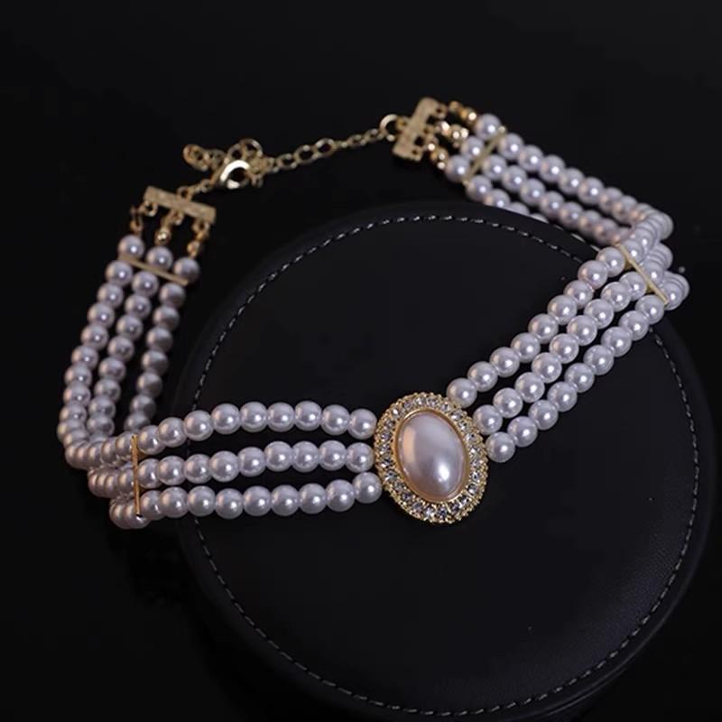 Collar de perlas de tres capas de lujo vintage para mujer, elegante gargantilla de cadena para clavícula, para vestido de novia o boda