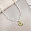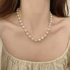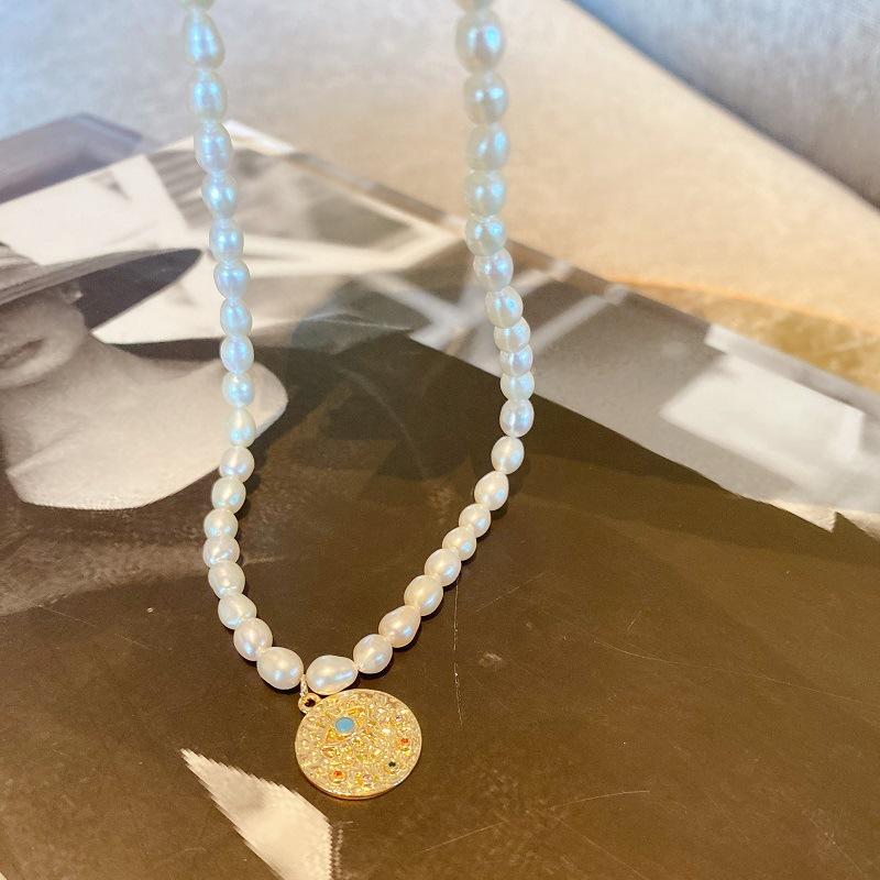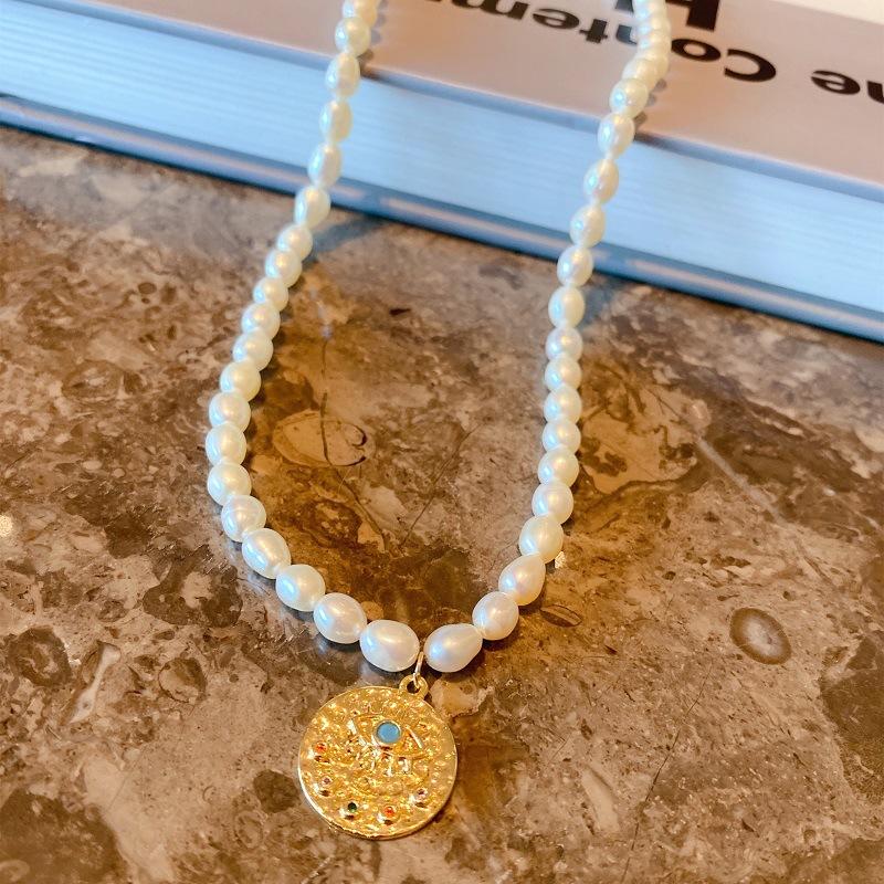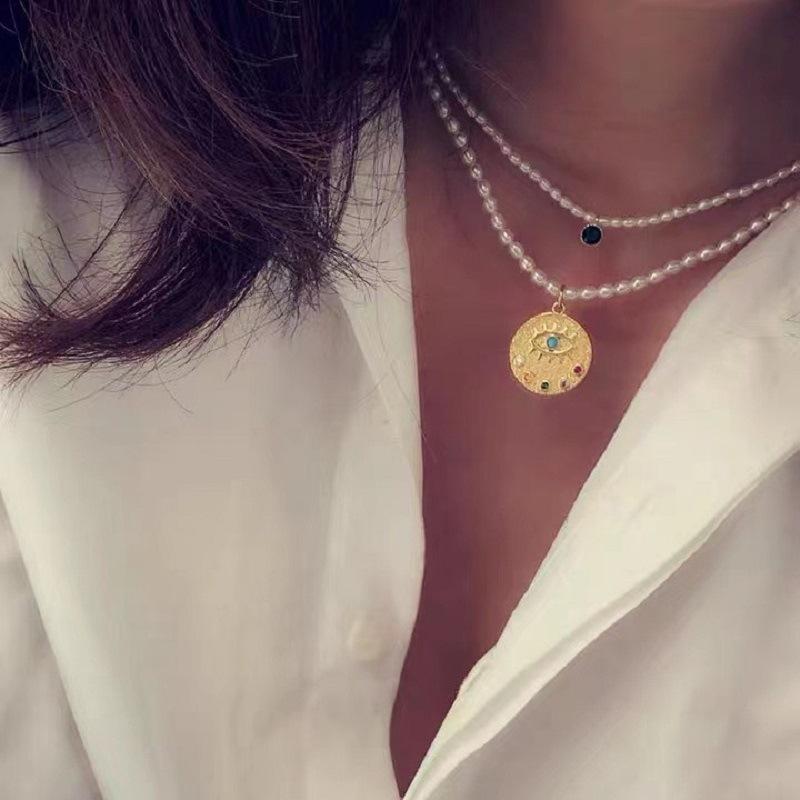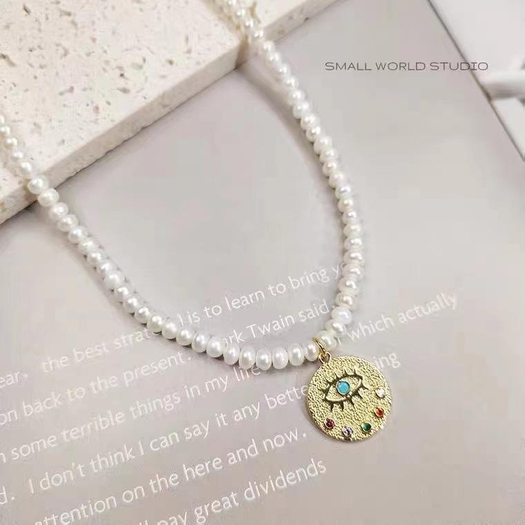 Collar de perlas naturales de agua dulce de lujo ligero europeo y americano para mujer Lirio Blanco mismo estilo alto sentido colgante de ojo moneda de oro cadena clavicular