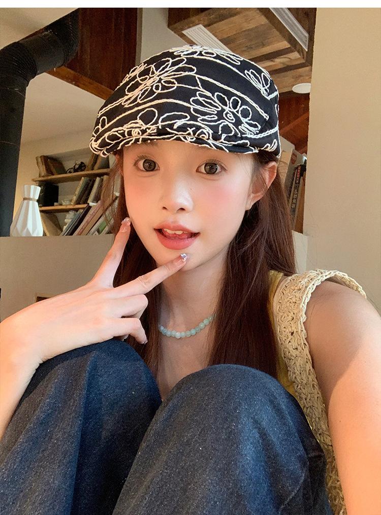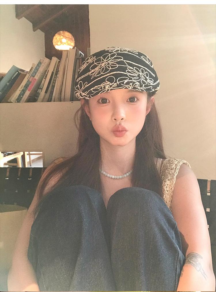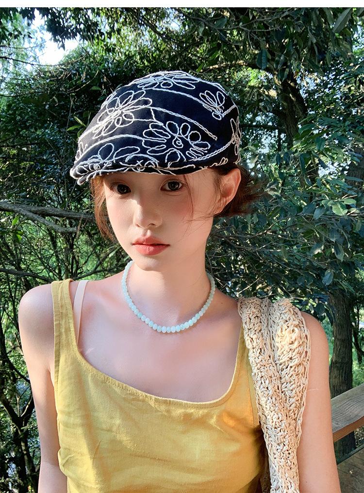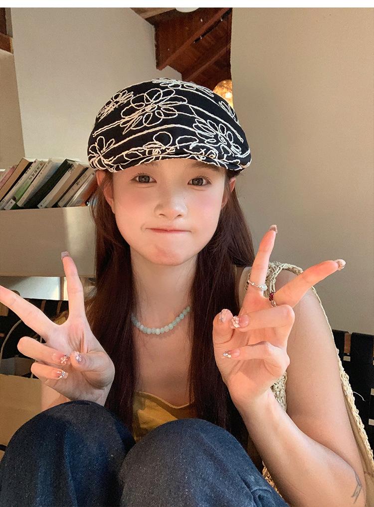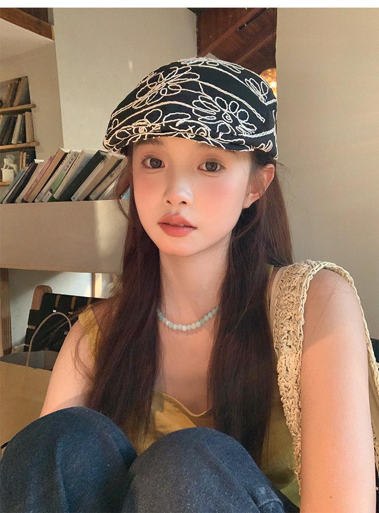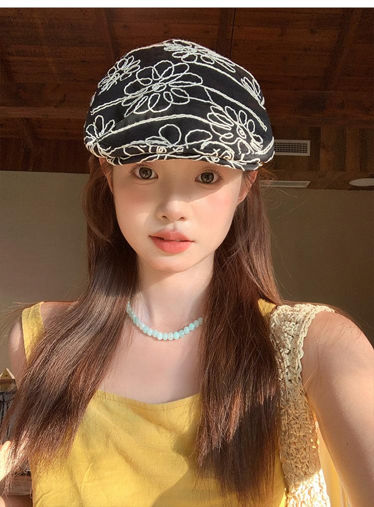 Sombrero Avanzado de Estilo Japonés Nuevo para Mujer Verano Jacquard Sombrero Negro Casual Combinable Rostro Mostrado Boina Pequeña Sombrero de Pintor Bordado