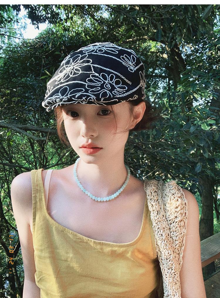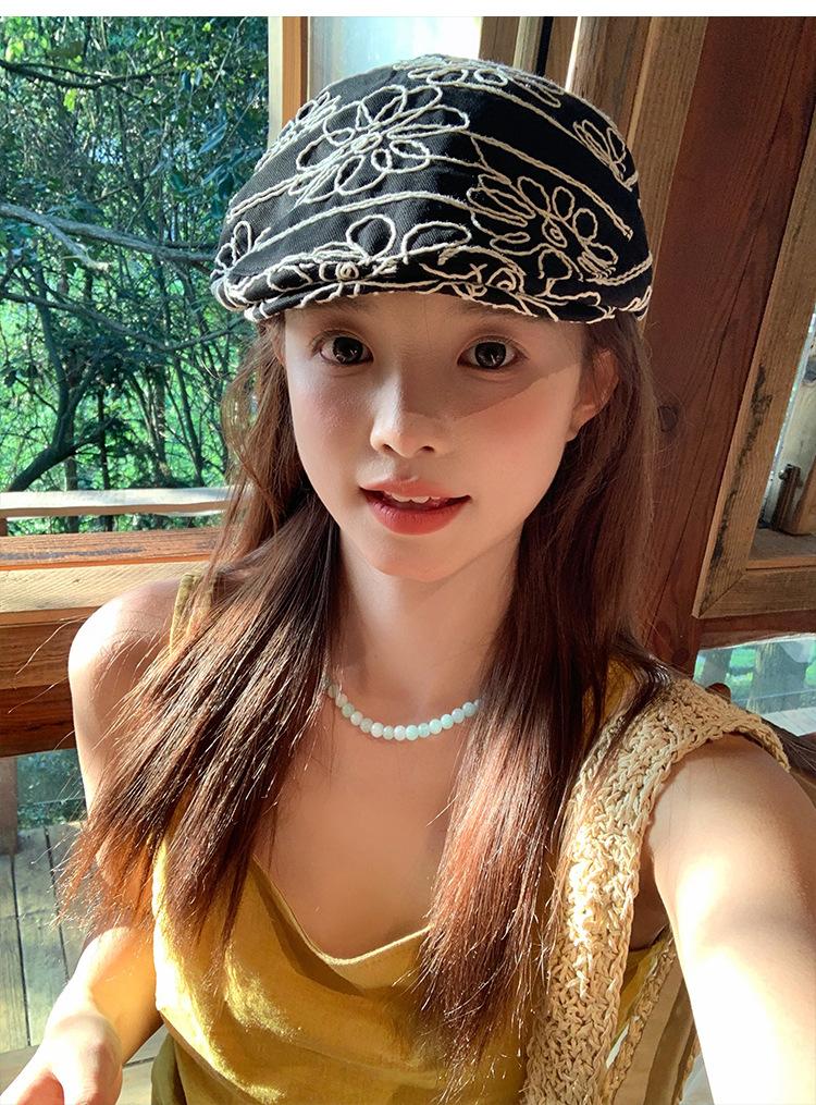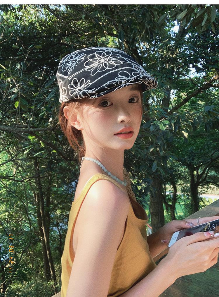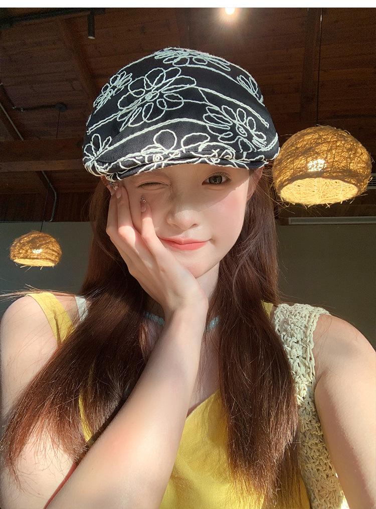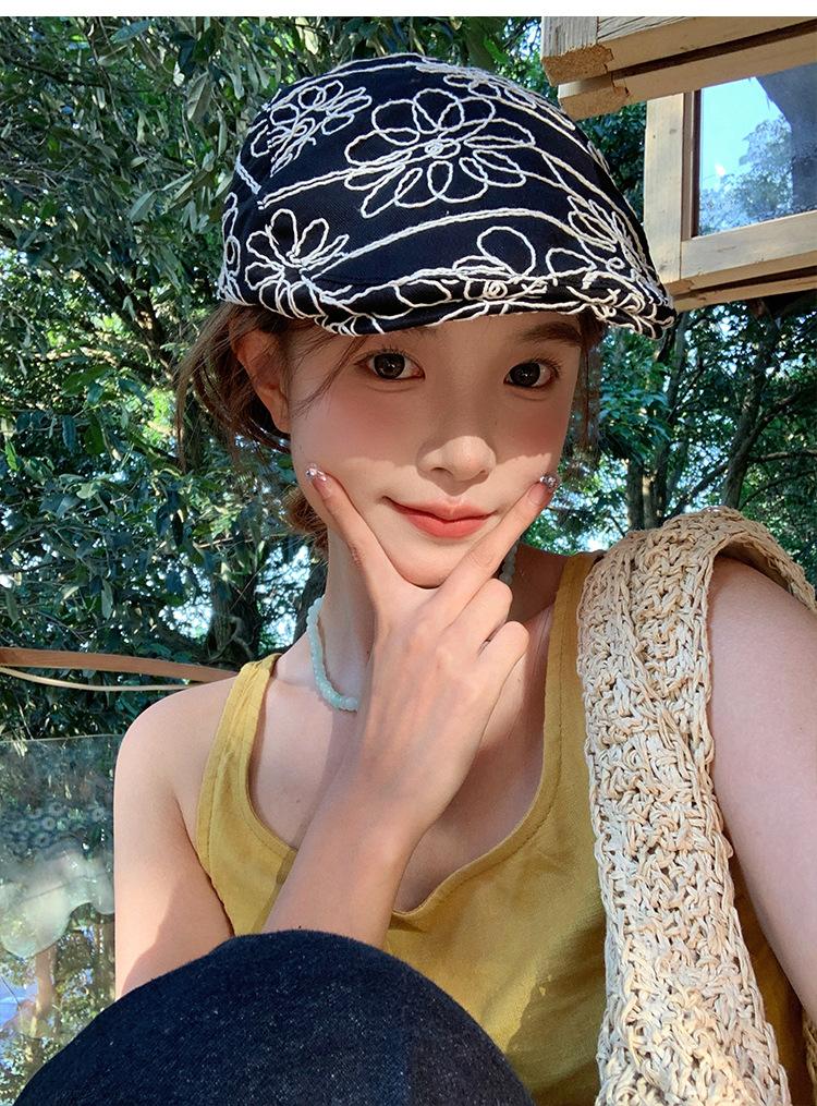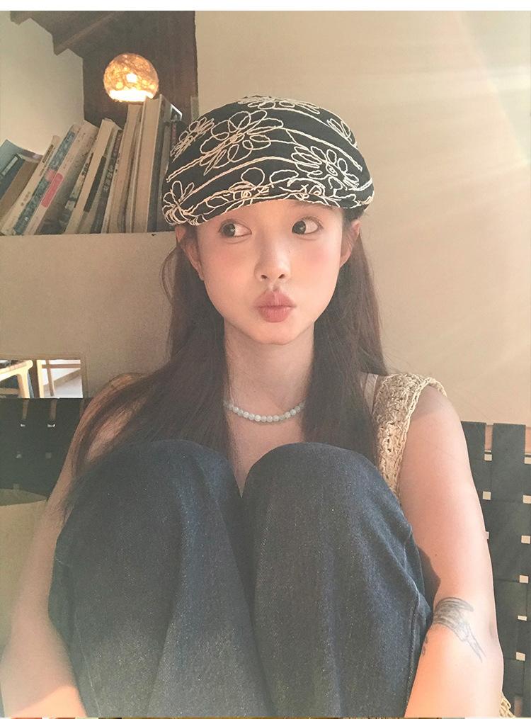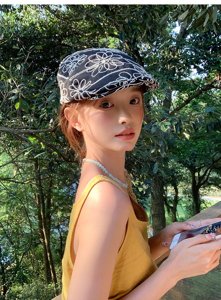Sombrero Avanzado de Estilo Japonés Nuevo para Mujer Verano Jacquard Sombrero Negro Casual Combinable Rostro Mostrado Boina Pequeña Sombrero de Pintor Bordado