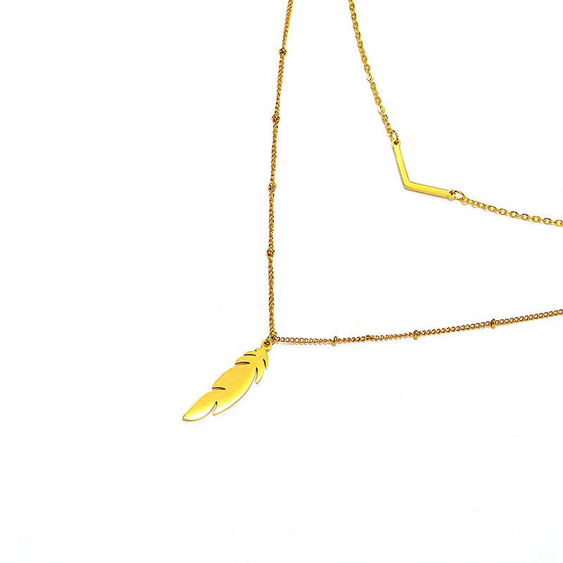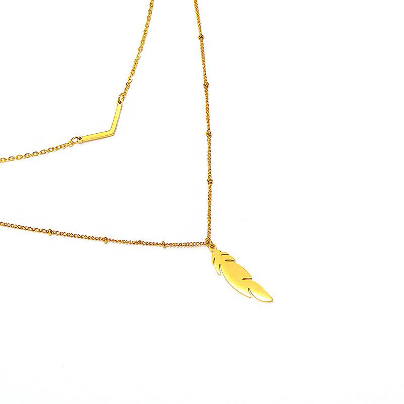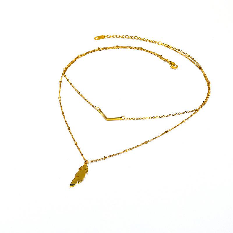 Collar de moda coreano para mujer de doble capa de acero de titanio con diseño de nicho femenino de pluma de moda en V, cadena de clavícula de oro de 18 quilates