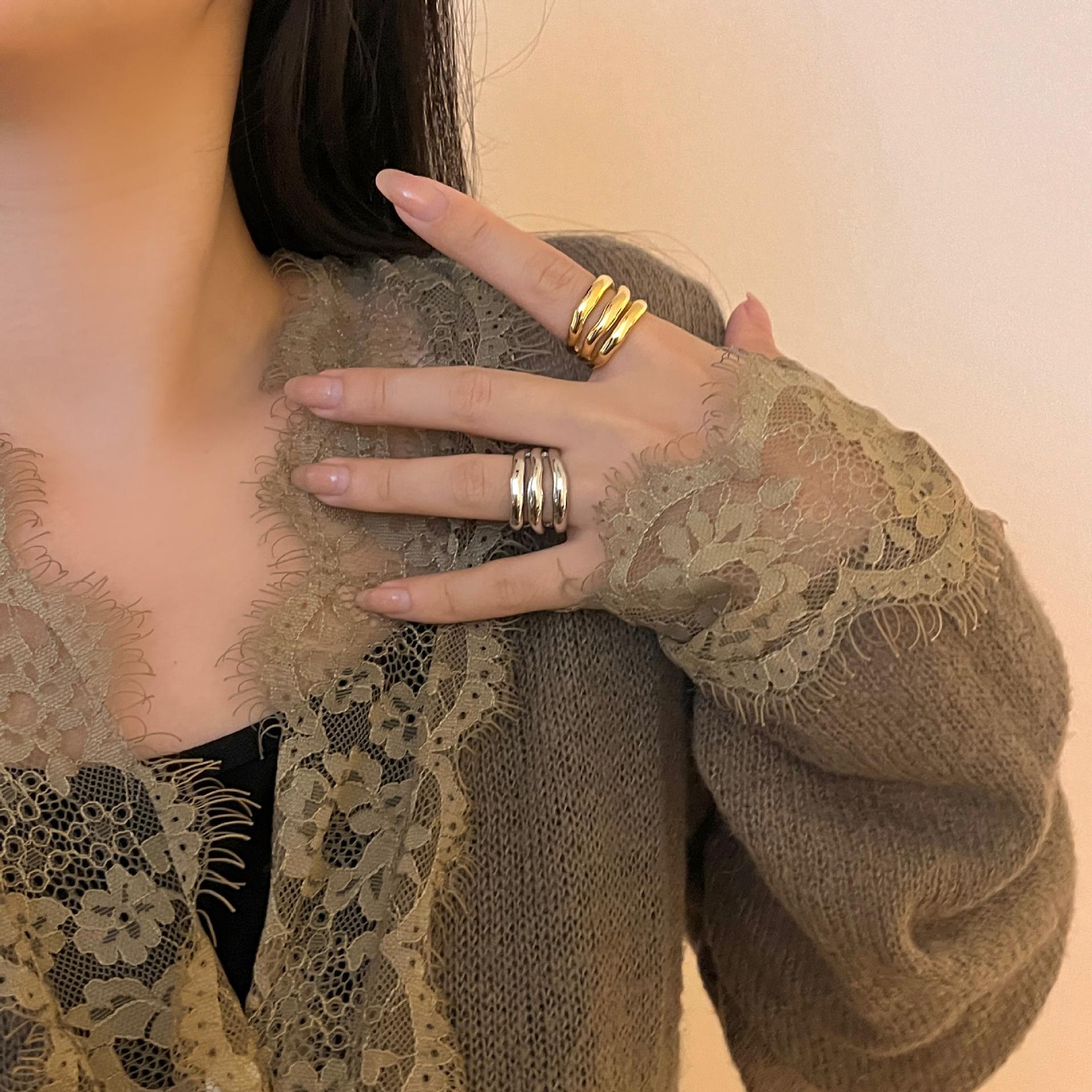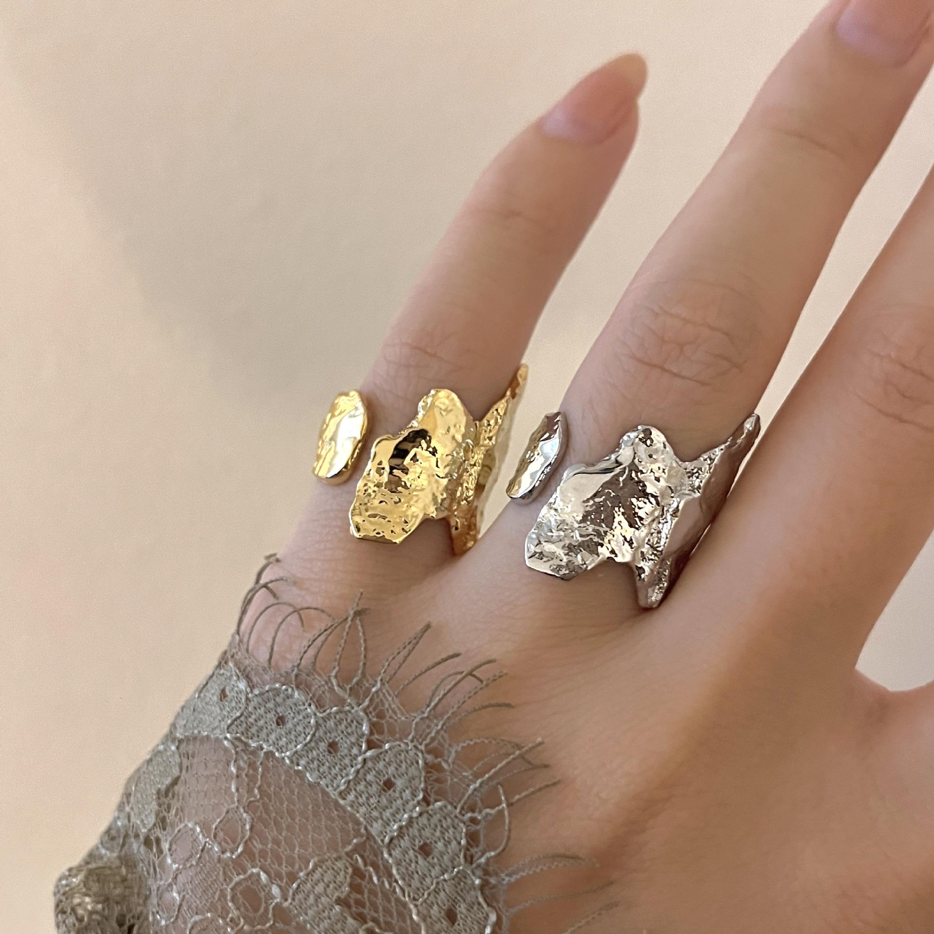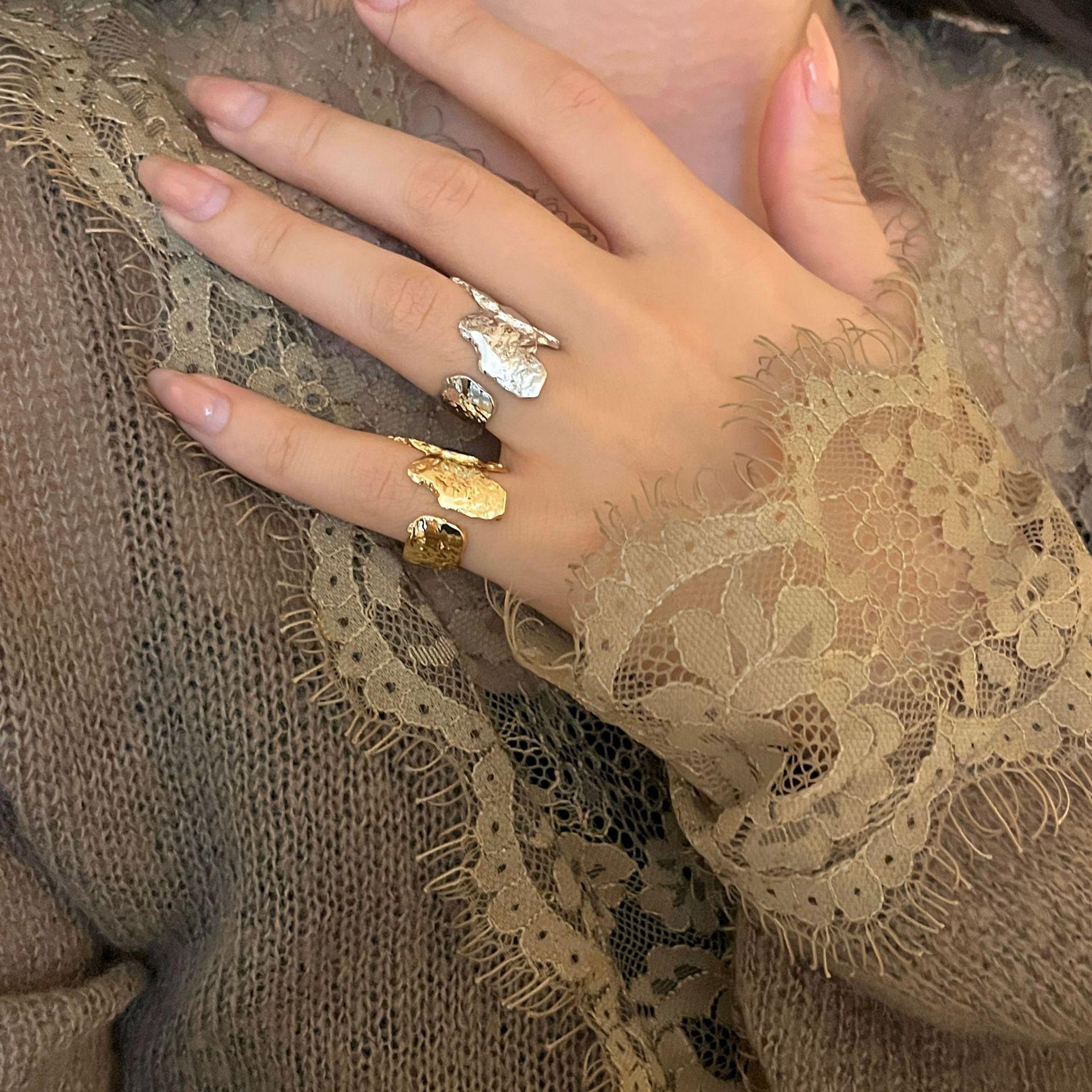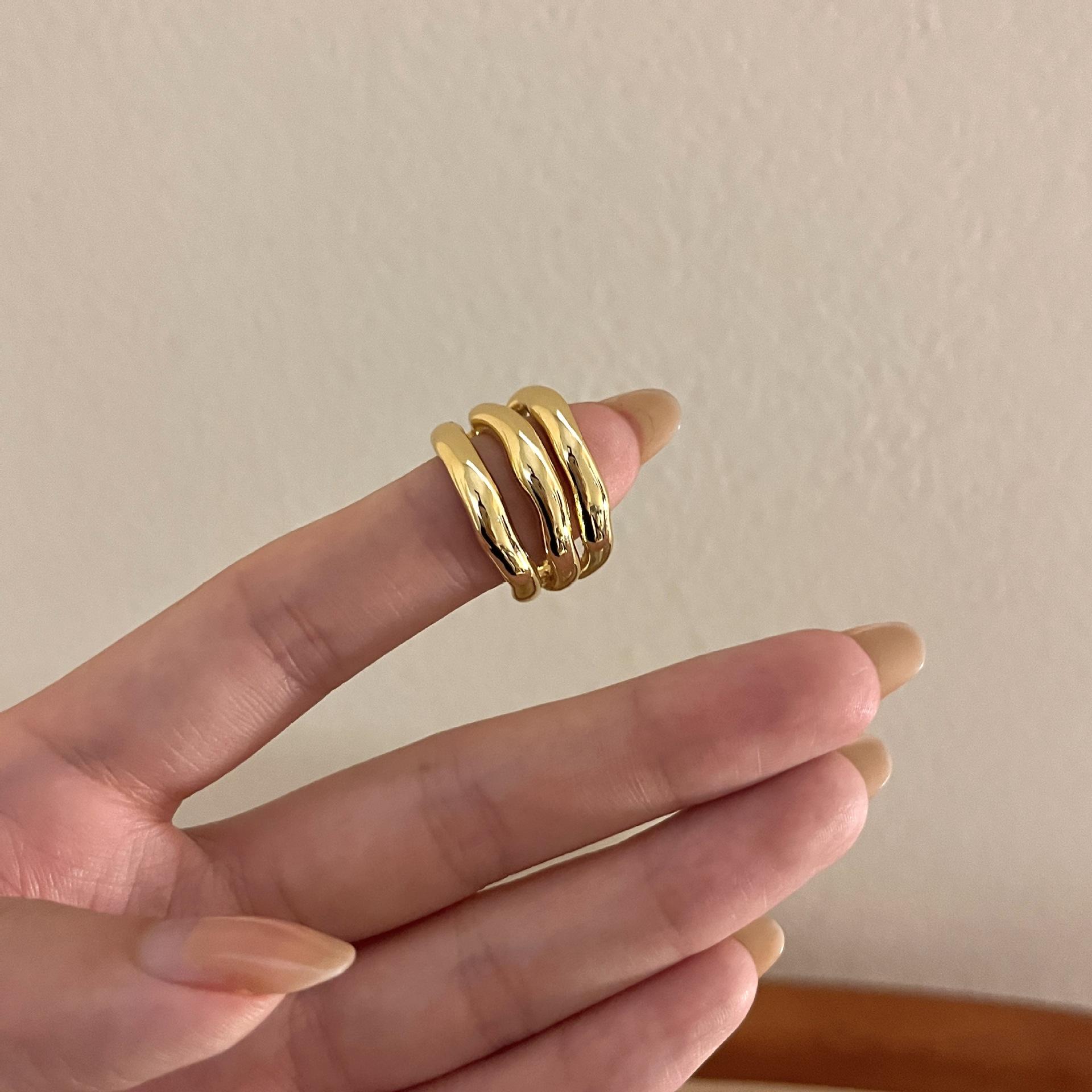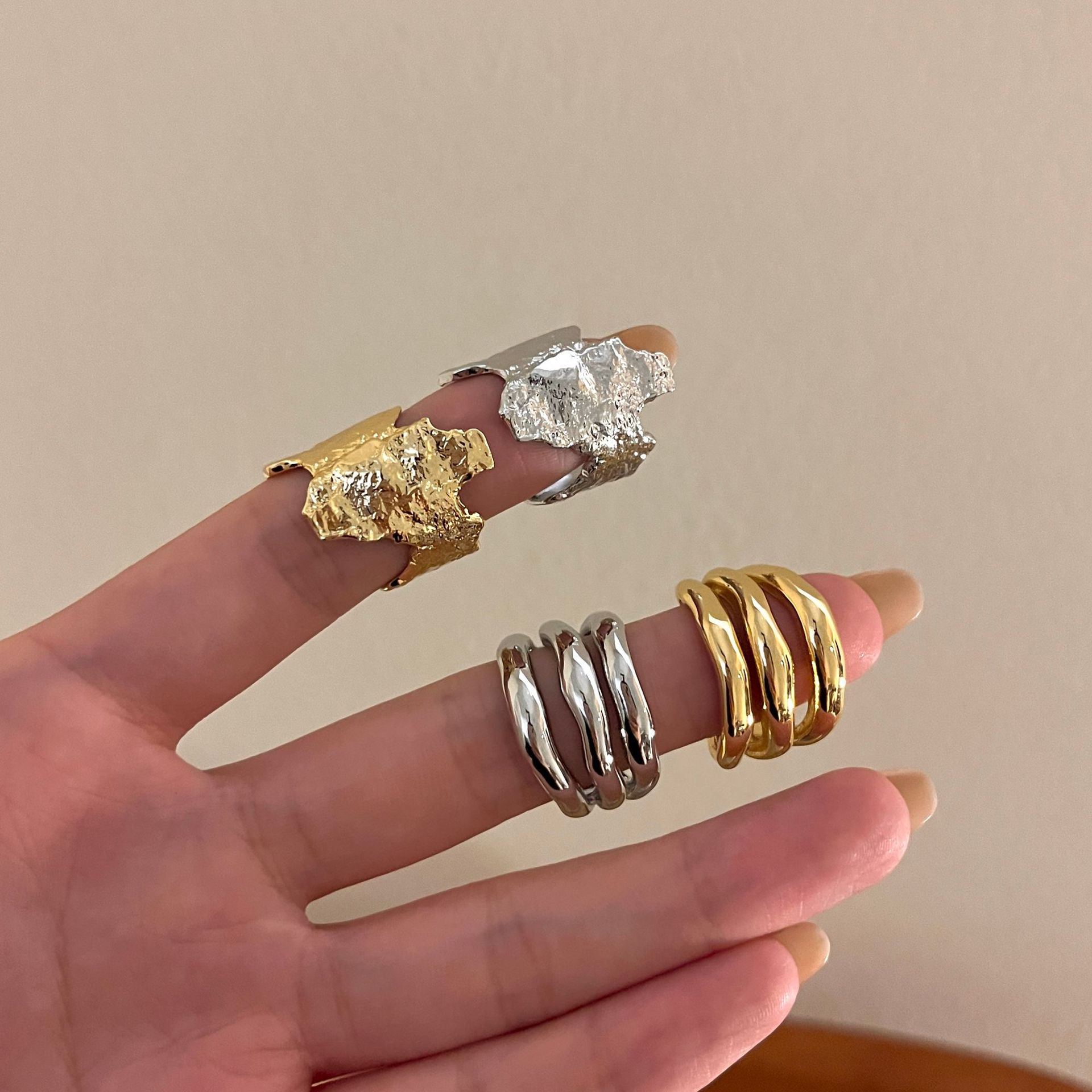 Anillo de apertura ancha con textura de lava irregular de oro auténtico bañado en cobre, estilo europeo y americano, anillo de onda de tres capas.
