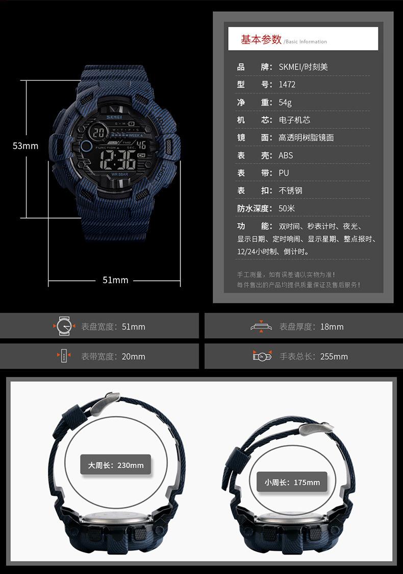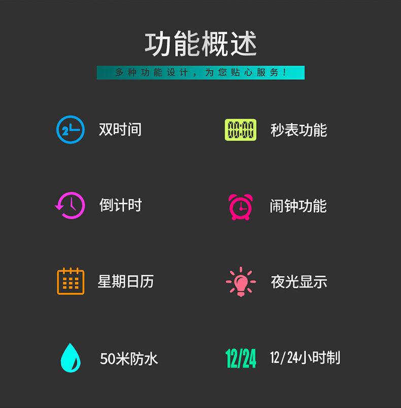 Double time, stopwatch timing, luminous, display date, timing noise, Display Week, hour, 12/24 hour system, Countdown