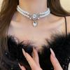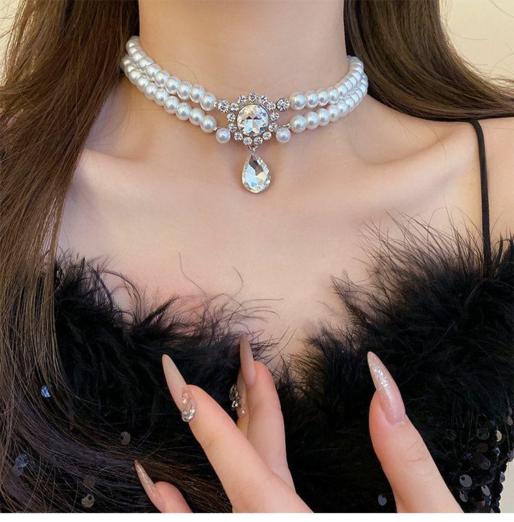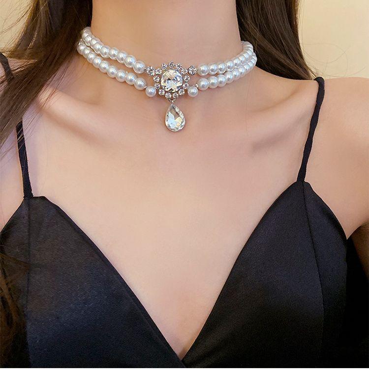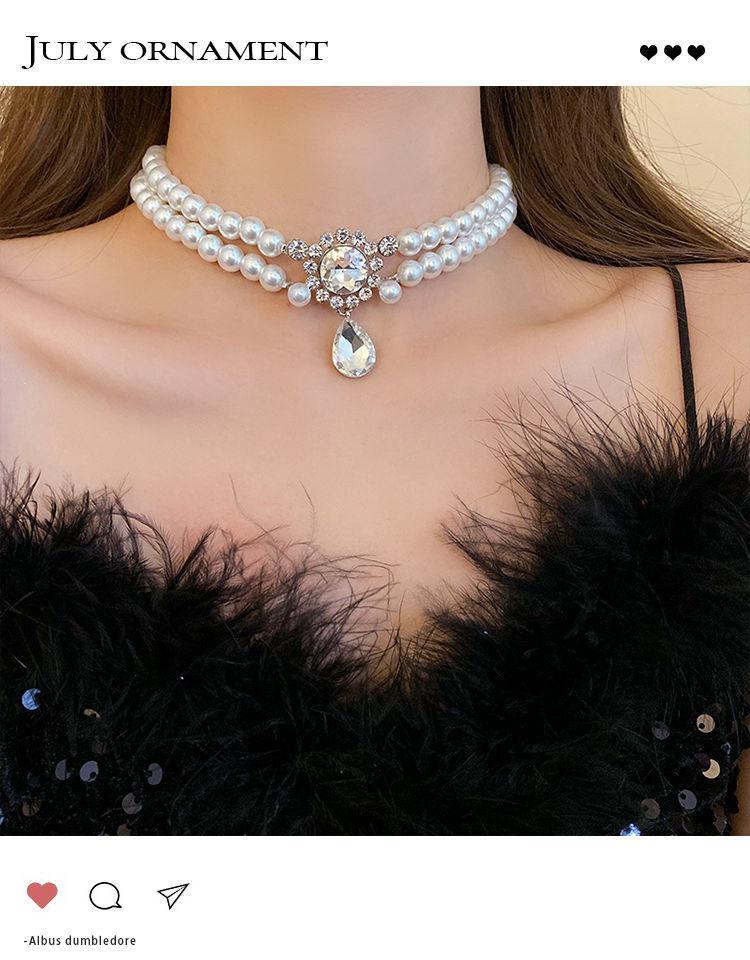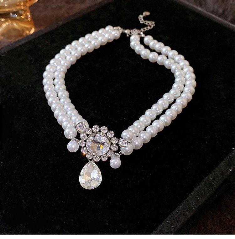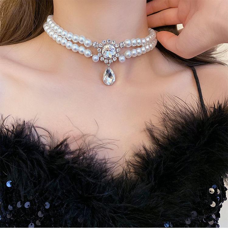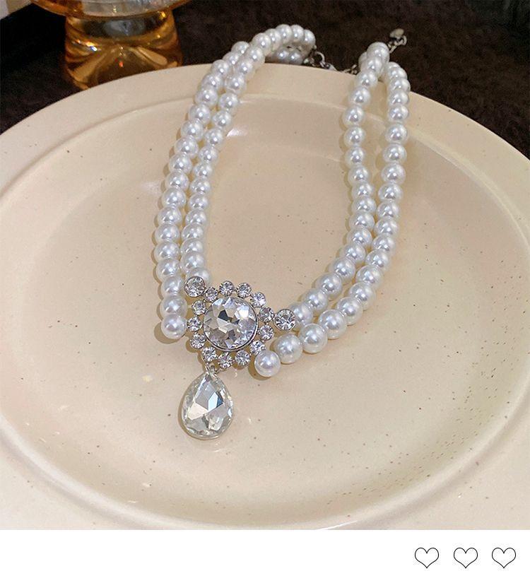 Diamond-encrusted teardrop-shaped double-layer pearl necklace, Diamond-encrusted drip pearl double-layer neckl...