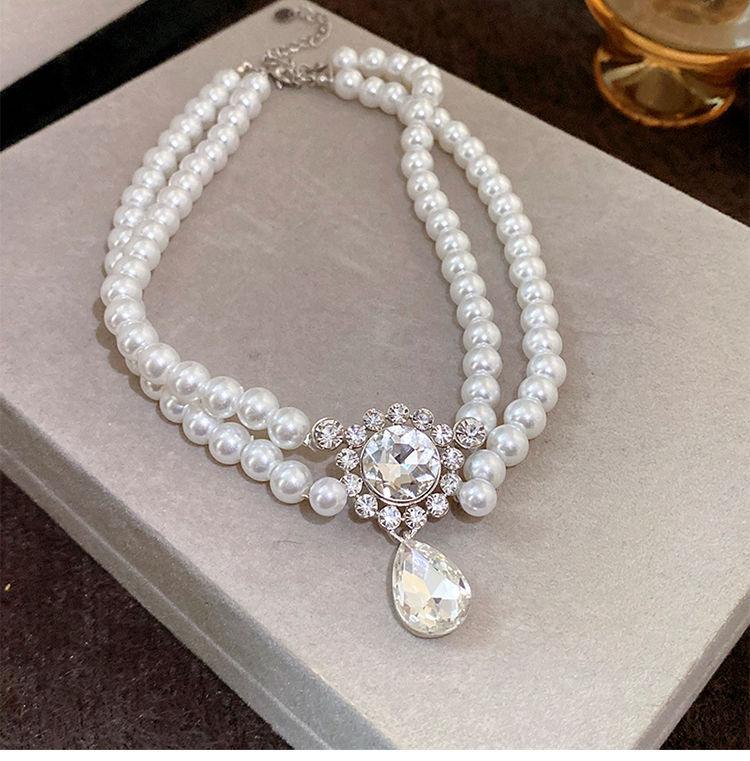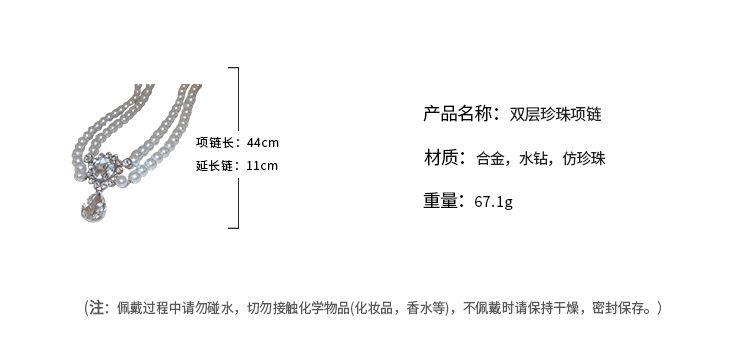 Diamond-encrusted teardrop-shaped double-layer pearl necklace