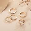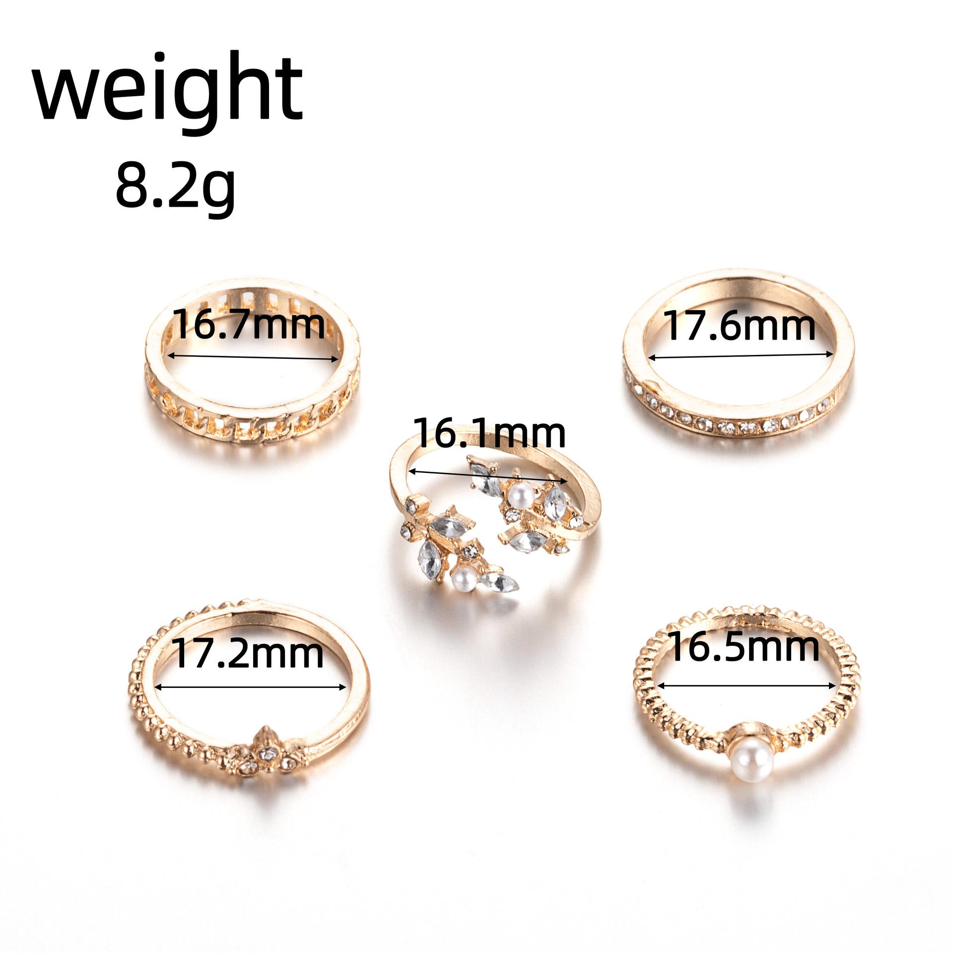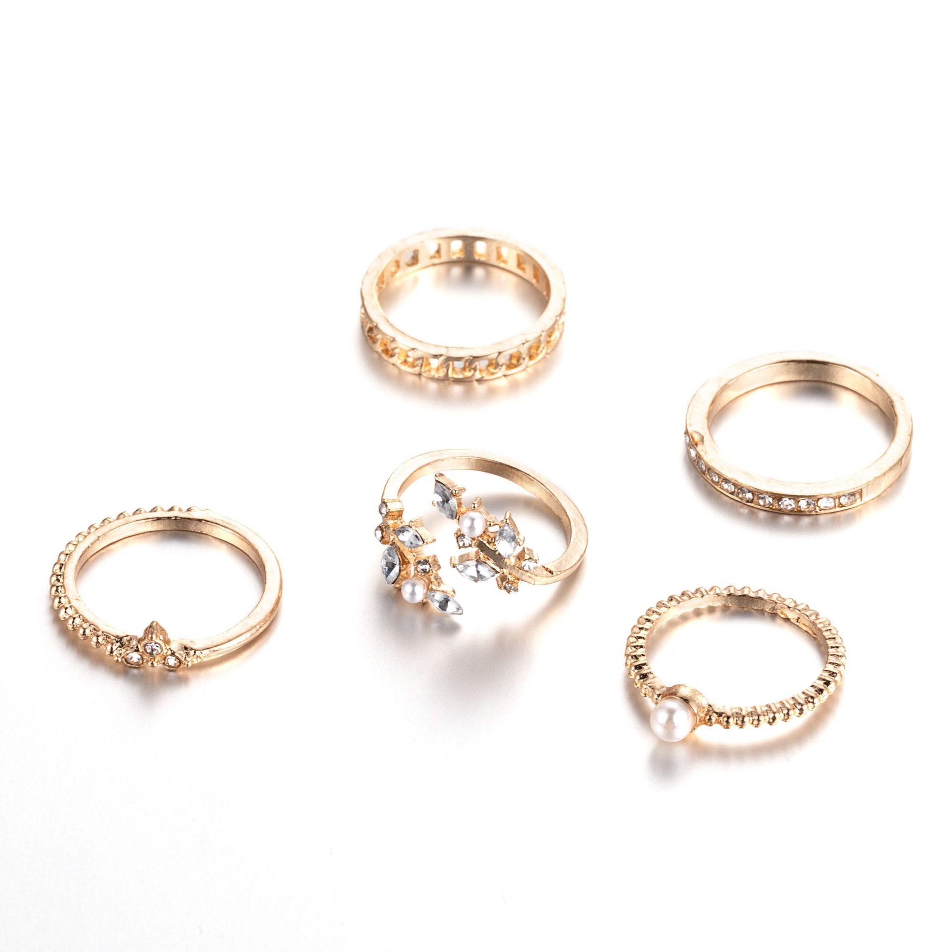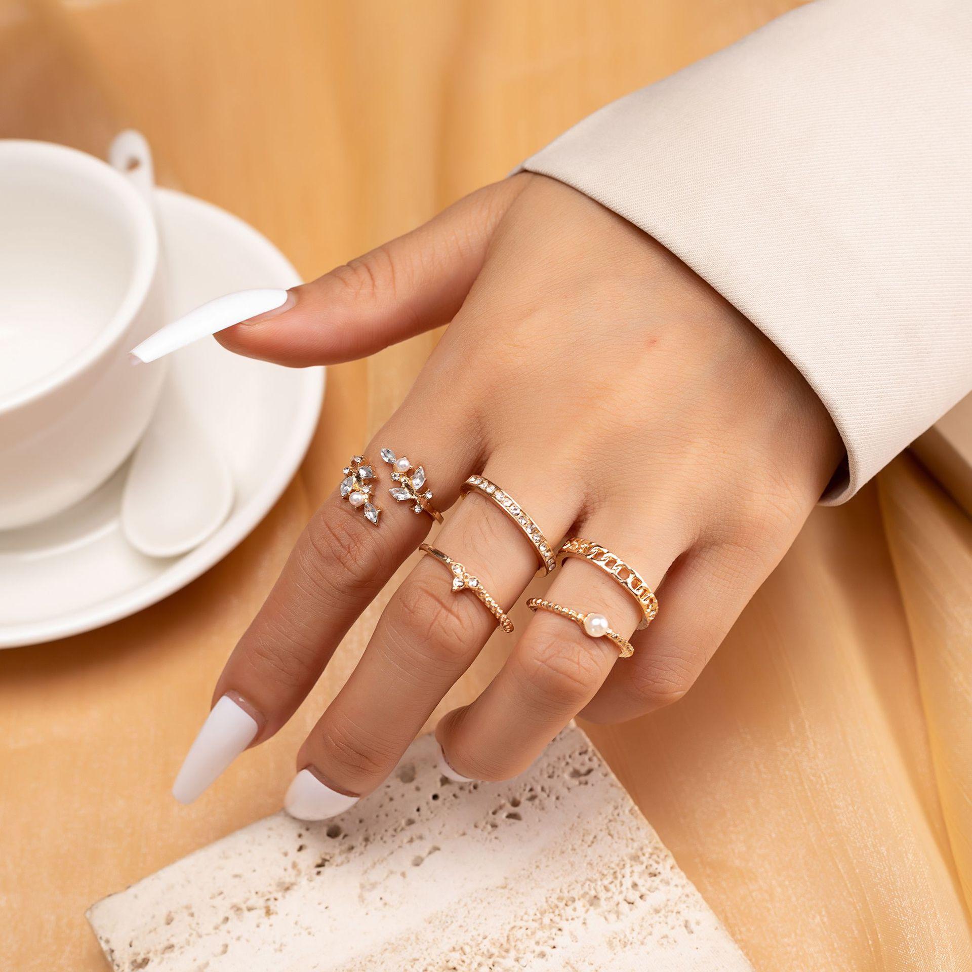 Nuevo anillo combinado de Amazon, moda europea y americana, con punta de perla, cadena de hojas de diamante, 5 piezas, anillo de traje para mujer, venta al por mayor