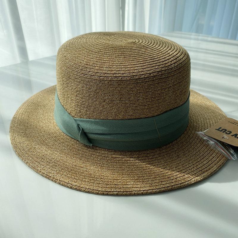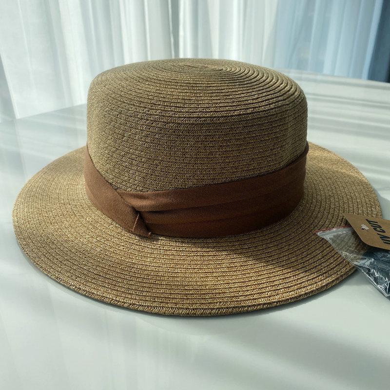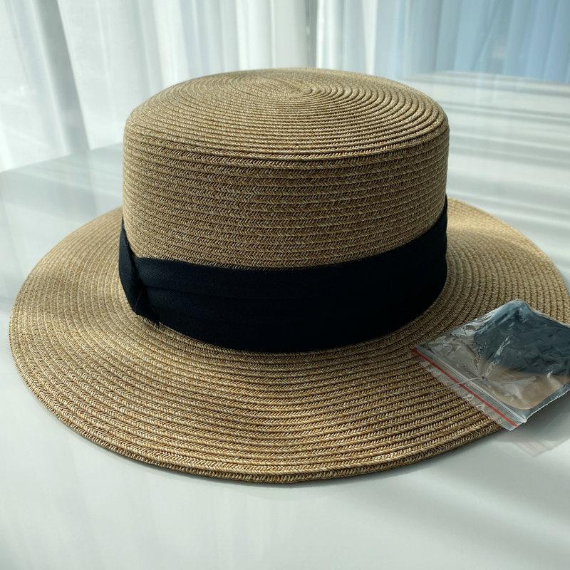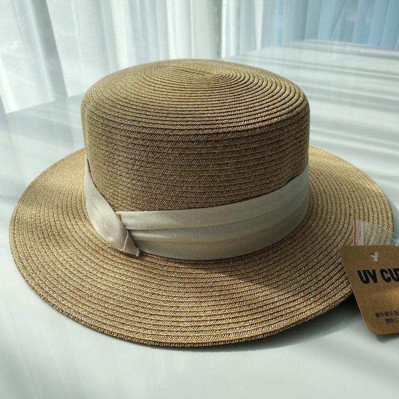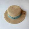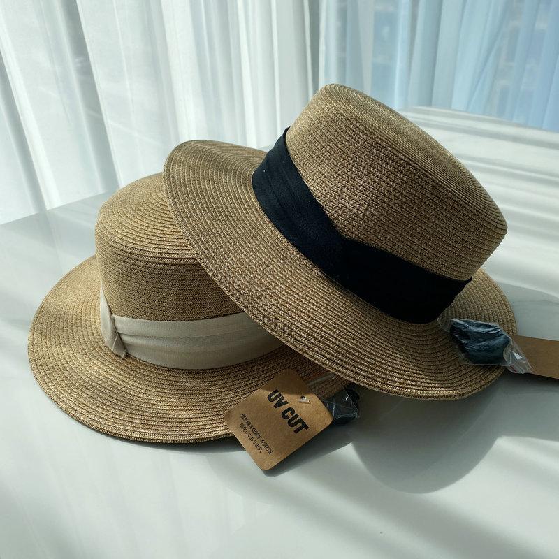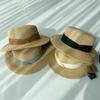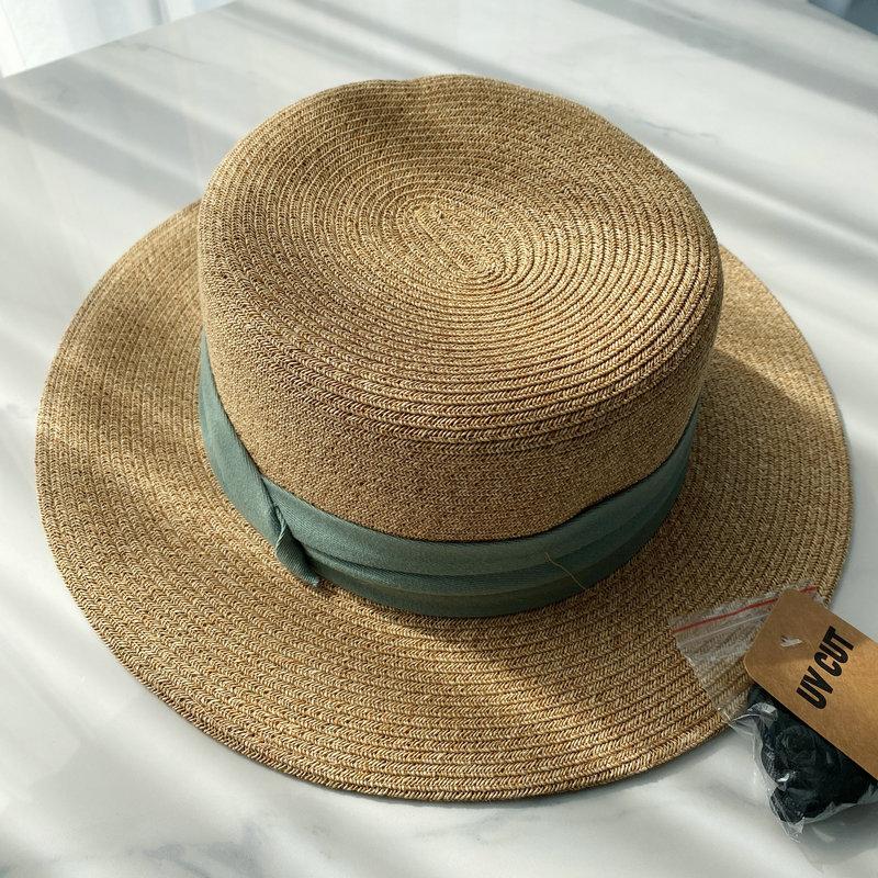 Sombrero de paja de ala plana con tres cintas dobladas para mujer, estilo coreano, para vacaciones en la playa, con borde grande, protector solar, combina con todo.