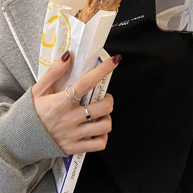 Anillo de Onda de Zircón Negro de Diseño Nicho Estilo Coreano para Mujer Moda Minimalista Lujo Ligero Doble Capa Comodín Anillo para Dedo