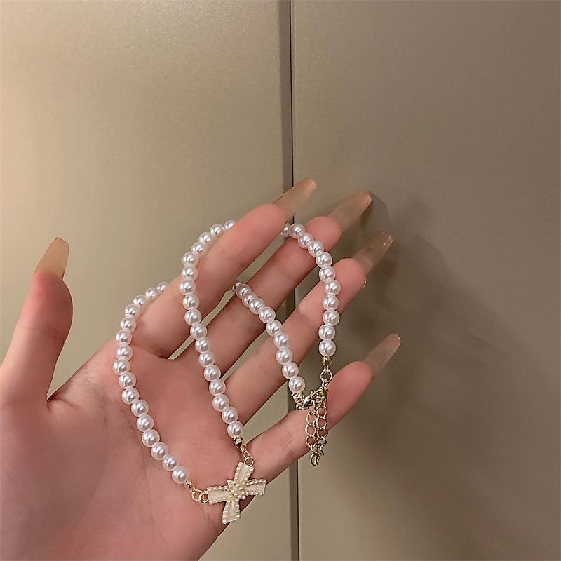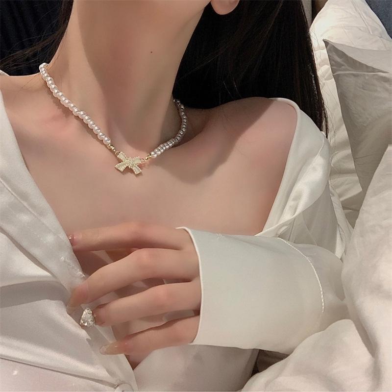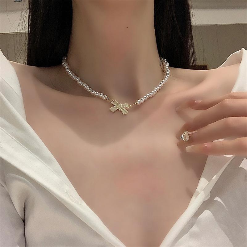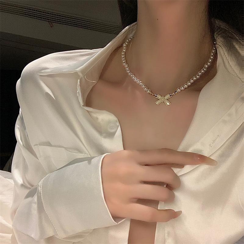 Collar de perlas con lazo para mujer, diseño de nicho, cadena de clavícula de alta calidad, accesorios, cadena para el cuello, moda retro