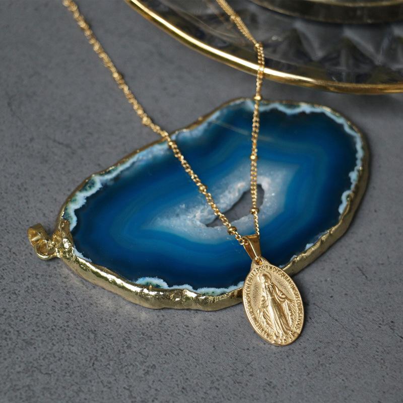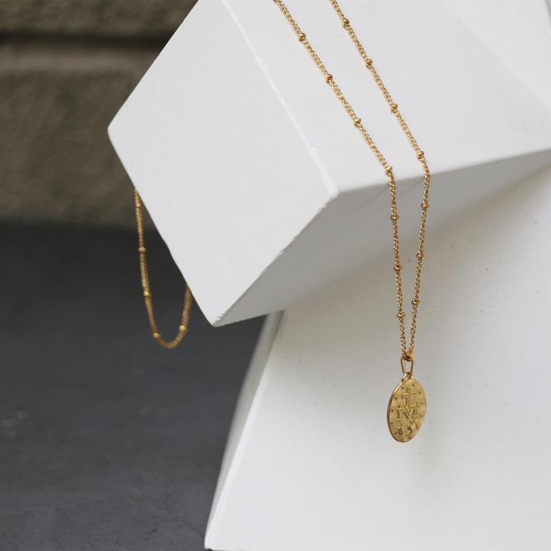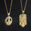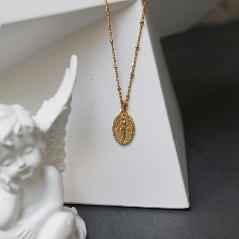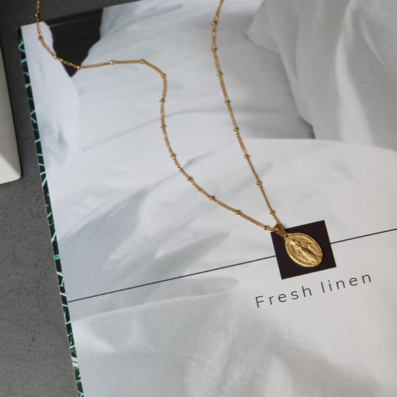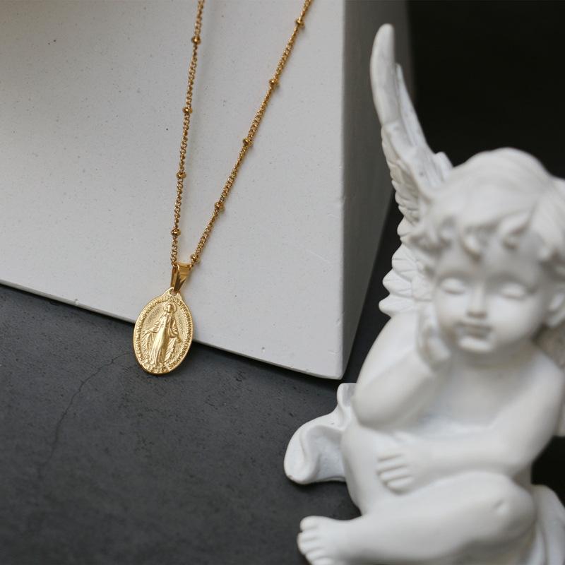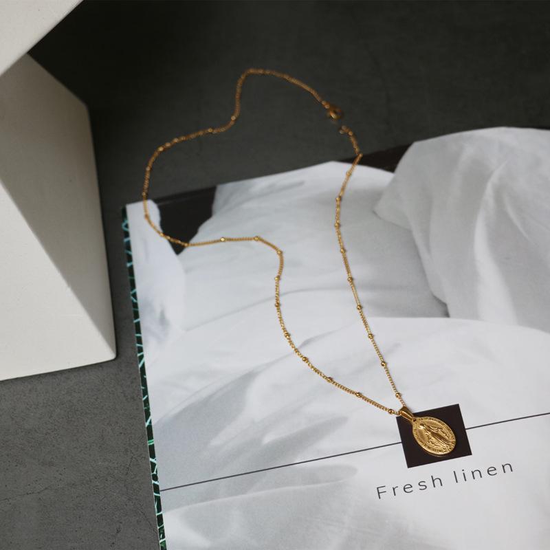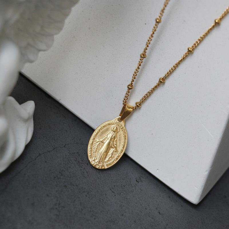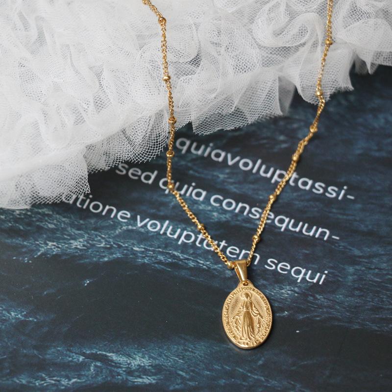 Collar con moneda tótem de doble cara ovalada occidental retro, cadena de clavícula de acero de titanio chapado en oro de 18 quilates, protección para mujer