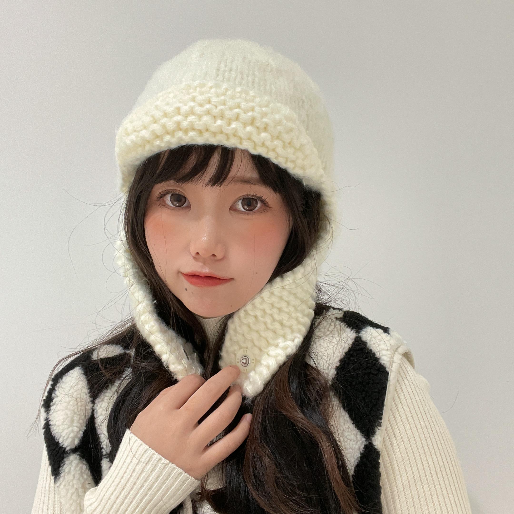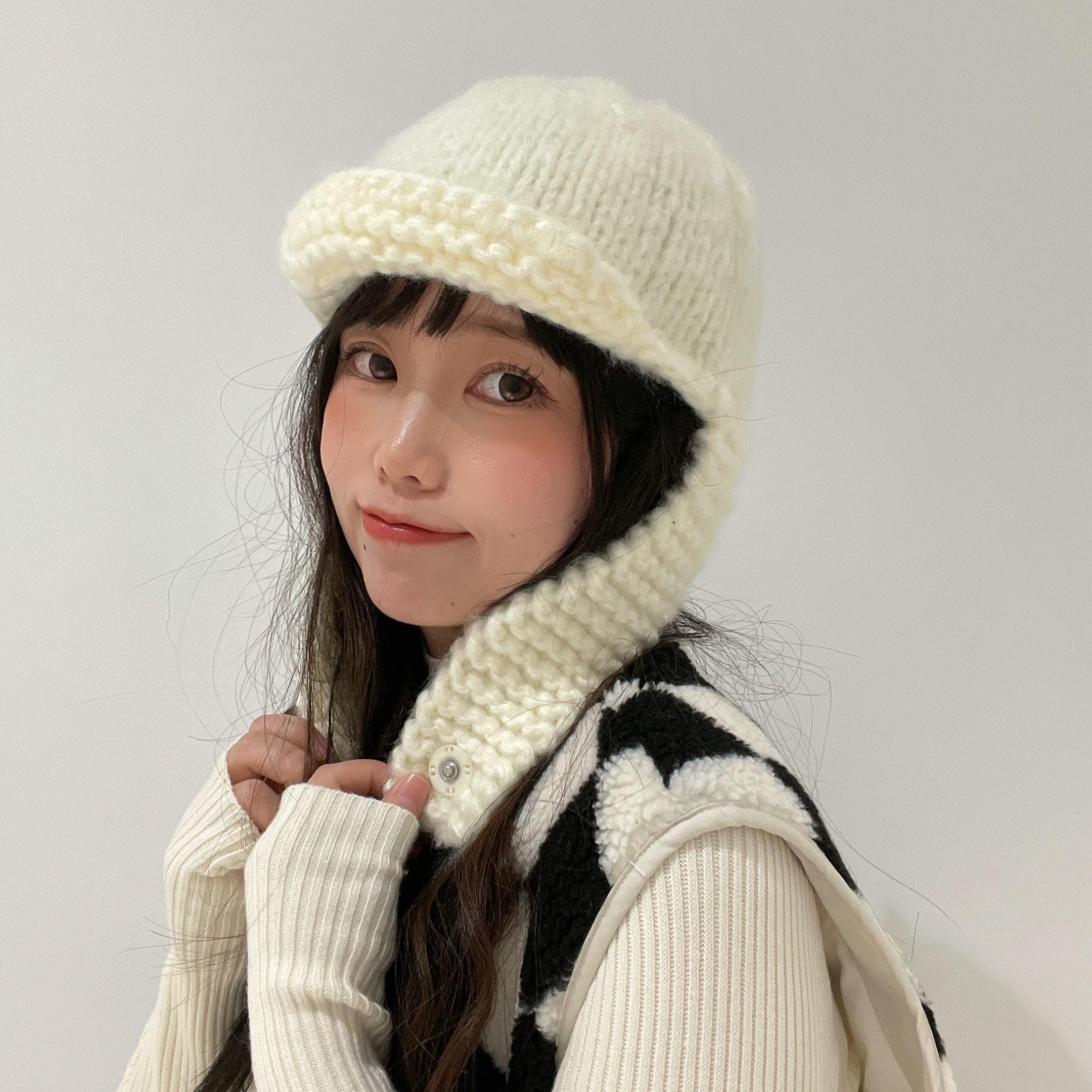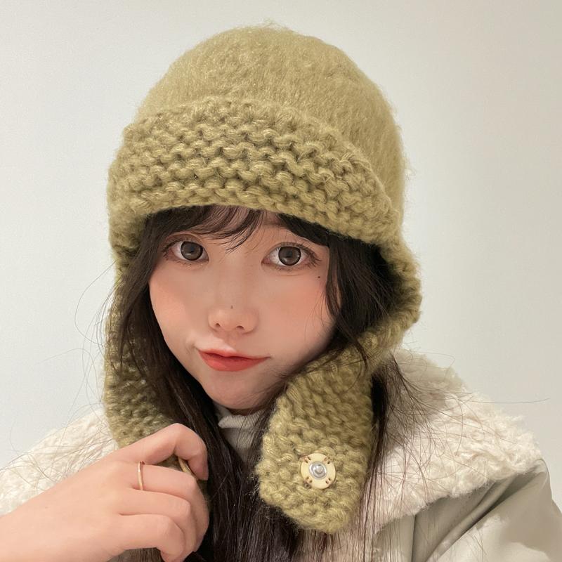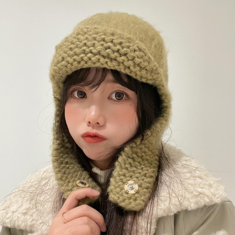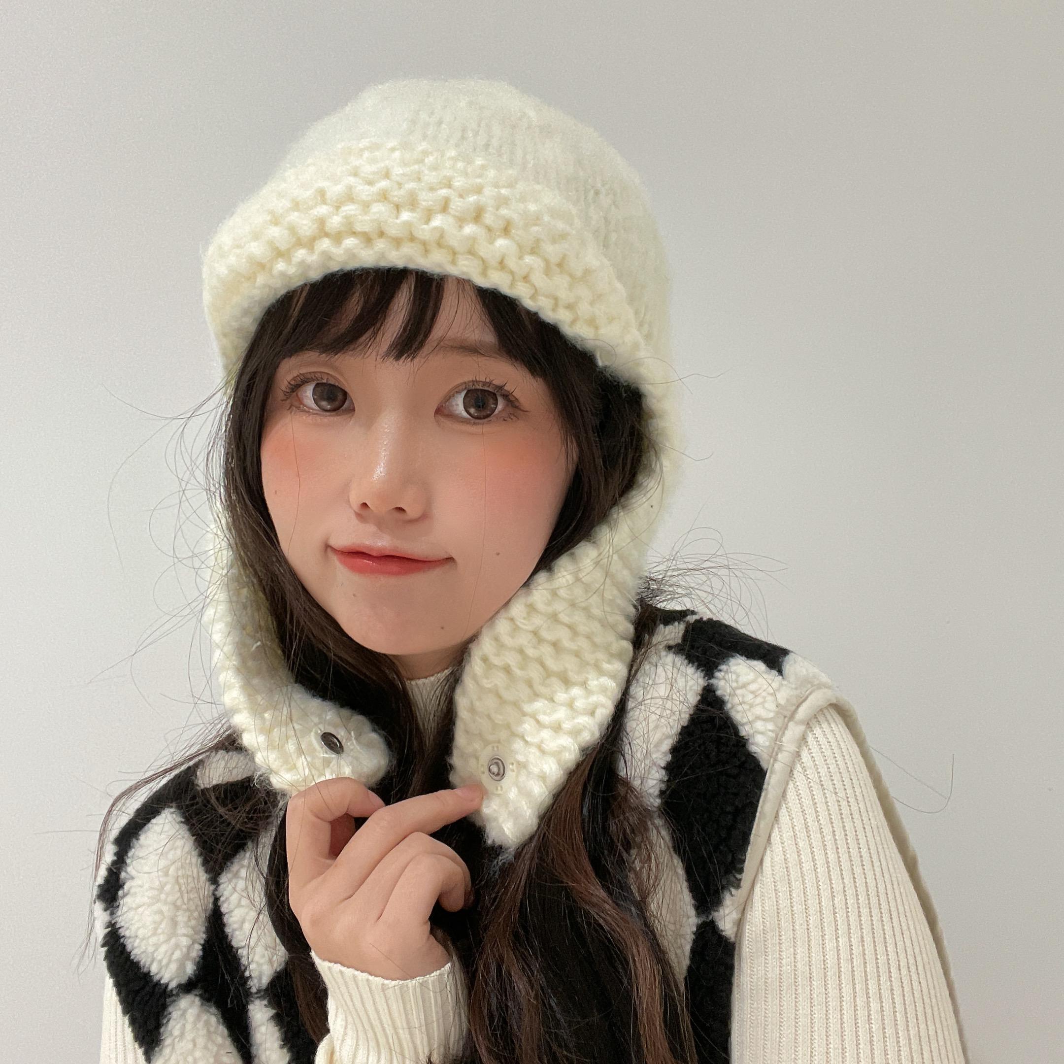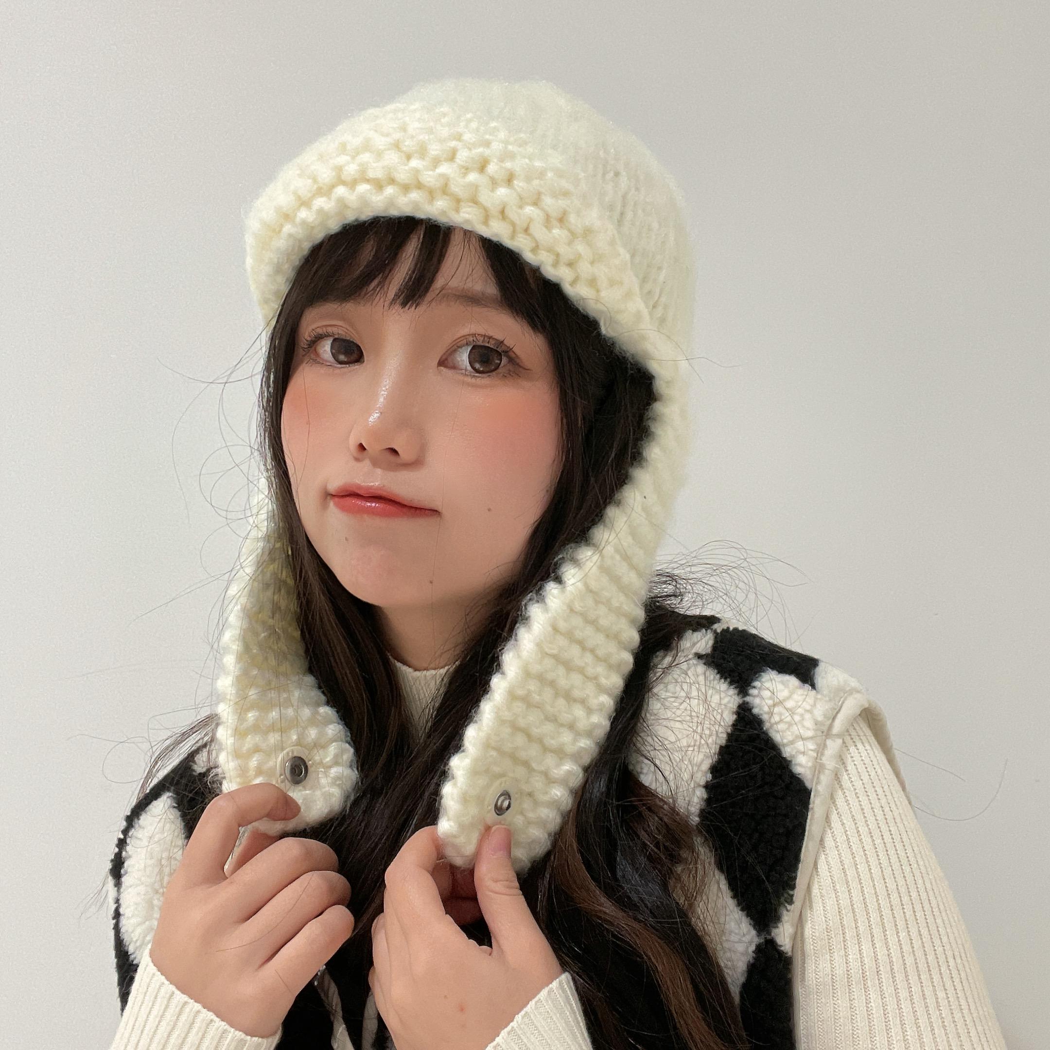 Gorro de Lana Crochet Hecho a Mano Coreano para Mujer con Bufanda Protectora para las Orejas de Una Pieza Retro Tejido Gorro de Punta Invierno Cálido Sombrero Volador